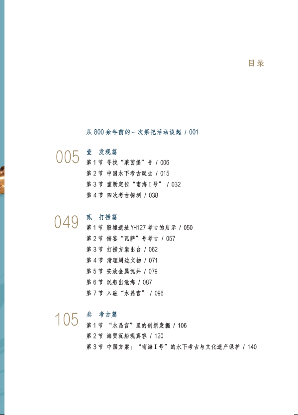 图书以“南海I号”的发现、打捞、考古和出水文物、海贸研究为主线,为读者呈现了一个具有中国特色、中国风格、中国气派的考古学案例,充分反映出“中国水下考古”为世界水下考古技术发展和水下文化遗产保护贡献的中国智慧、中国方案。实施整体打捞“南海I号”的“华天龙号”起重船,也展示了我国高水平科技自立自强的良好形象。
