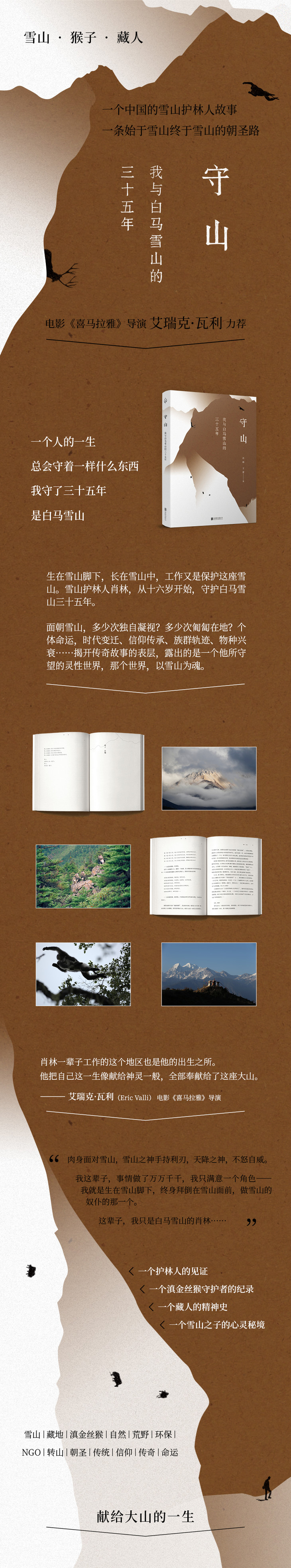 在白马雪山,守护滇金丝猴,守护野外生灵;也是在这座雪山,他遇见众生,体悟灵性,心魂交付。白马雪山,是家乡,是传奇,是信仰,是一个平凡的护林人的一辈子。
