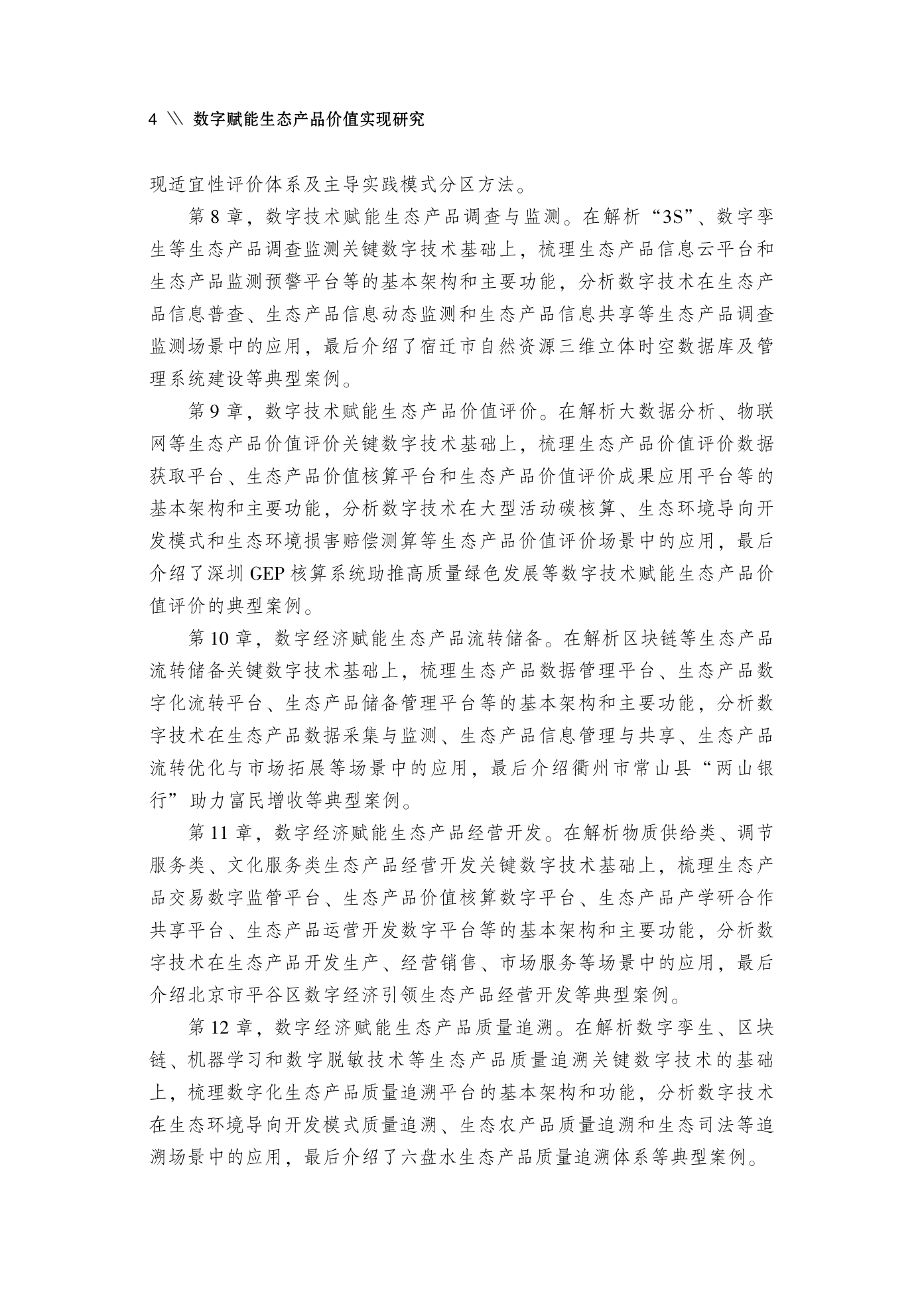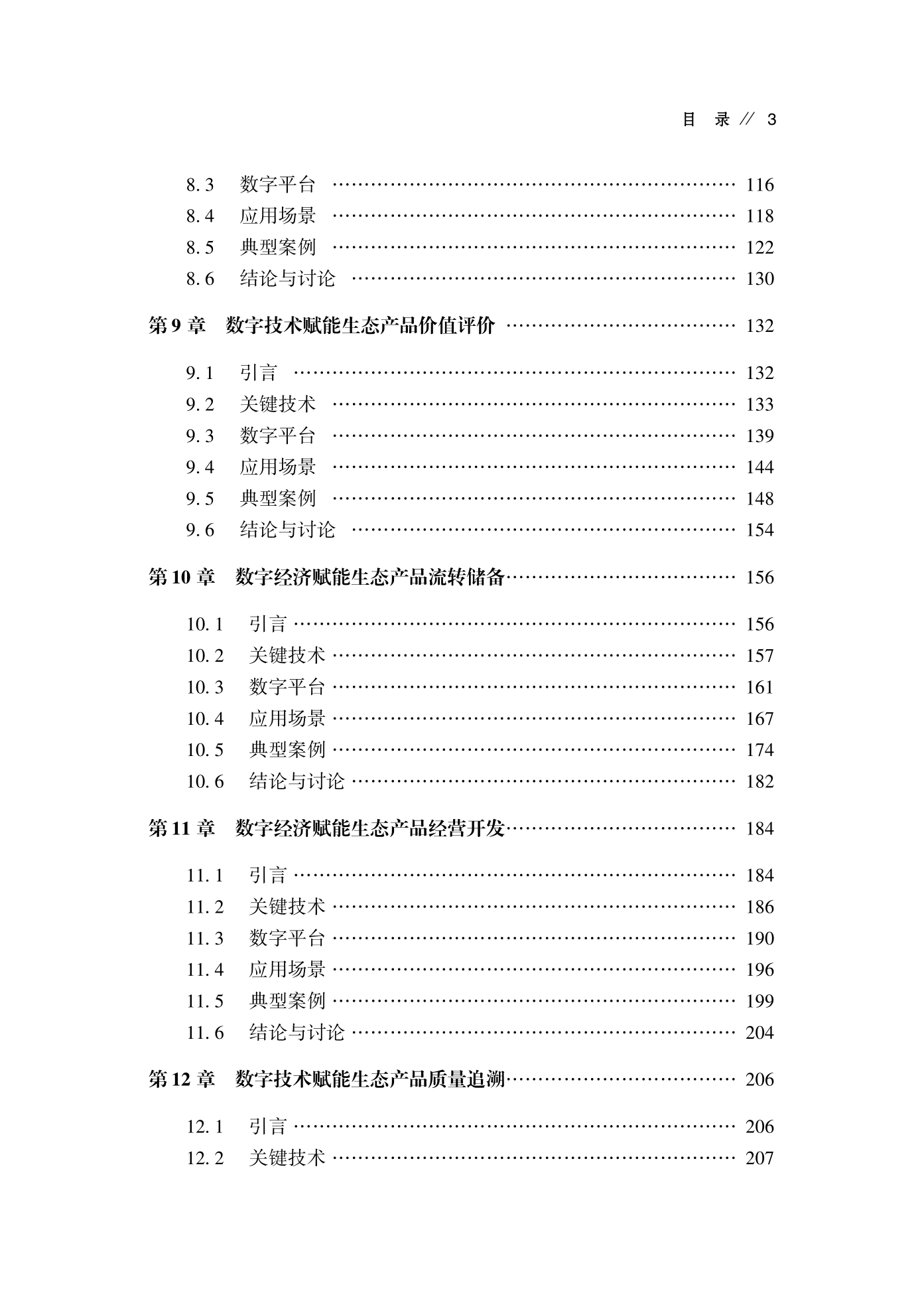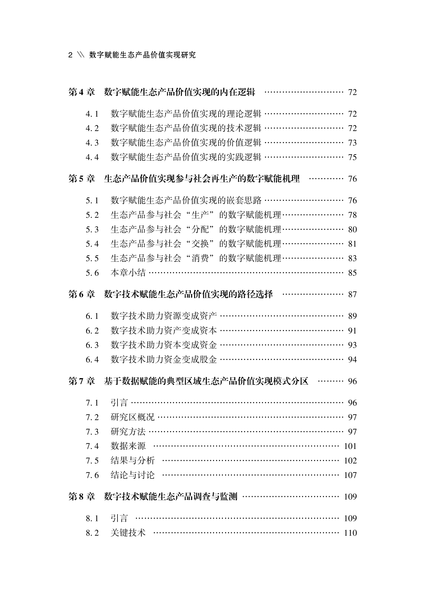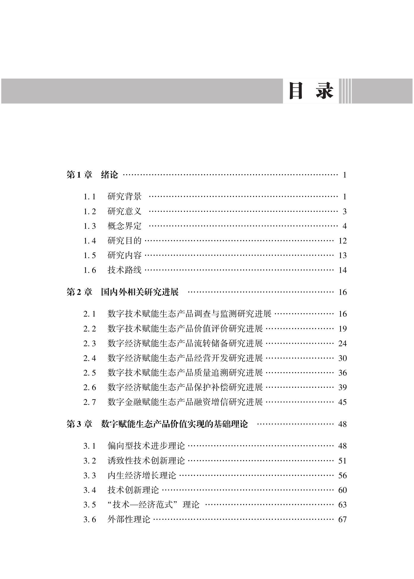 本书在系统梳理数字经济赋能生态产品价值实现的国内外相关研究进展、理论基础和逻辑辨析基础上,阐释数字赋能生态产品价值实现的路径选择、模式分区和赋能机理,解析数字赋能生态产品调查监测、价值评价、流转储备、经营开发、质量追溯、保护补偿、融资增信的关键技术、数字平台、应用场景和典型案例。