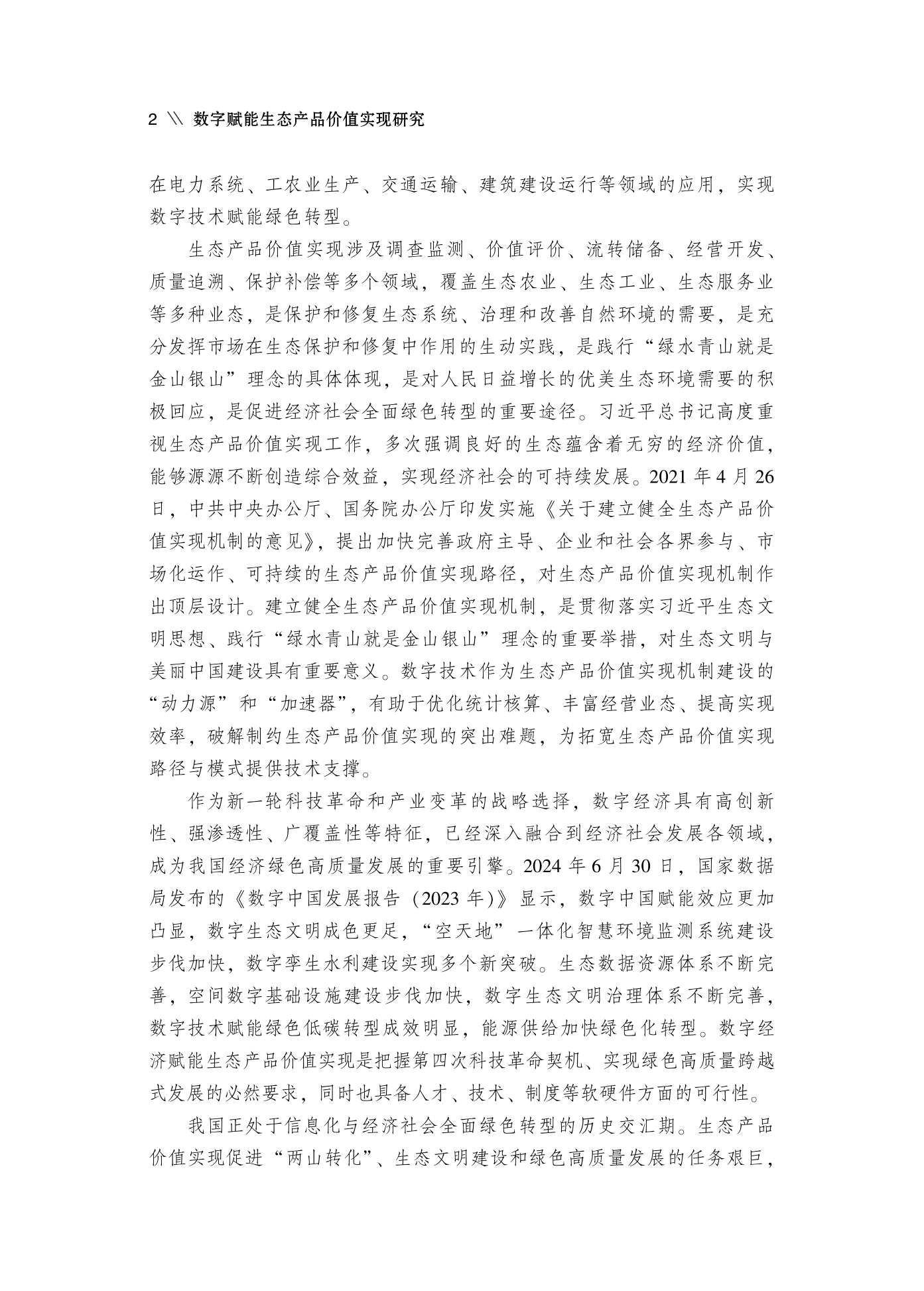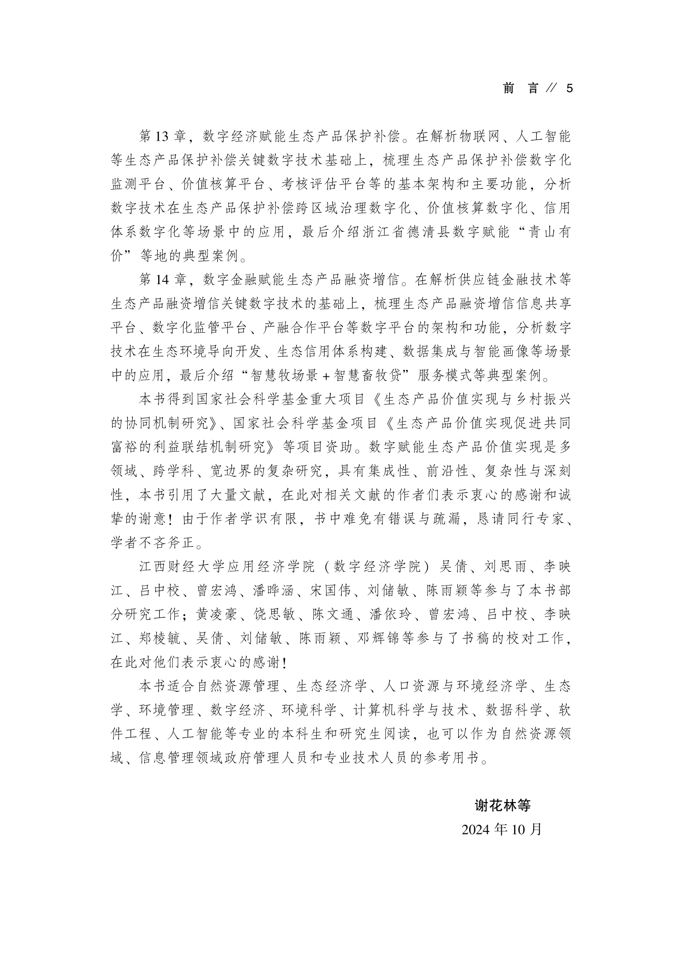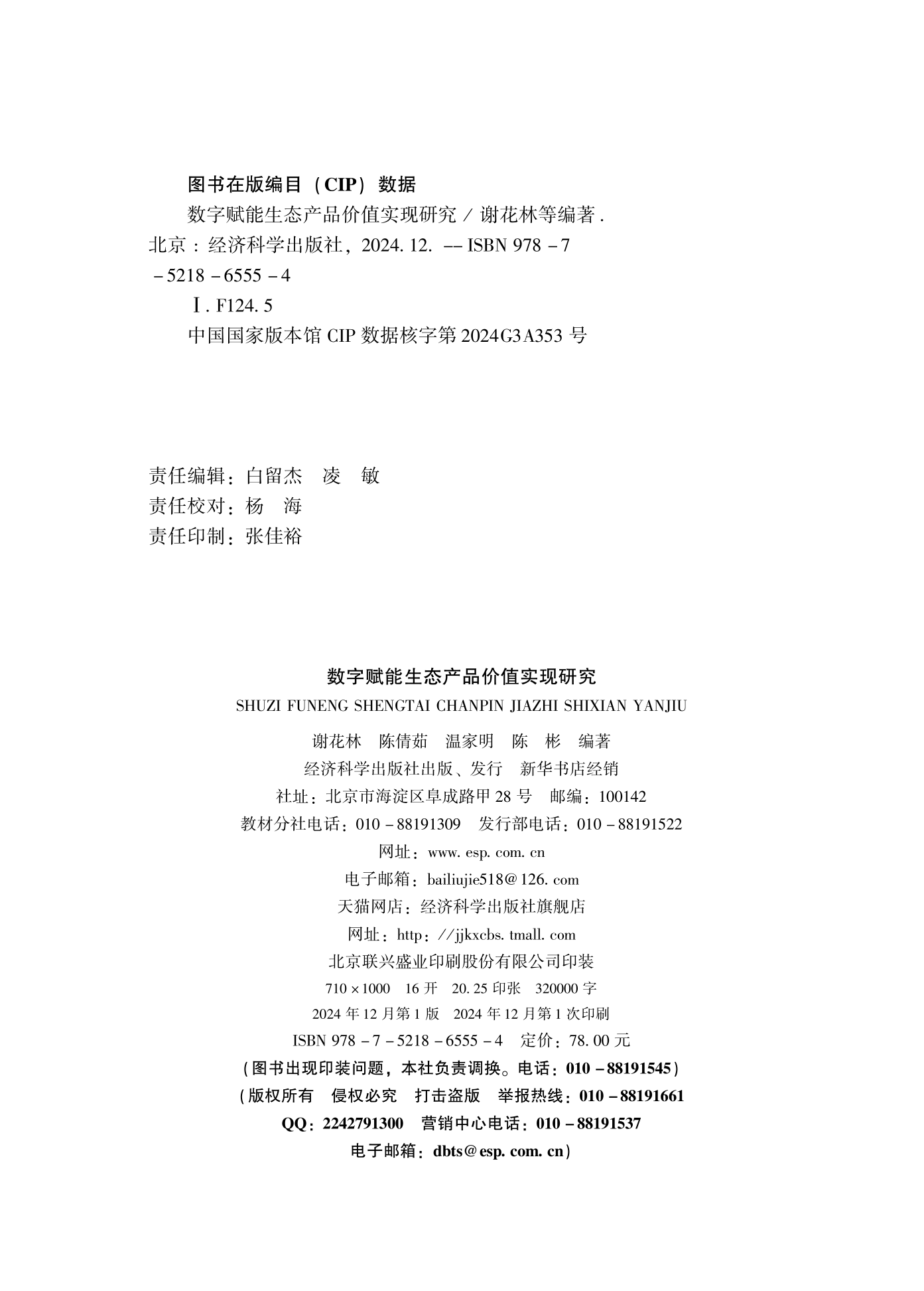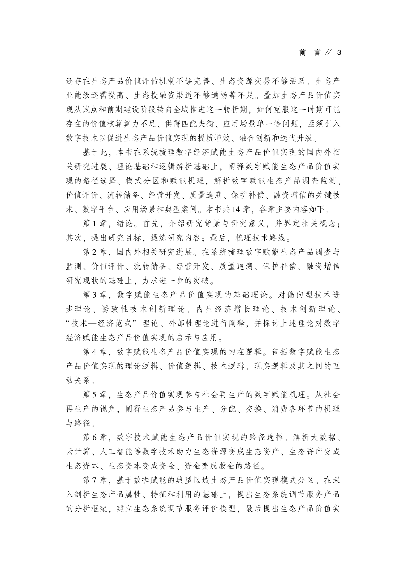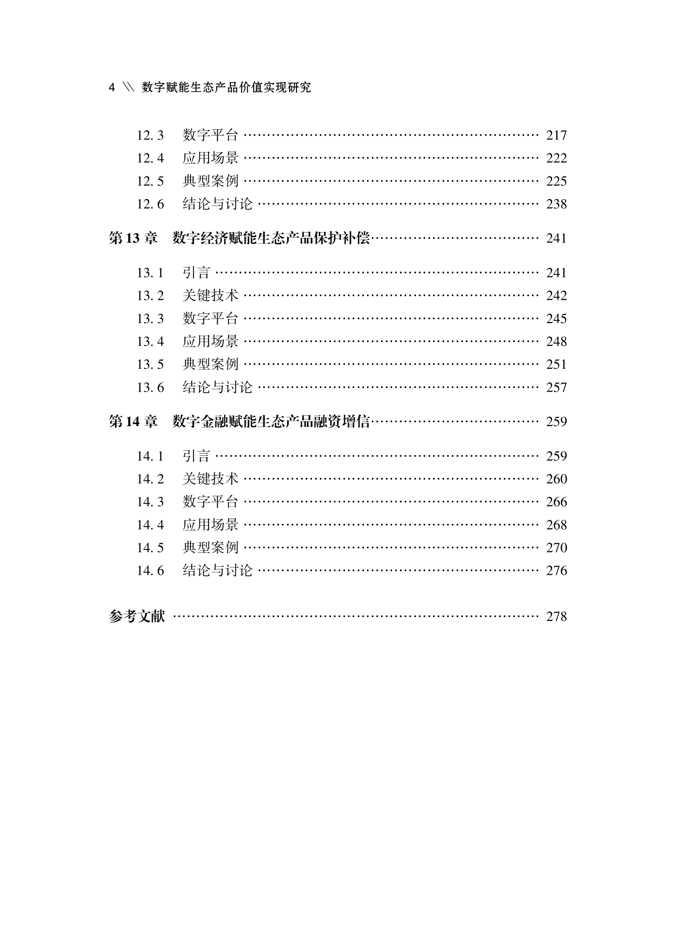 本书在系统梳理数字经济赋能生态产品价值实现的国内外相关研究进展、理论基础和逻辑辨析基础上,阐释数字赋能生态产品价值实现的路径选择、模式分区和赋能机理,解析数字赋能生态产品调查监测、价值评价、流转储备、经营开发、质量追溯、保护补偿、融资增信的关键技术、数字平台、应用场景和典型案例。