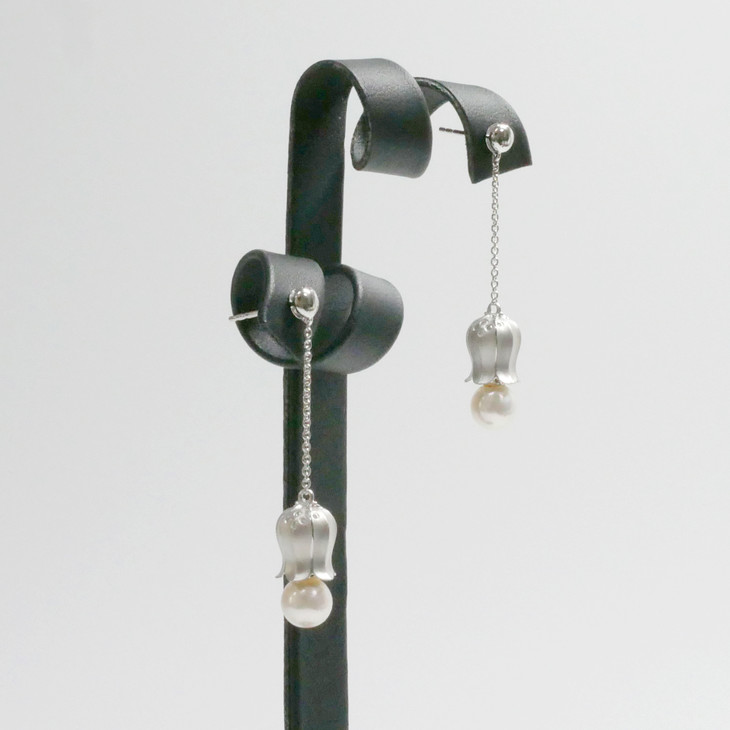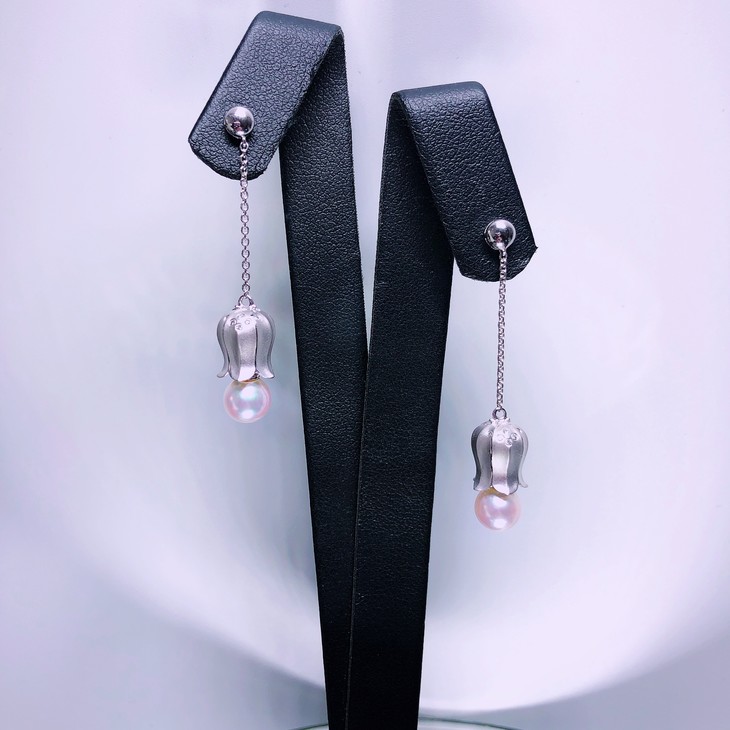 这对铃兰耳环的特别之处,在于珍珠上端,有18K金做成的铃心,配戴时随头部的摆动会碰撞出细碎的铃声。铃上镶嵌的小钻与铃下的Akoya 珍珠相呼应。是一件形态,声音,珠光,颜色具佳的"小而美",是耳边的清新铃声,适合日常佩戴。
