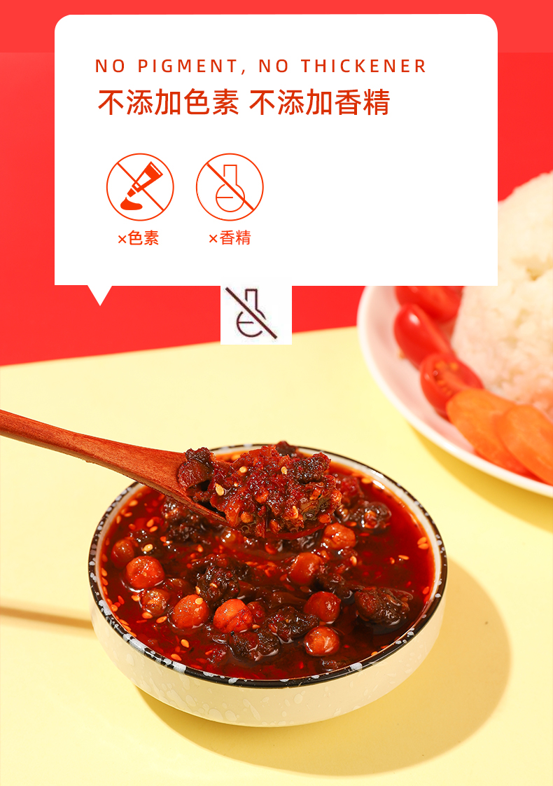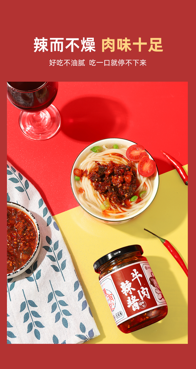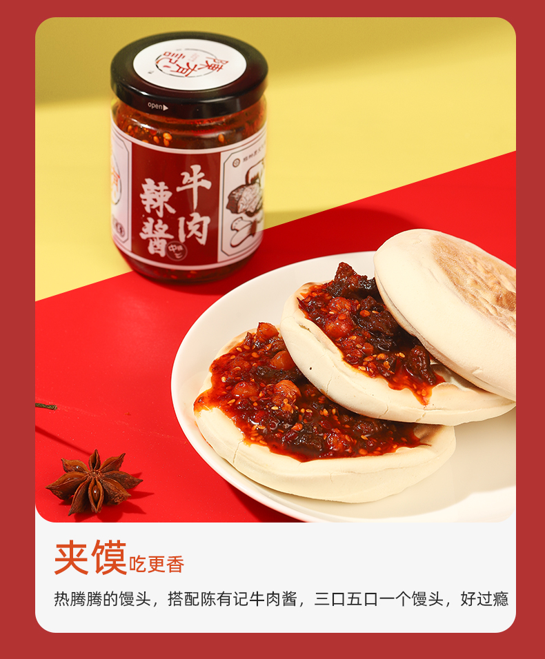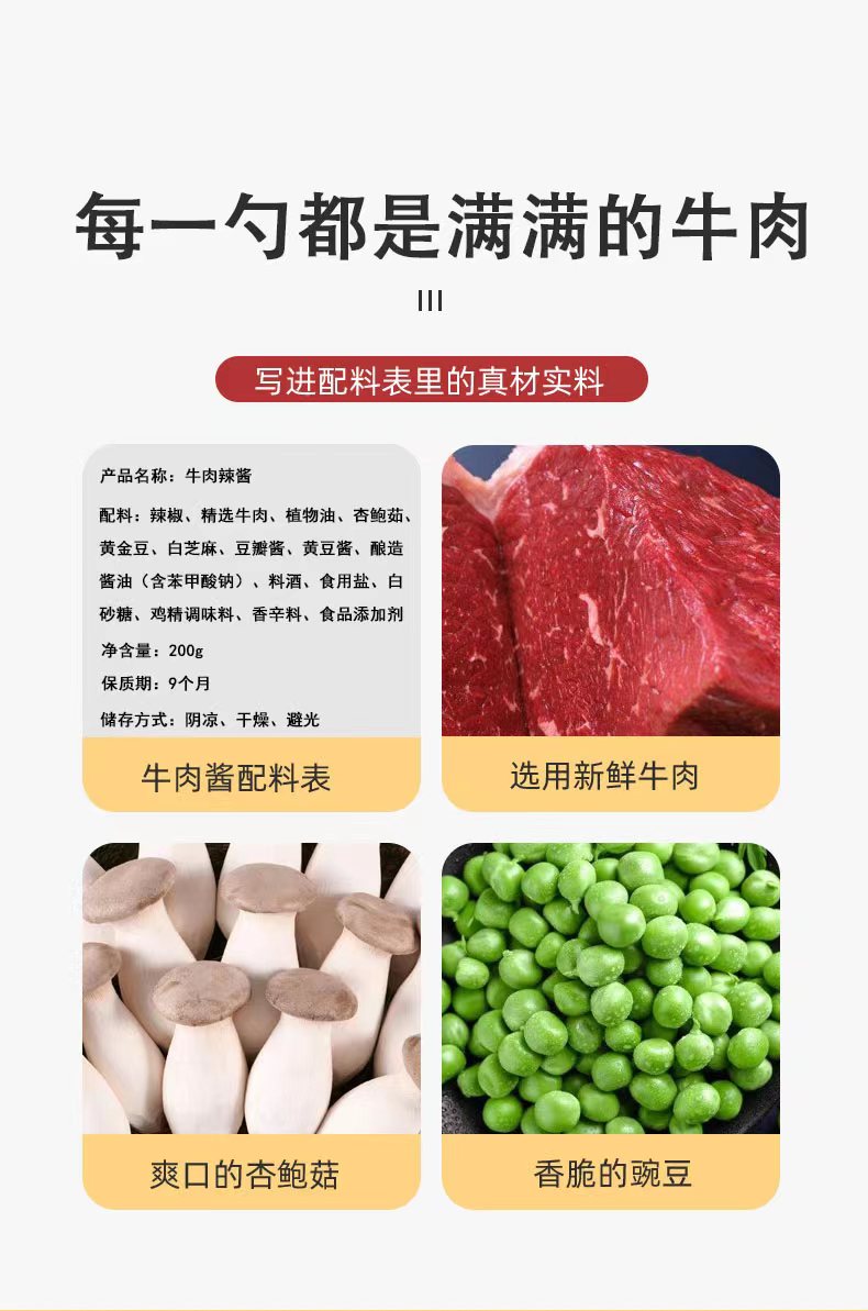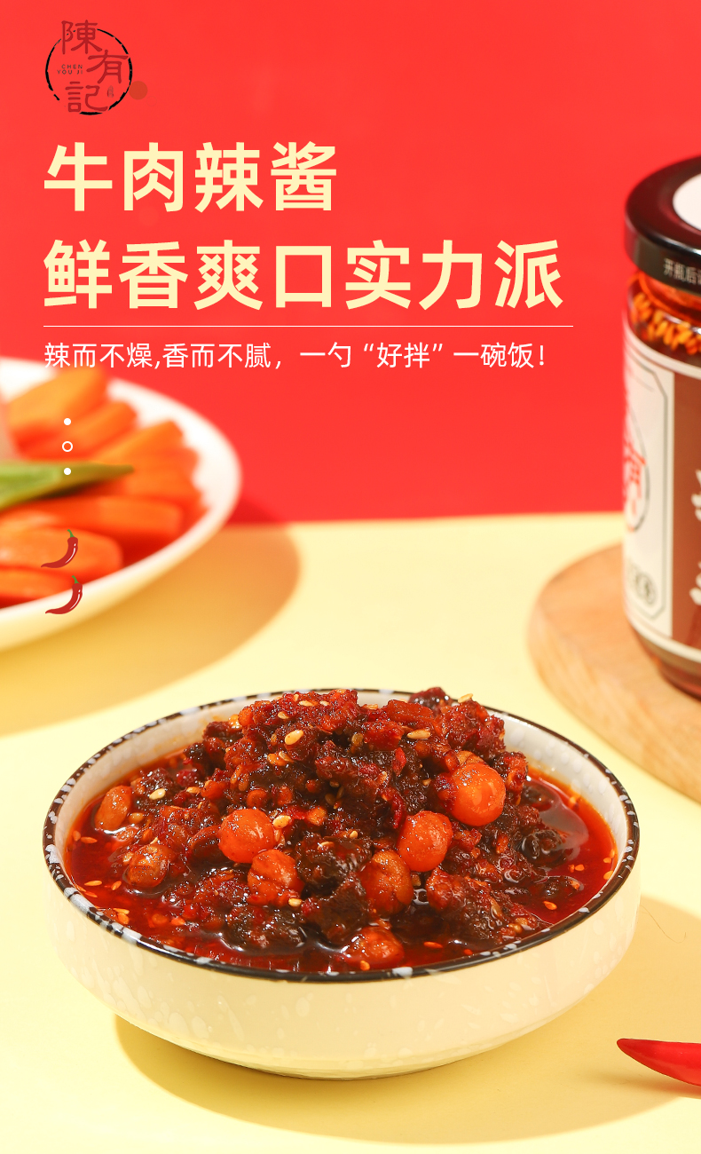 陈有记牛肉辣酱200g/瓶,含50%牛肉,牛肉带有嚼劲,配上杏鲍茹的爽口和豌豆的香脆,拌饭拌面拌粉最适合