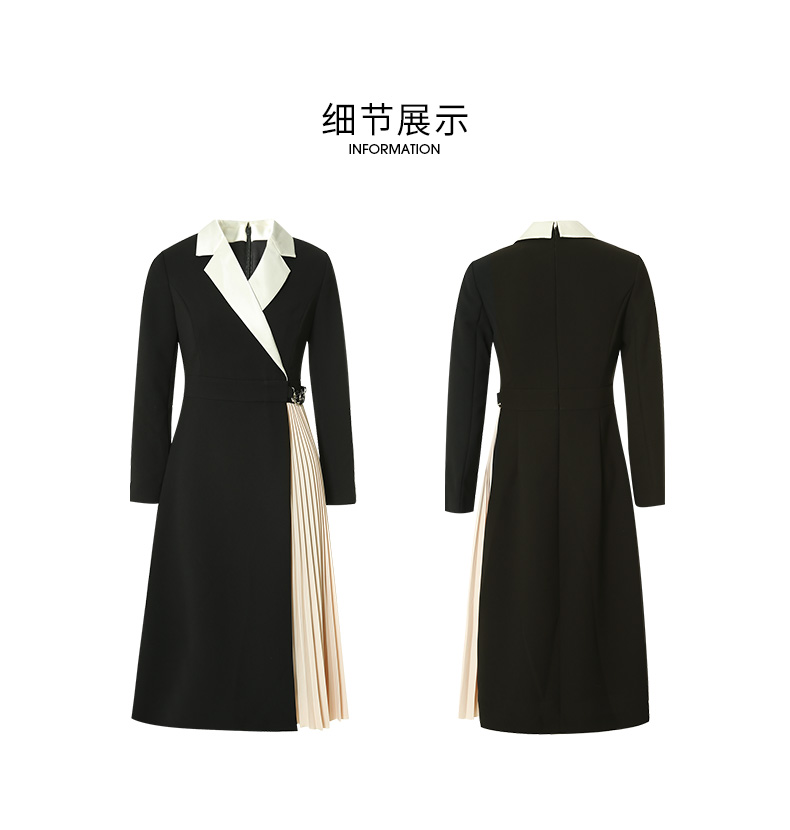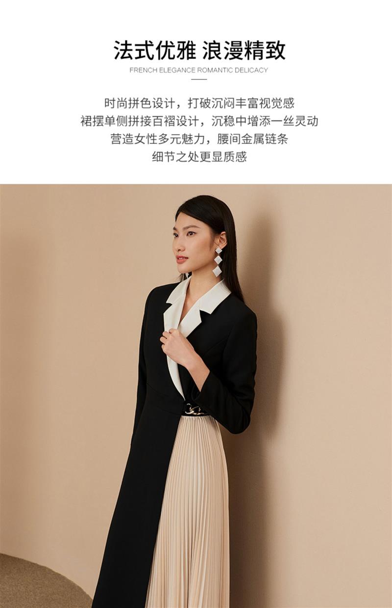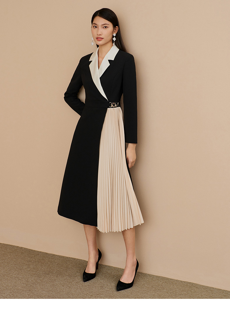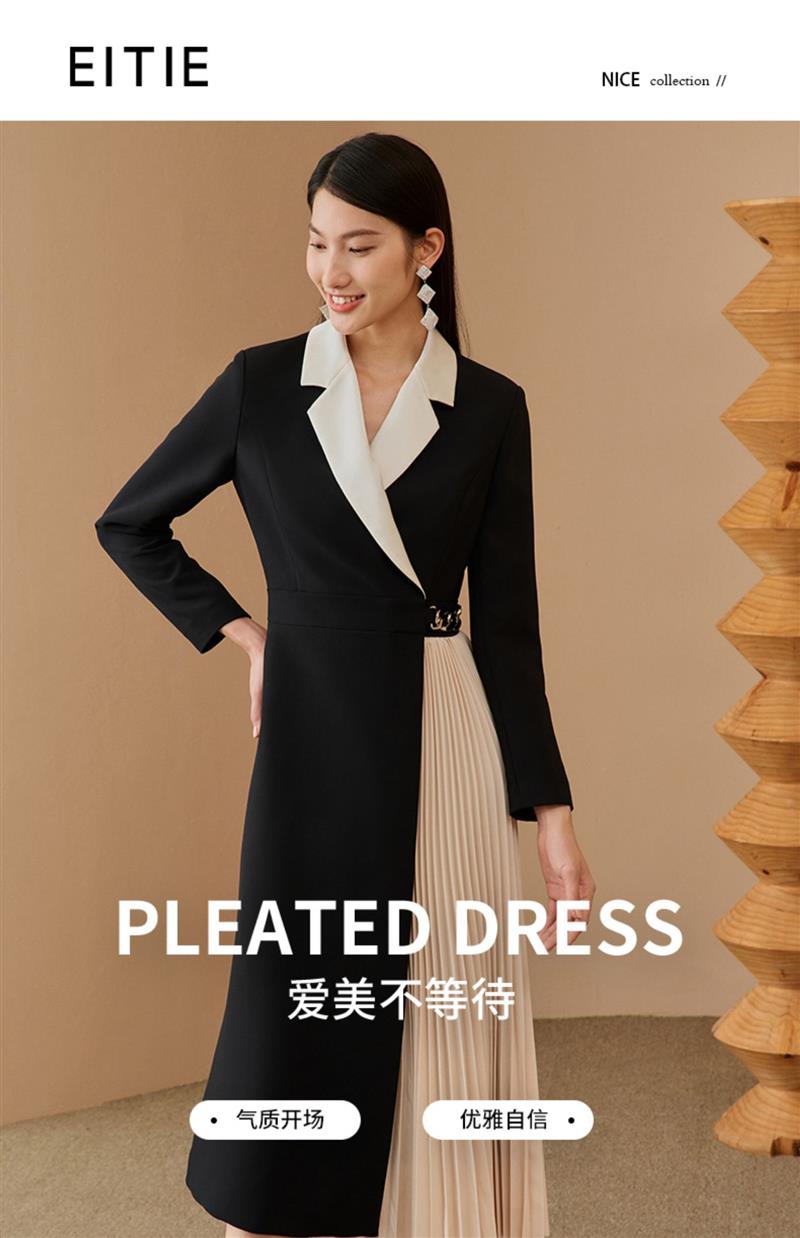 EITIE爱特爱冬新款时尚OL撞色西装领百褶连衣裙收腰显瘦优雅C2207048