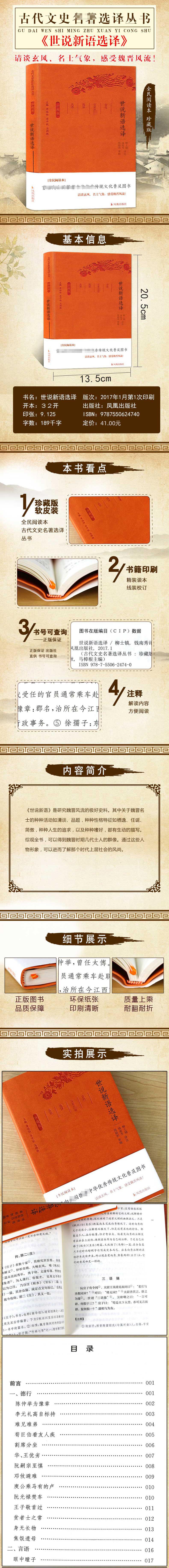 魏晋时期,盛行玄学清谈之风,《世说新语》就是对它的记录和保留,我们得以从中了解魏晋清谈之风和魏晋名士的风貌。本书为《古代文史名著选译丛书(珍藏版)》之一,以袁褧嘉趣堂本为底本,参照唐写本、王先谦思贤讲舍校订本等,柳士镇教授、钱南秀教授择取精华篇章进行了译注,收录了《德行》《言语》《政事》等三十六个门类。