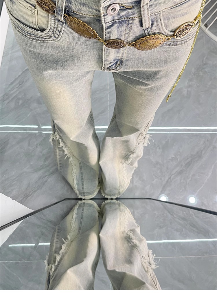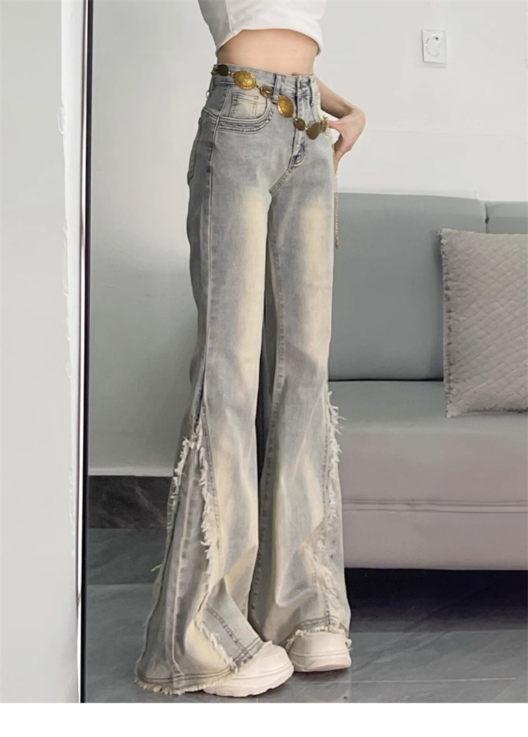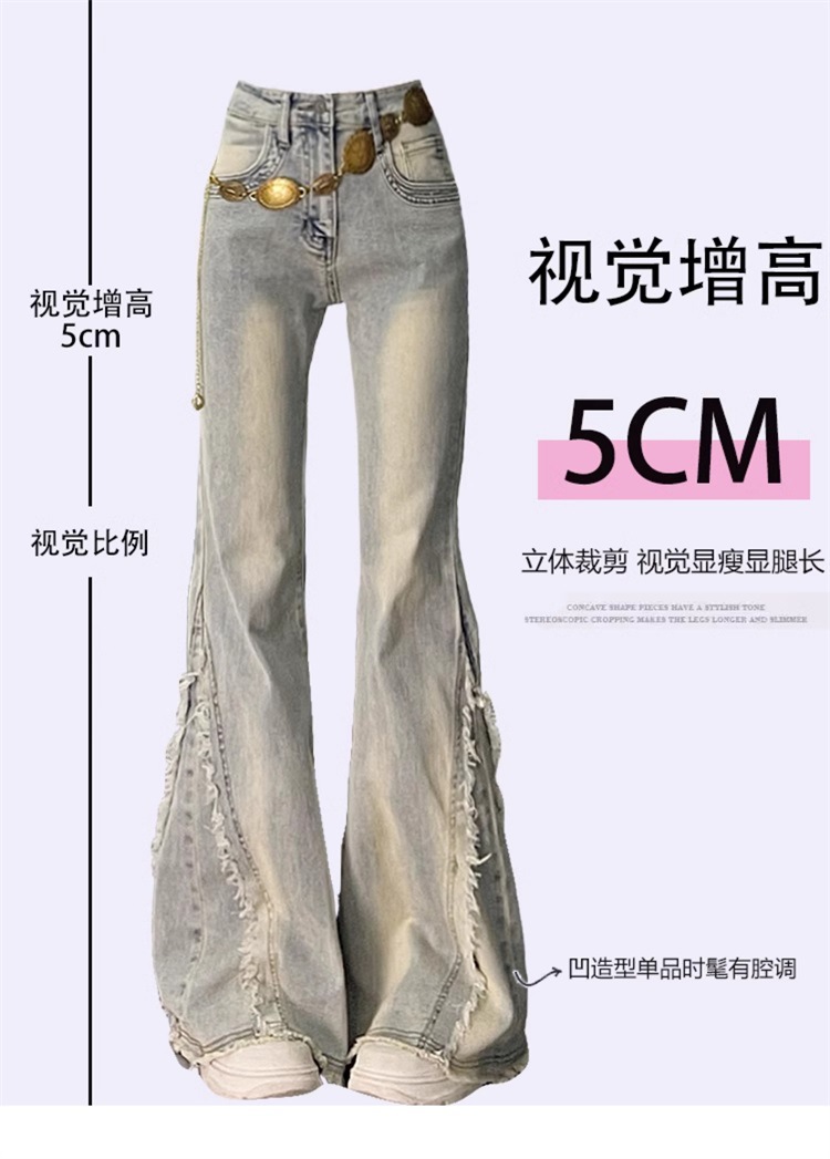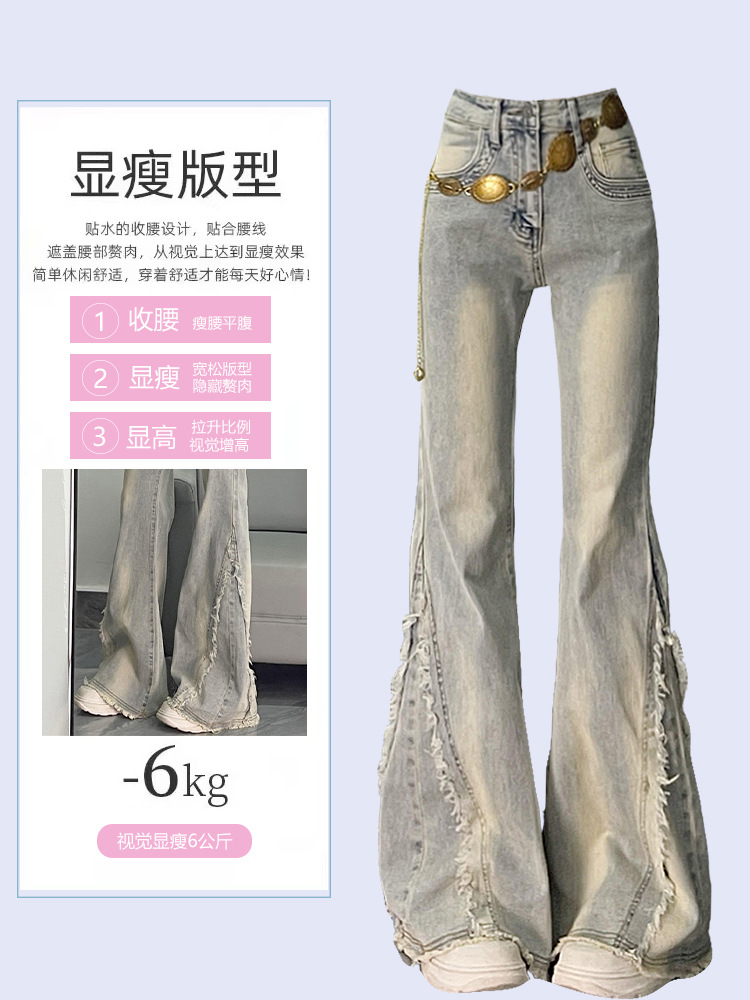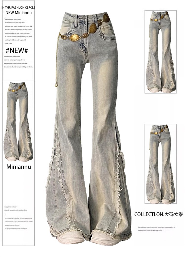 【立体裁剪显瘦、收腰贴合腰线】大码女装毛边设计感水洗做旧牛仔裤女胖mm高街辣妹女裤学生喇叭裤.TA