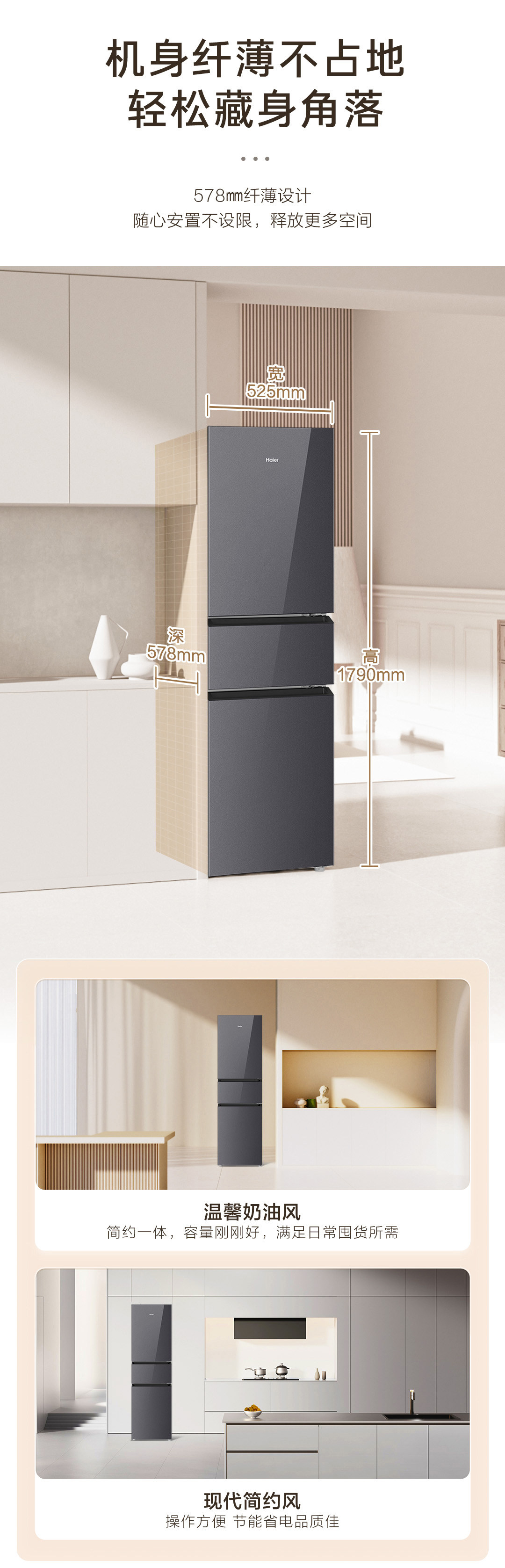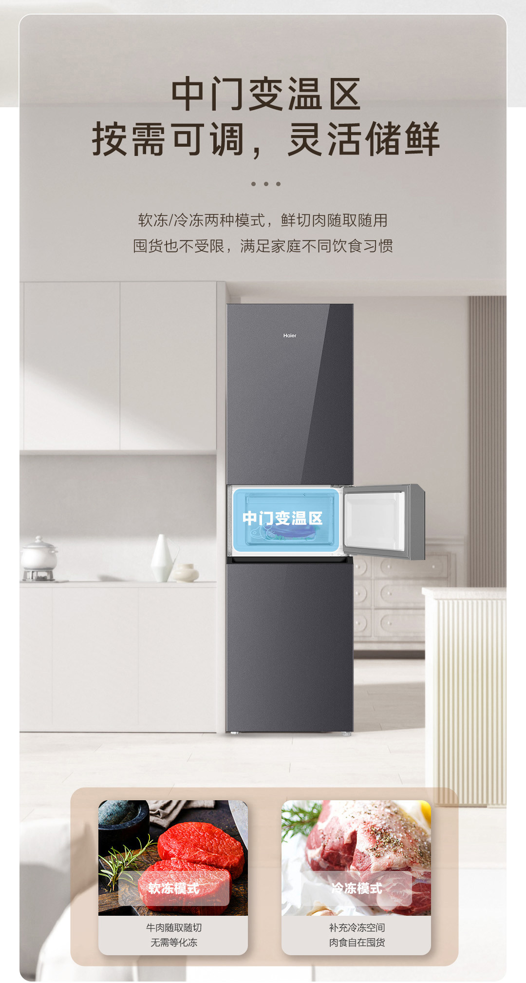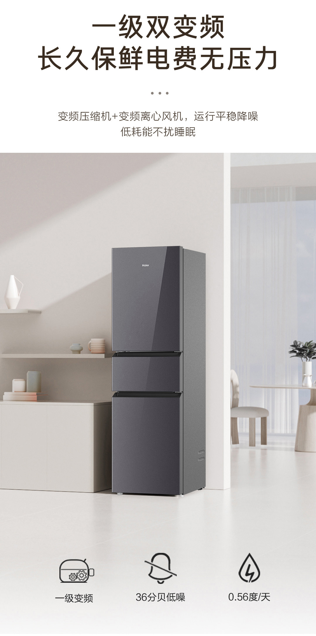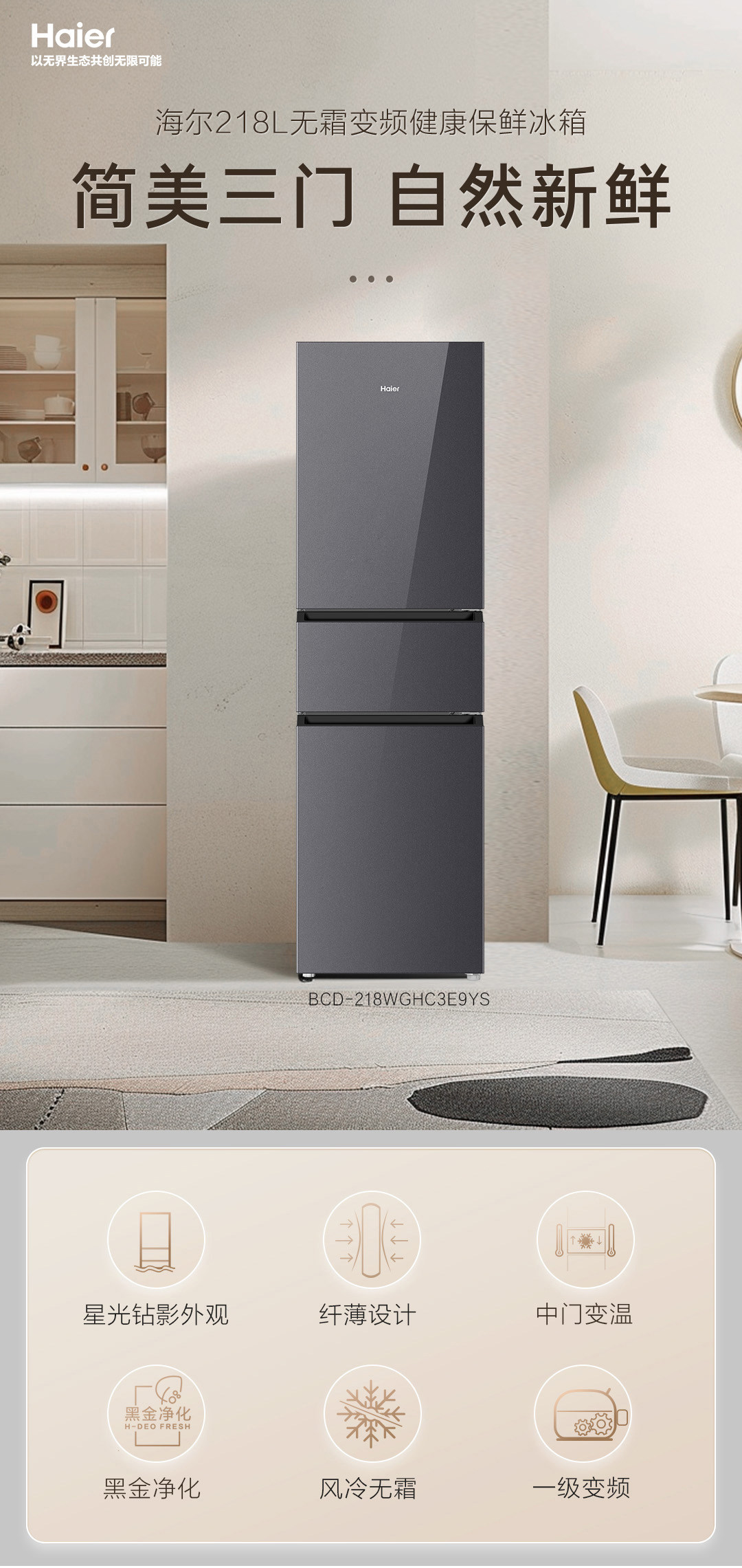 海尔(Haier)BCD-218WGHC3E9YS冰箱218L三门玻璃门新一级能效双变频三开门风冷黑金净化软冷冻家用冰箱大容量