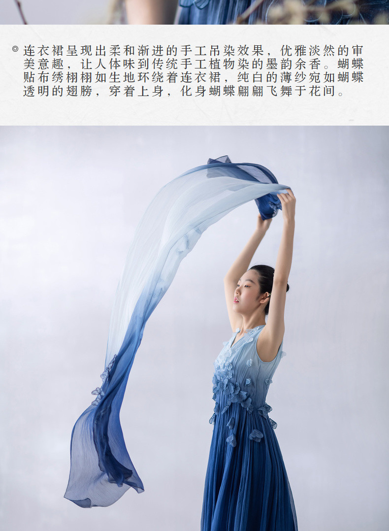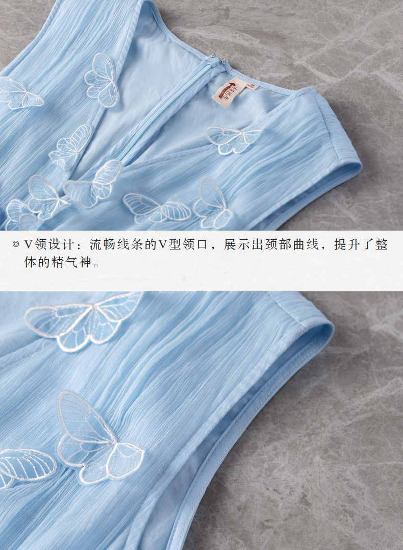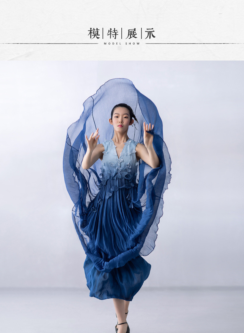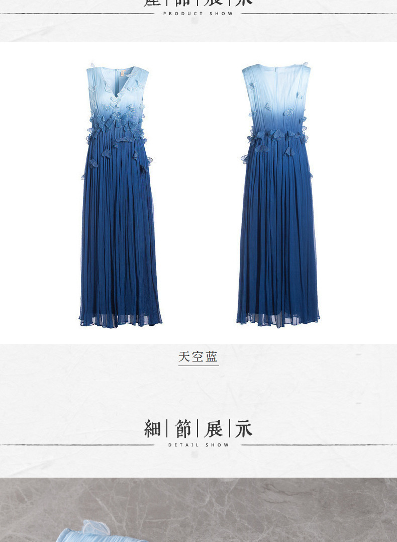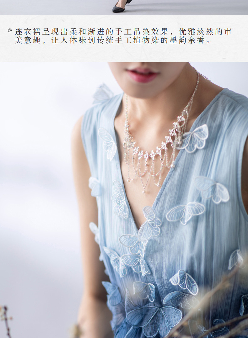 【林栖设计小店】【现货】蝴蝶女装新品天空蓝V领无袖真丝桑蚕丝植物染蓝染中长款连衣裙1902361-1961062