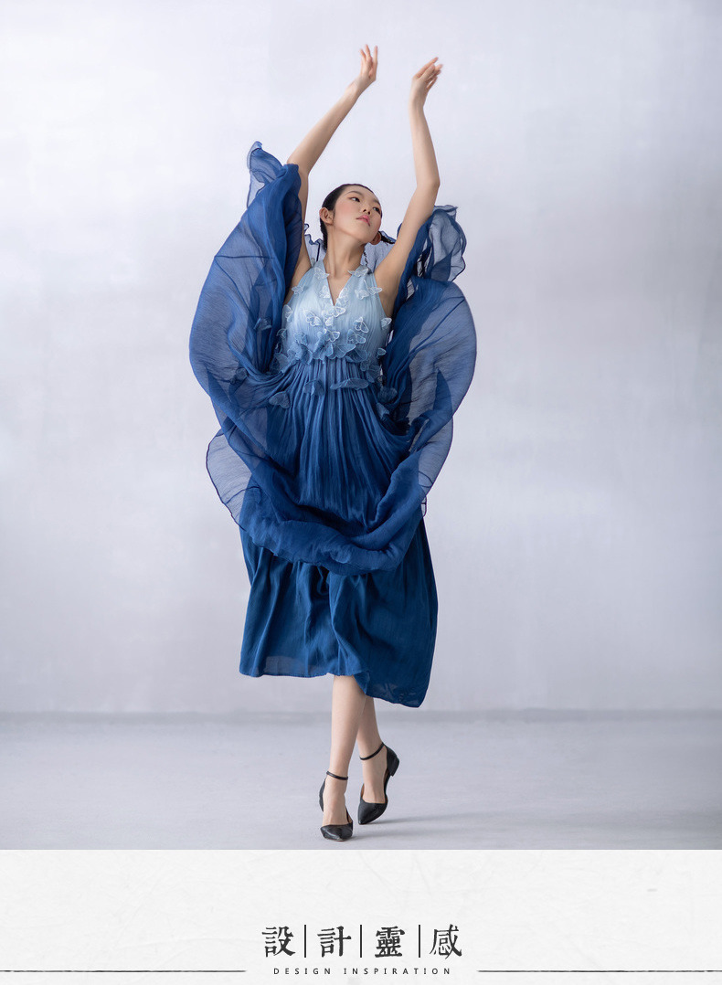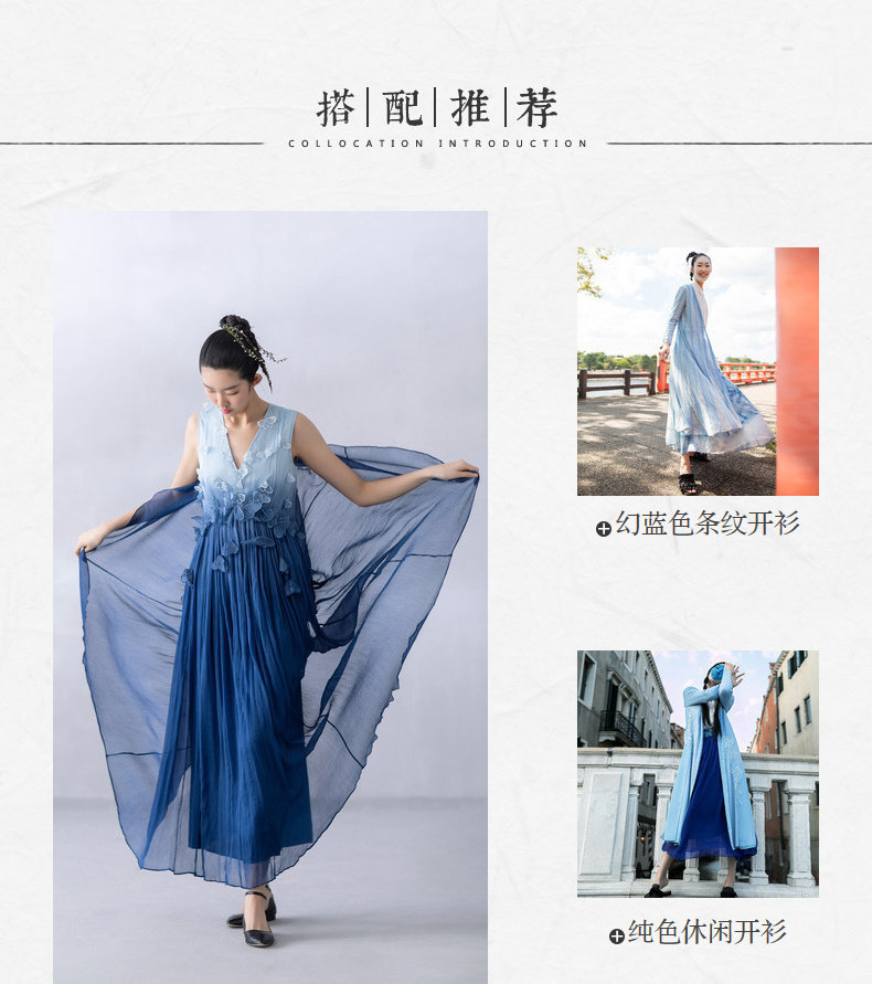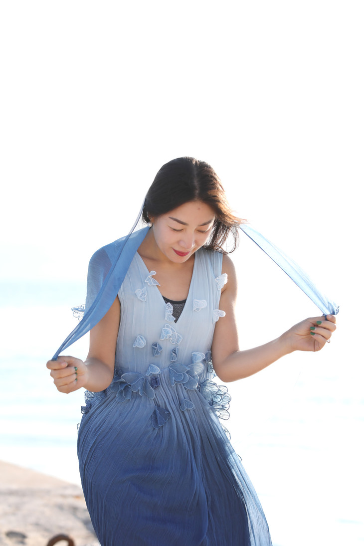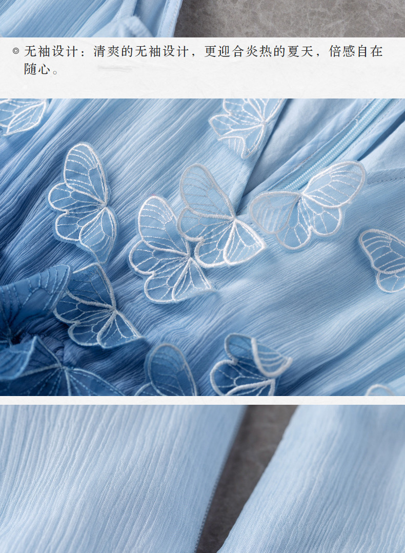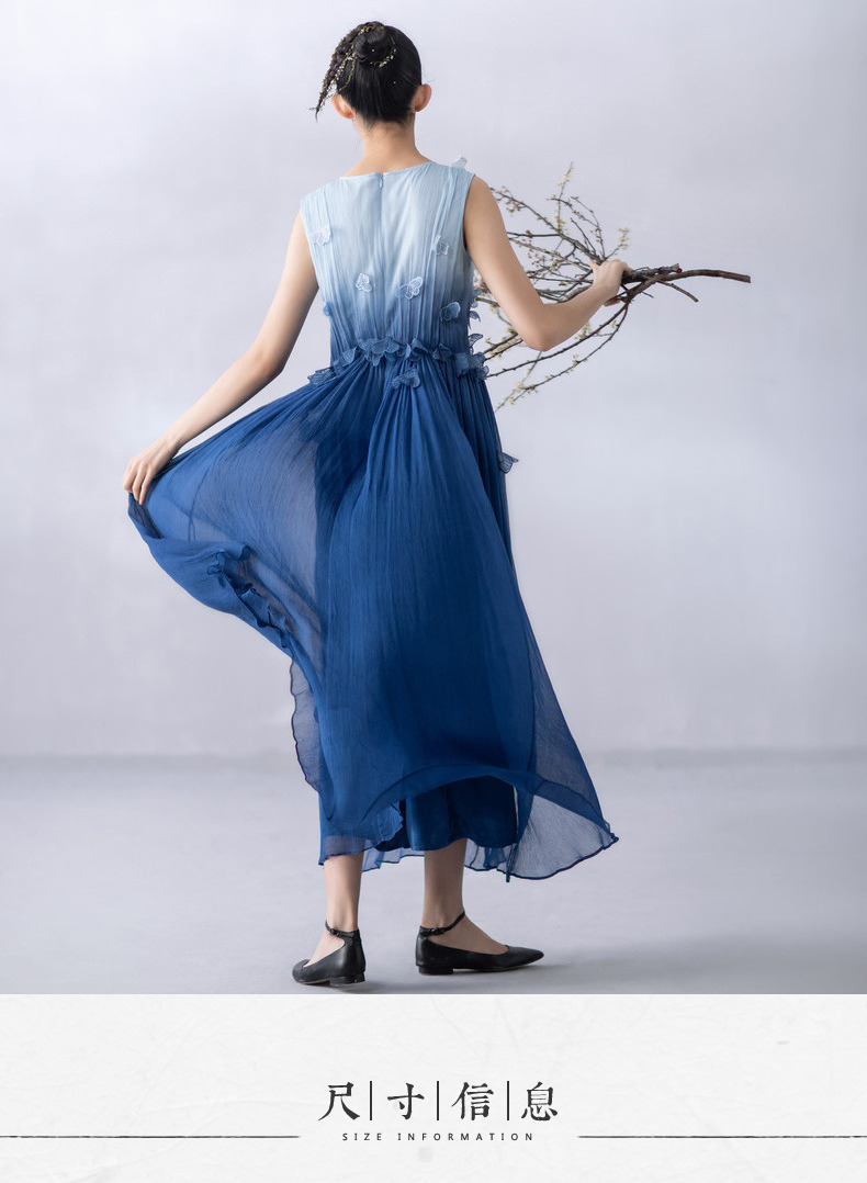 【林栖设计小店】【现货】蝴蝶女装新品天空蓝V领无袖真丝桑蚕丝植物染蓝染中长款连衣裙1902361-1961062