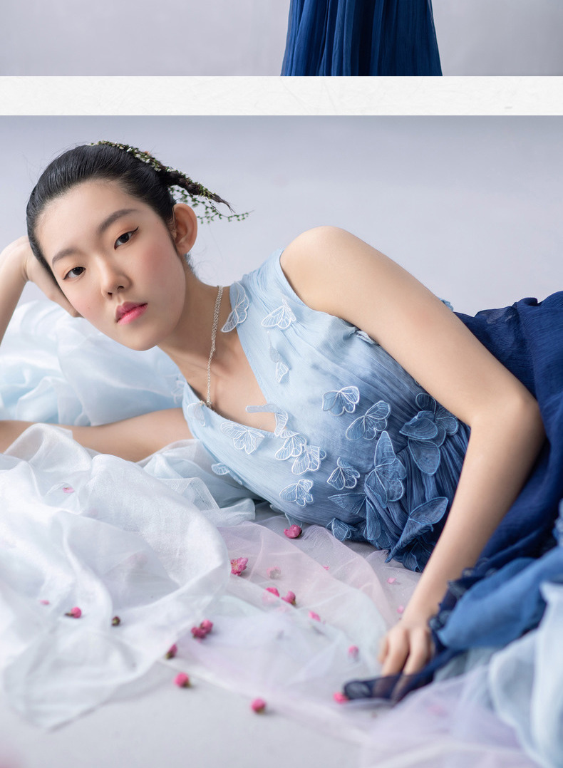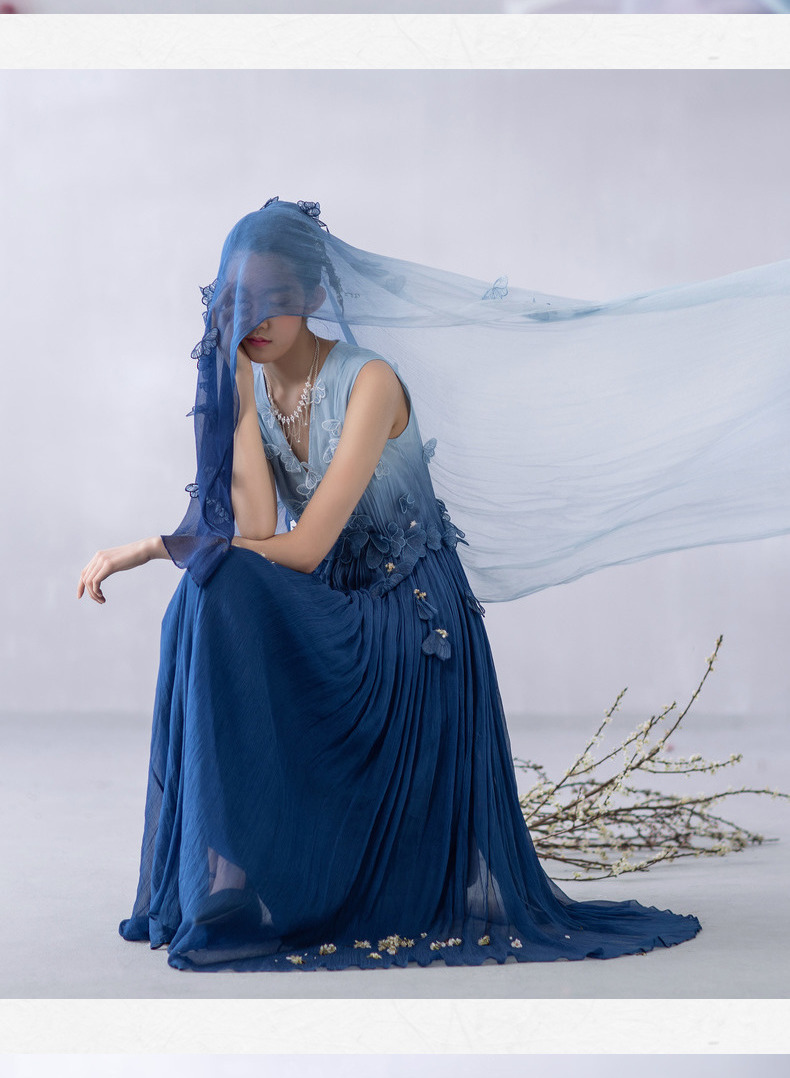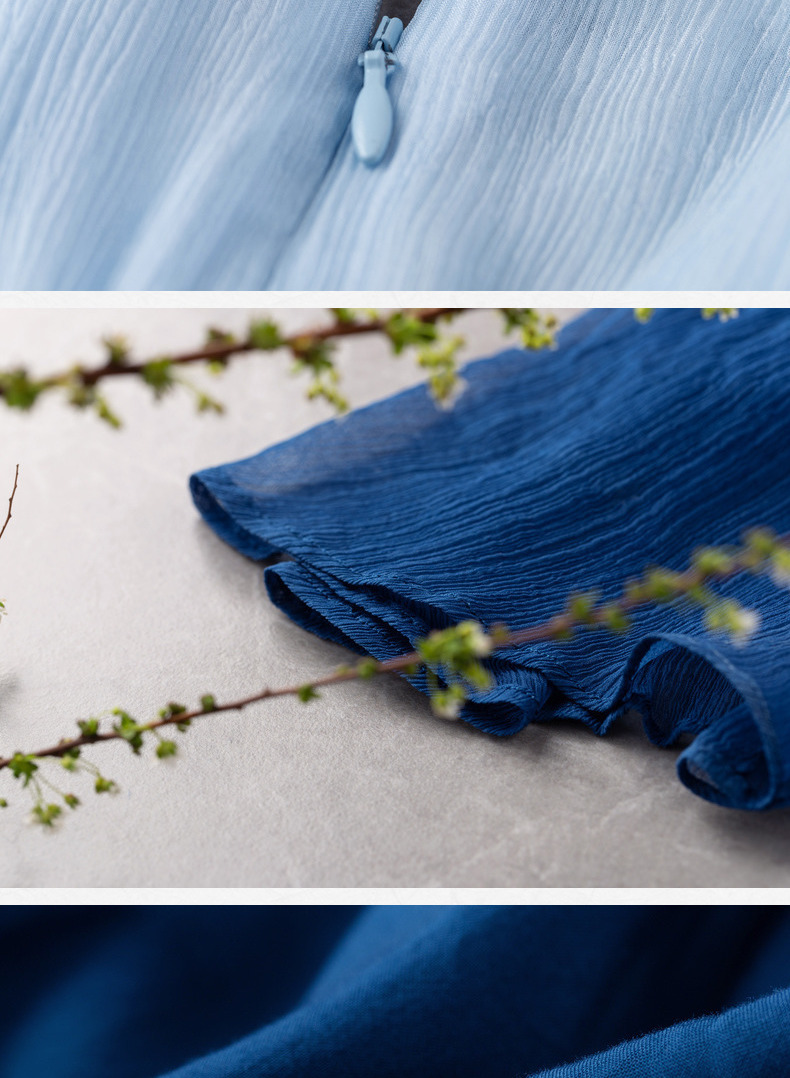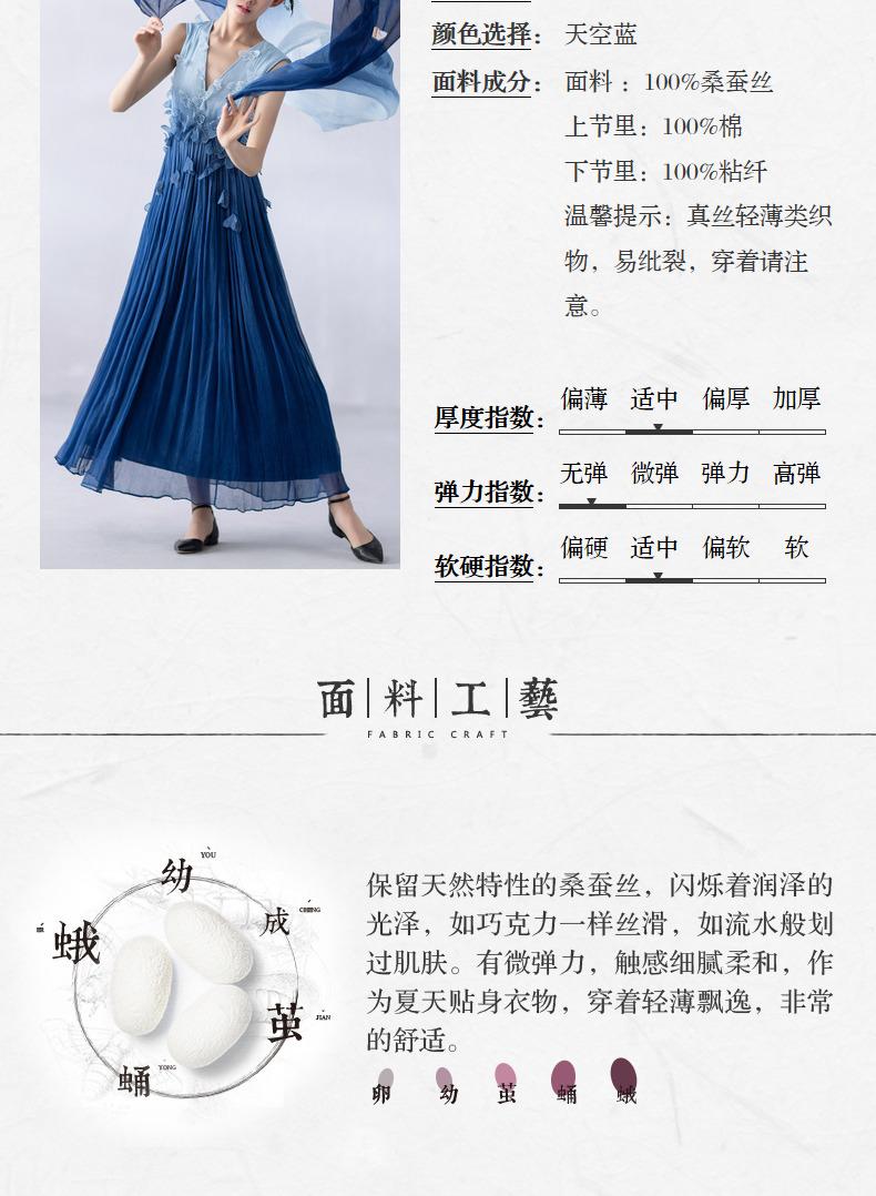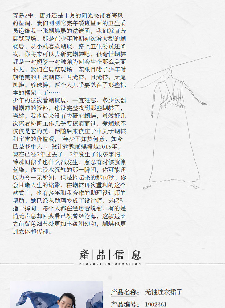【林栖设计小店】【现货】蝴蝶女装新品天空蓝V领无袖真丝桑蚕丝植物染蓝染中长款连衣裙1902361-1961062