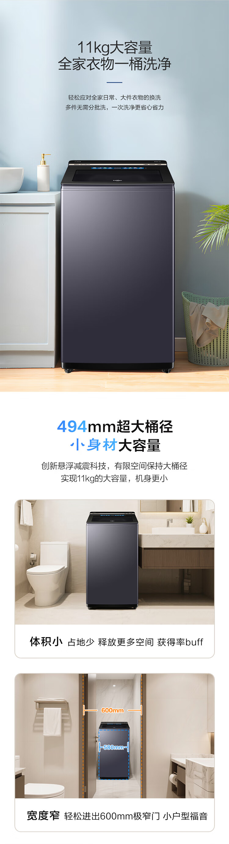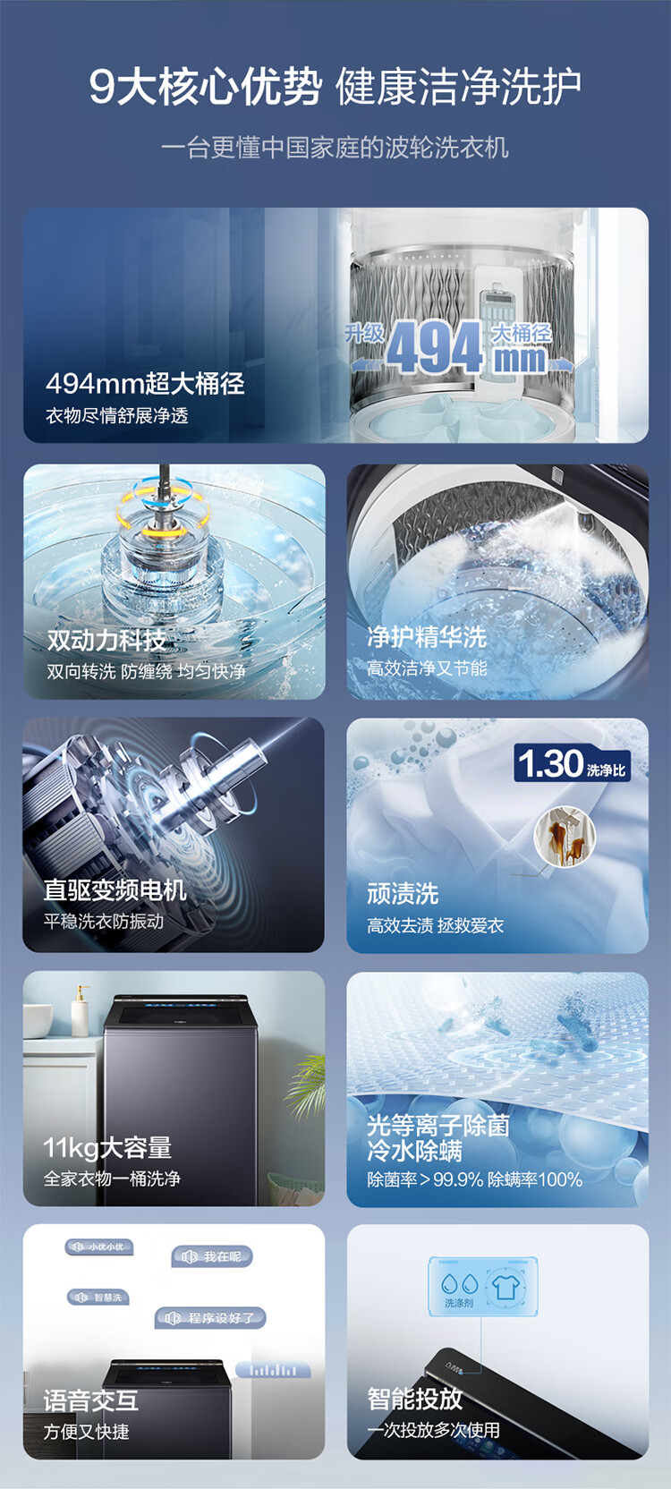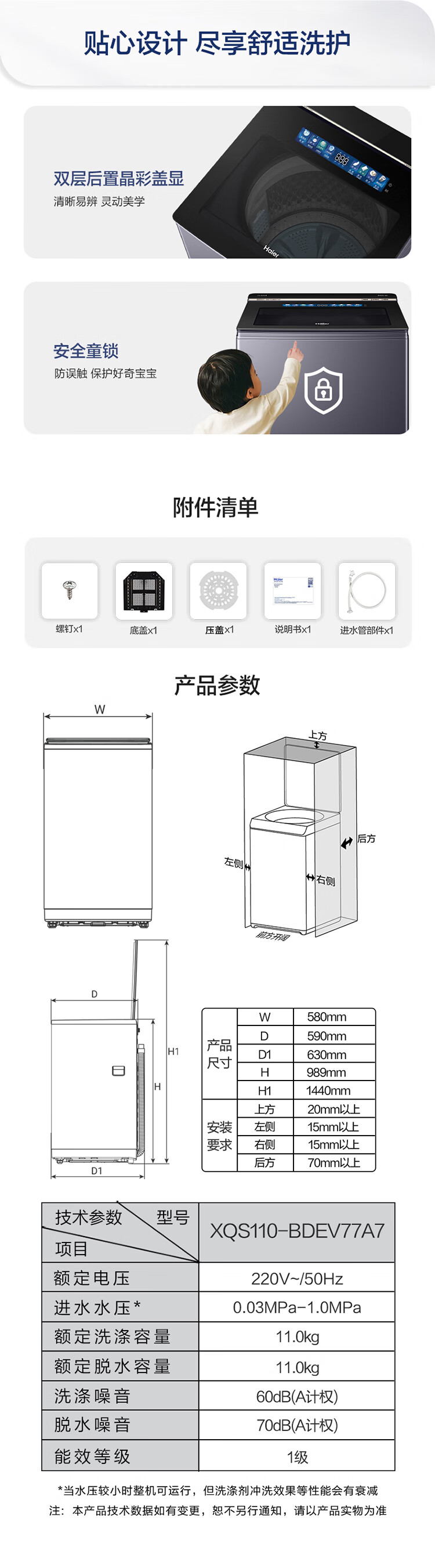 海尔11公斤双动力防缠绕波轮洗衣机全自动国家补贴直驱变频家用一级能效静音智投 大桶BDEV77A7精华洗+双动力防缠绕+晶彩屏XQS110-BDEV77A7