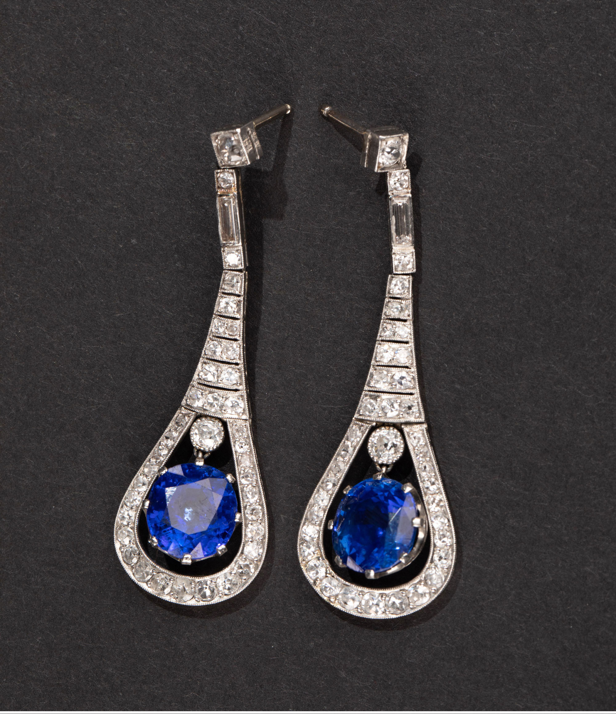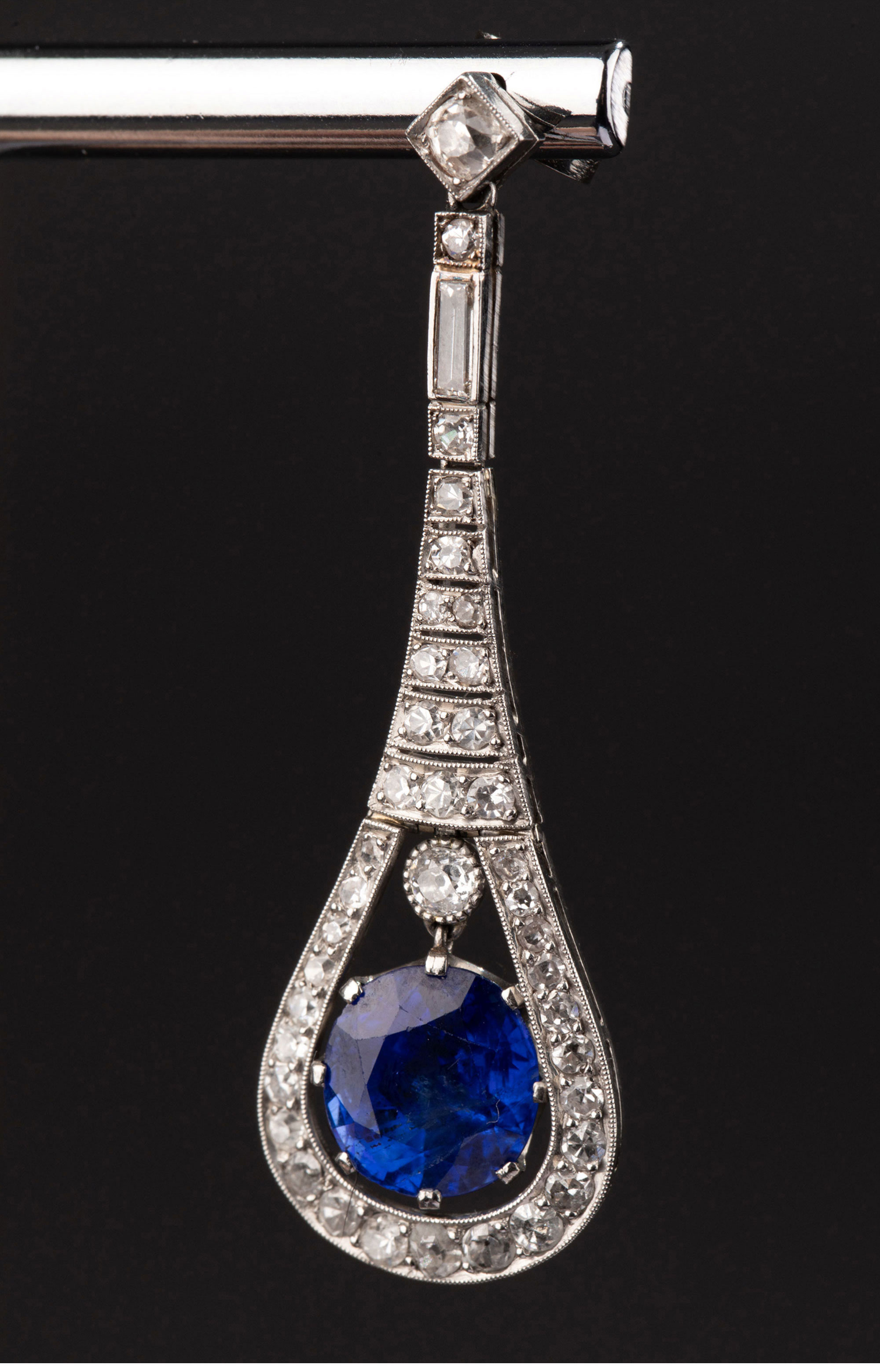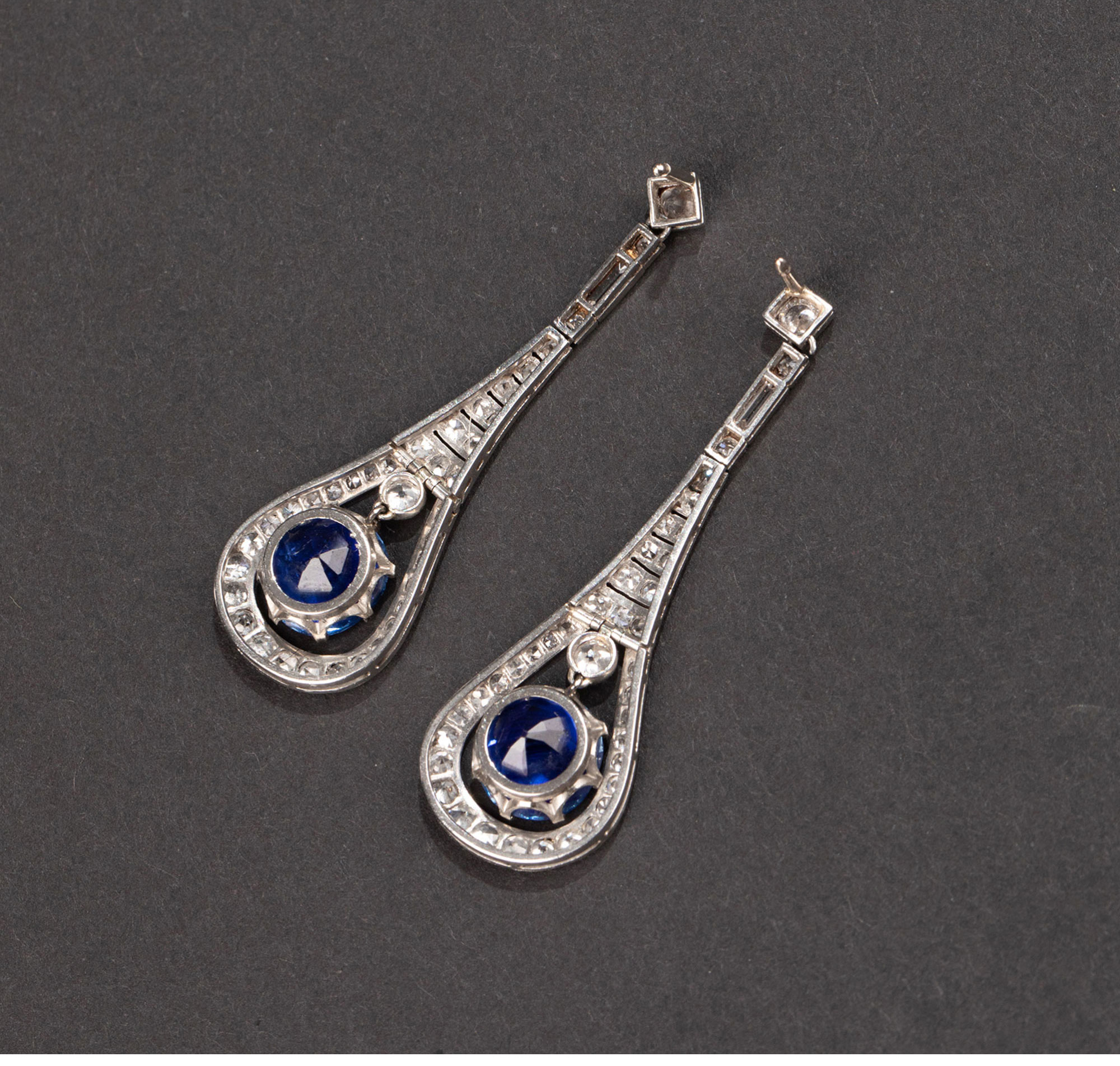 1930年代欧洲出品装饰艺术风格水滴造型铂金镶嵌钻石及蓝宝石耳坠