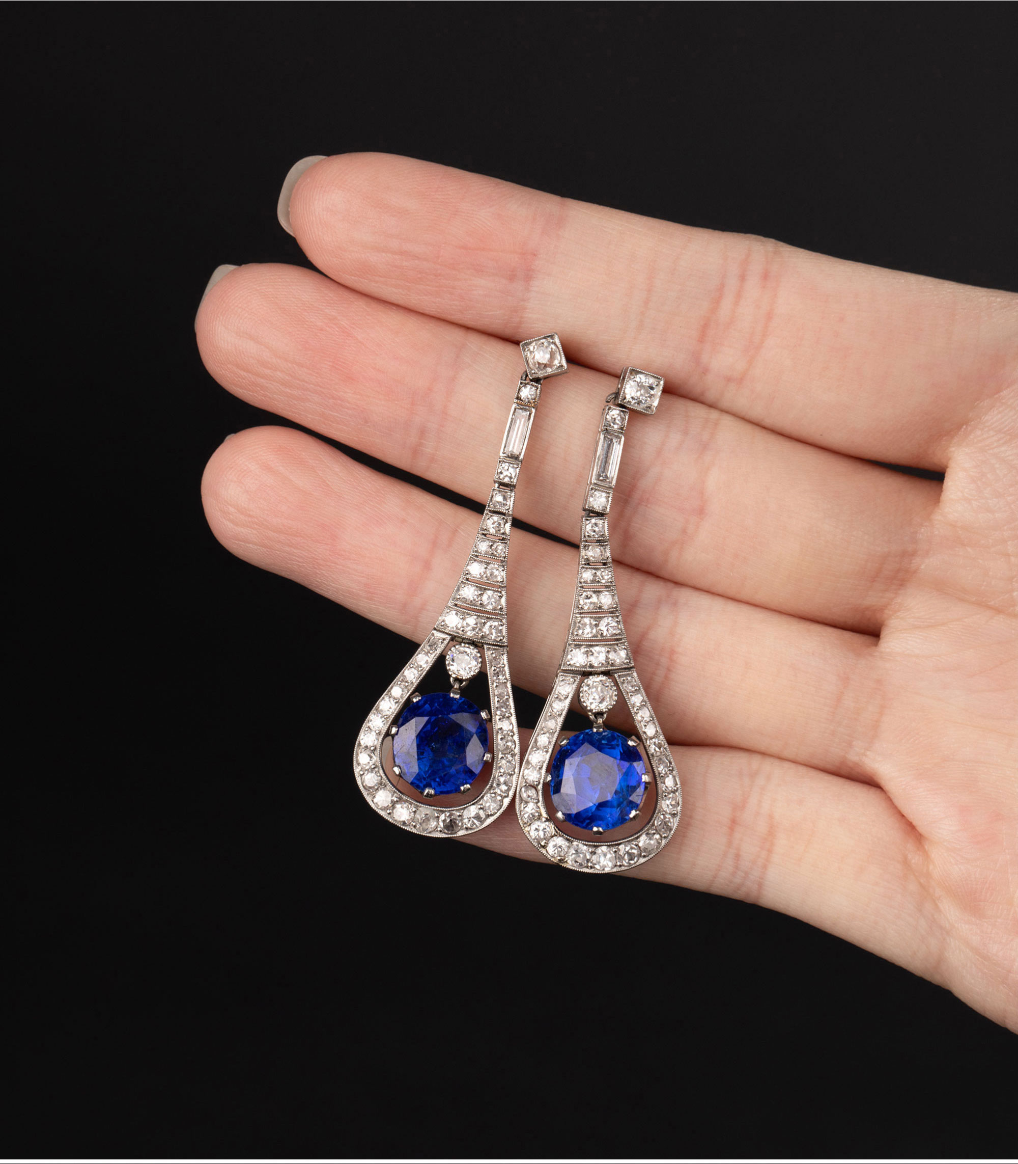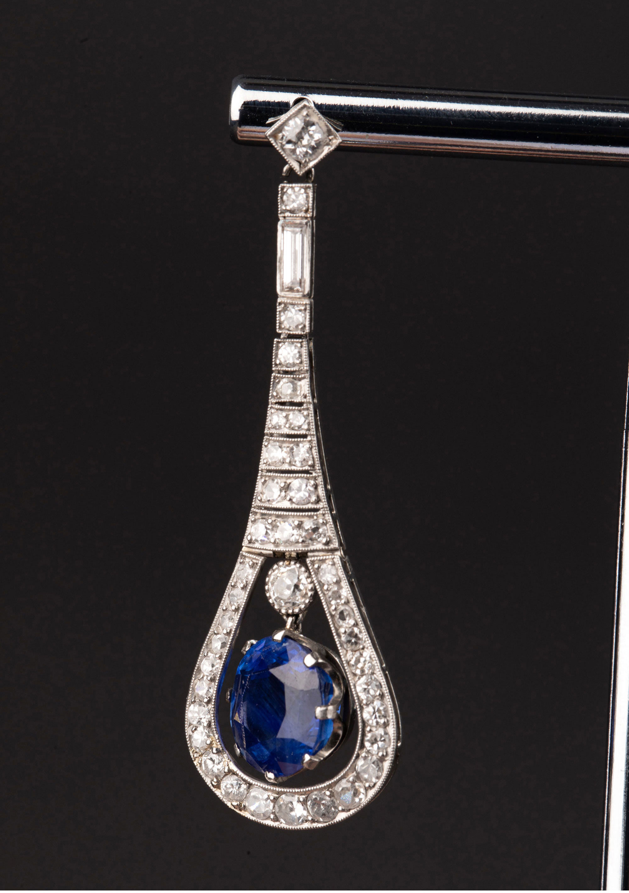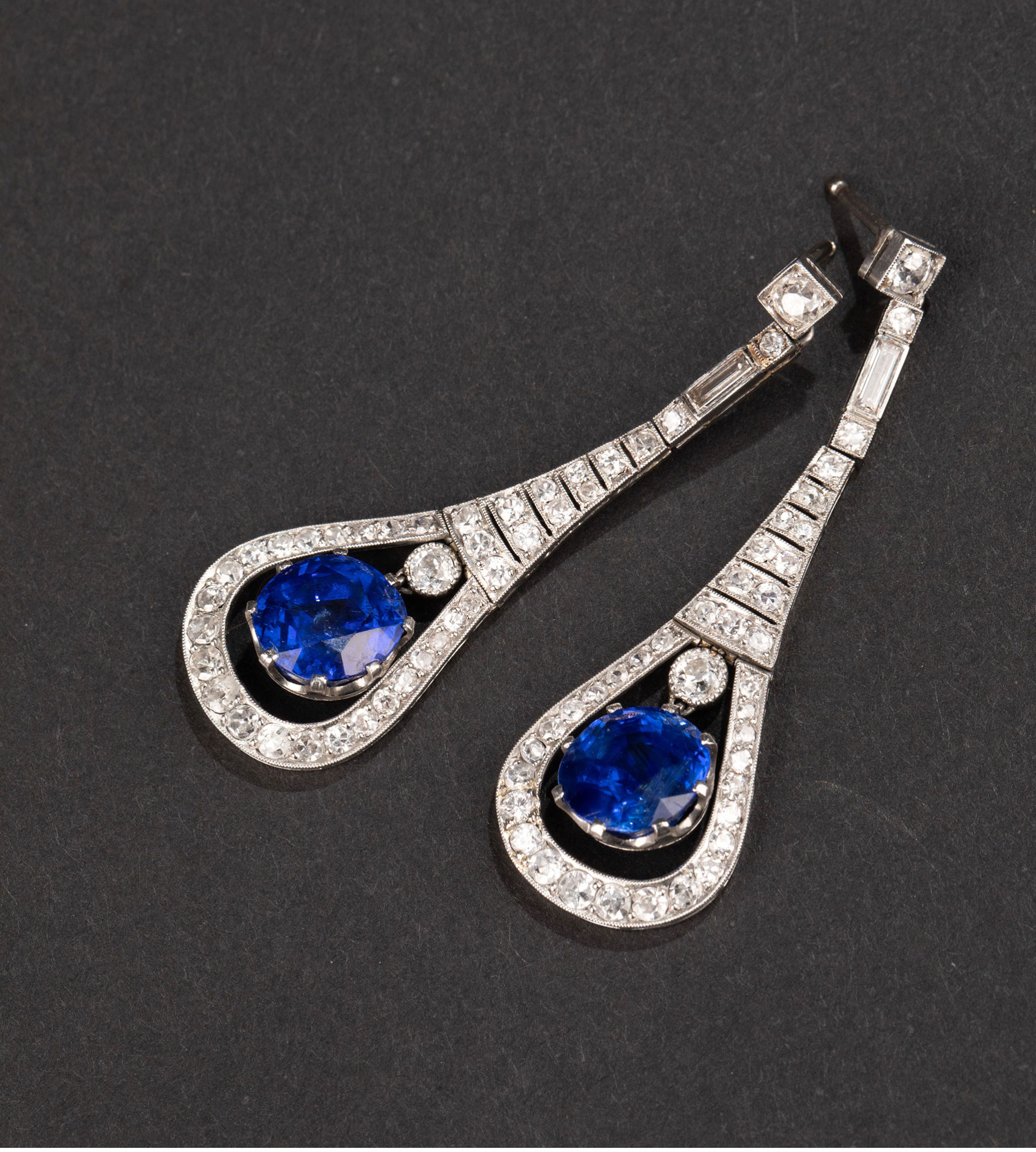1930年代欧洲出品装饰艺术风格水滴造型铂金镶嵌钻石及蓝宝石耳坠