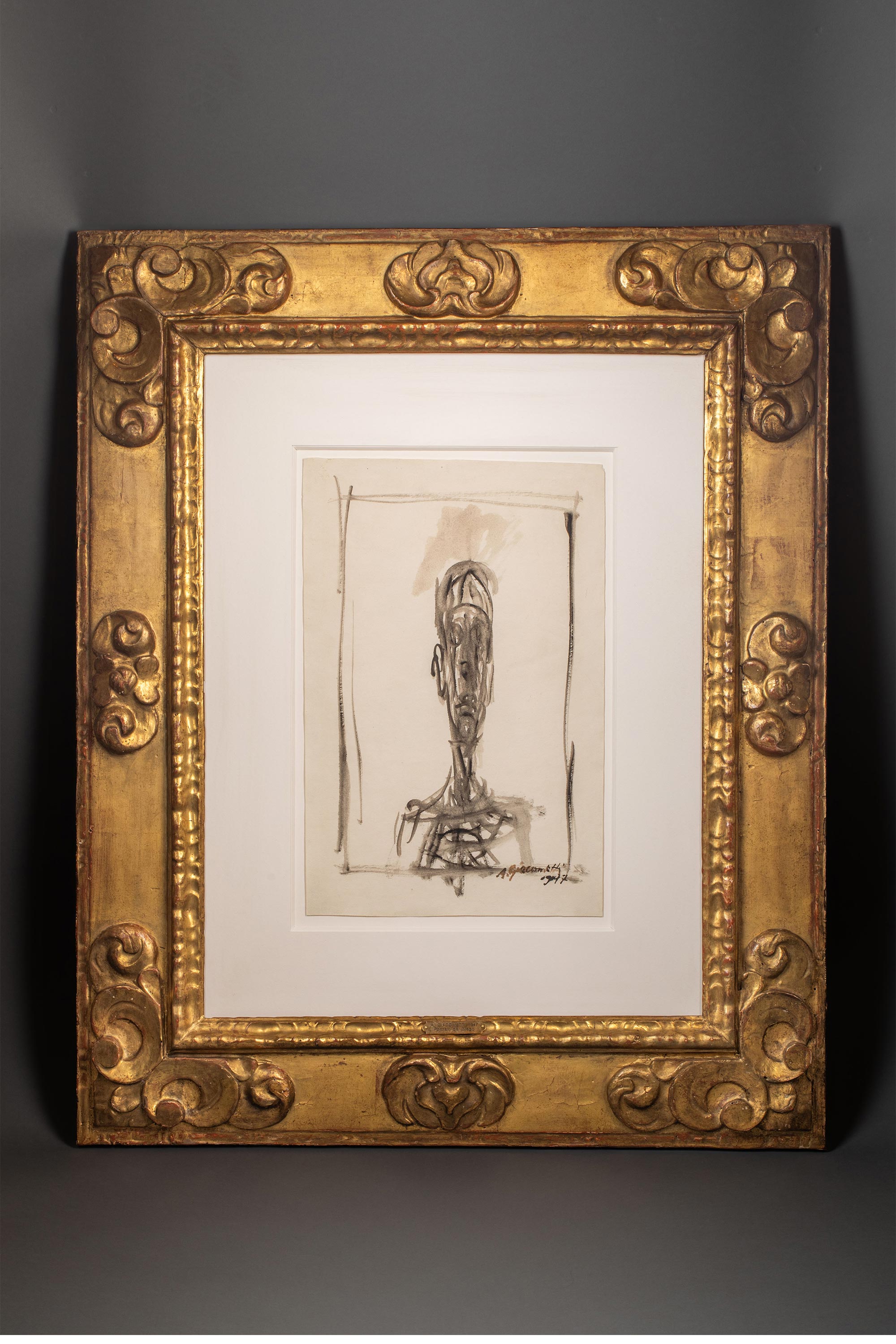 独角鹿西洋古董 瑞士艺术大师阿尔贝托·贾科梅蒂签名创作水粉纸本半身像作品《Portrait de Diego 迭戈肖像》