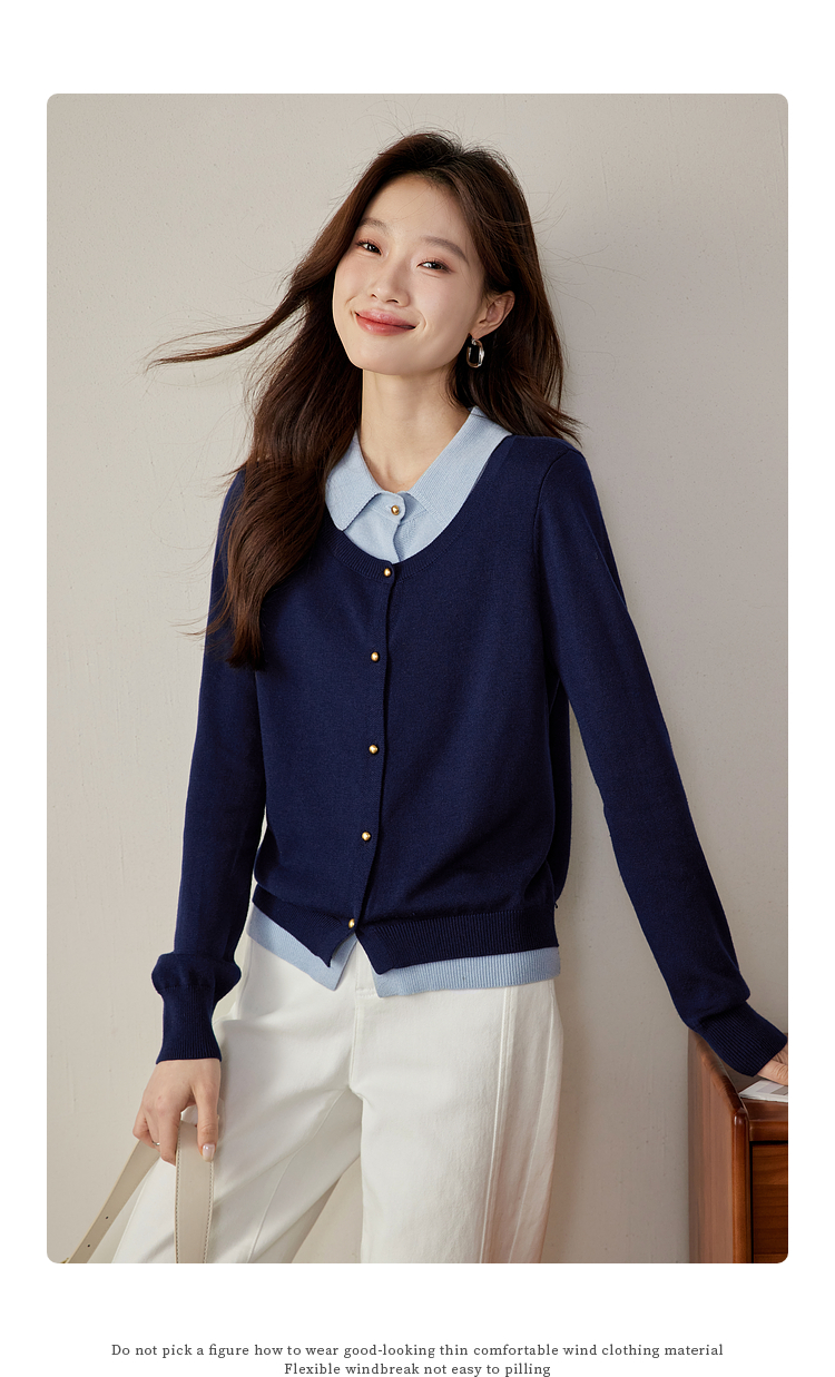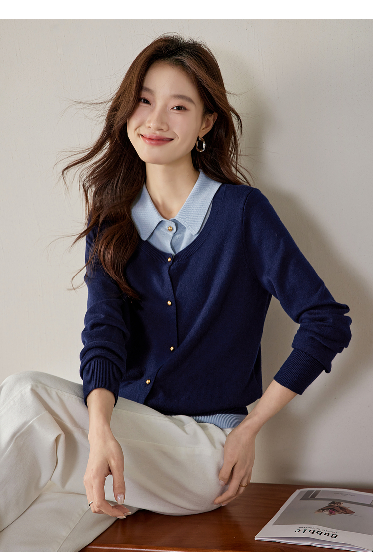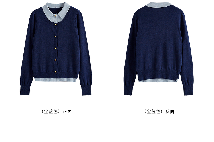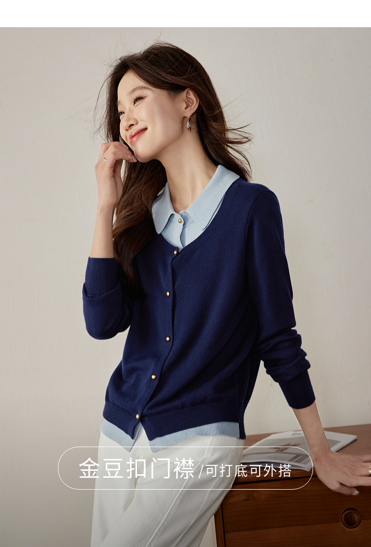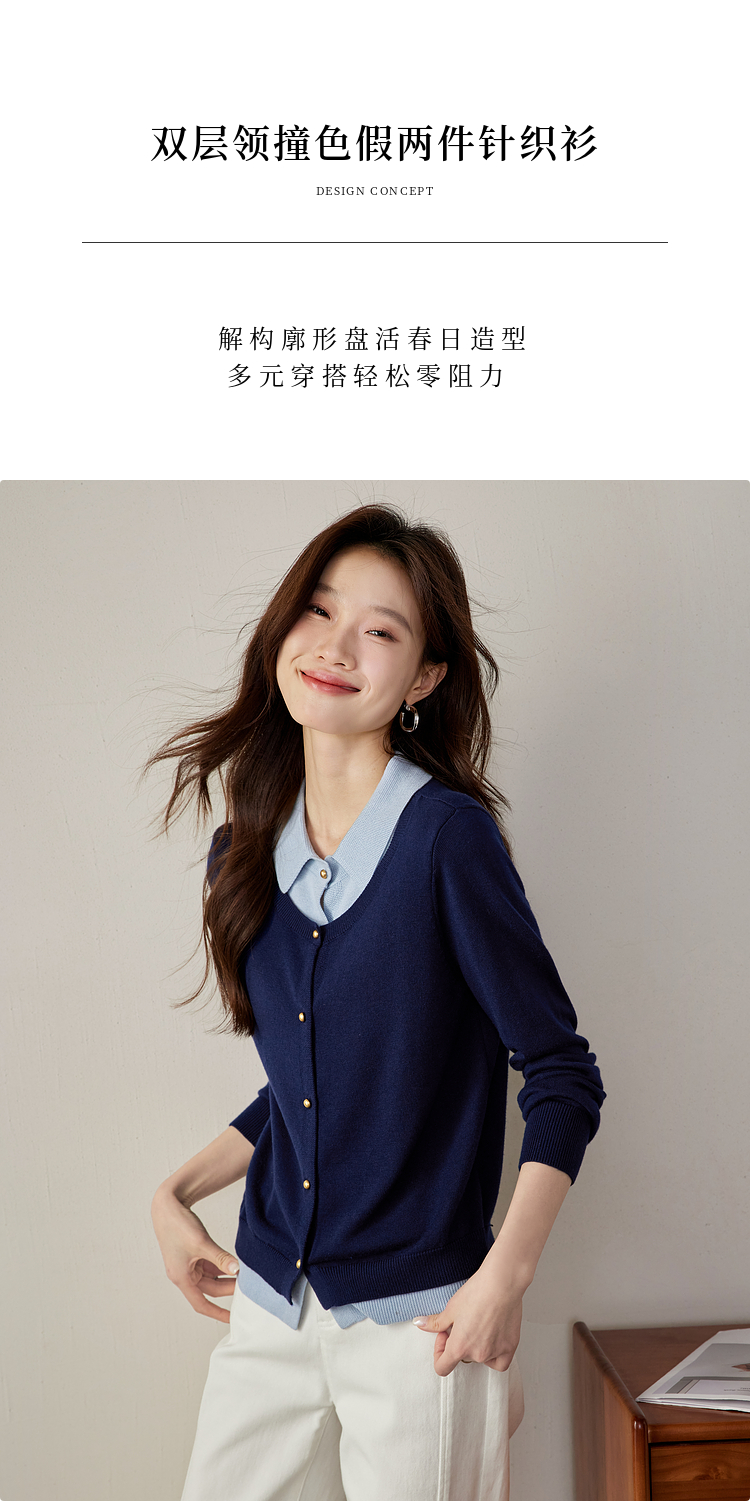 【五折购】熙世界气质时尚撞色翻领假两件针织衫女2025春秋新款长袖毛衫上衣
