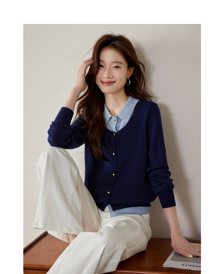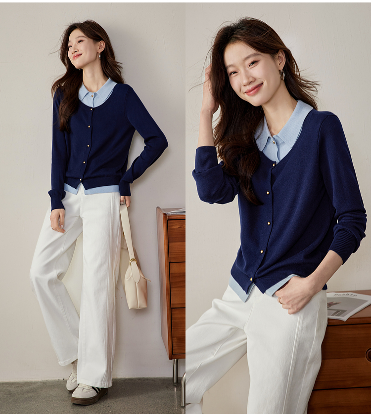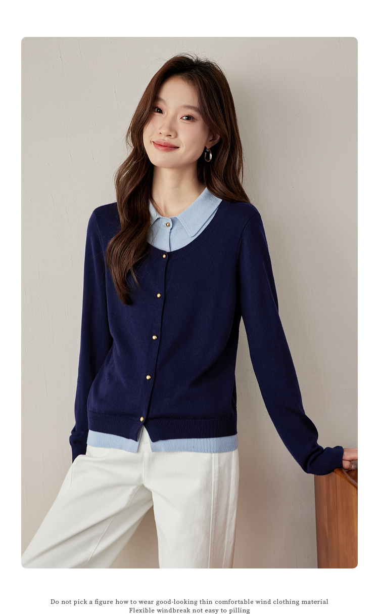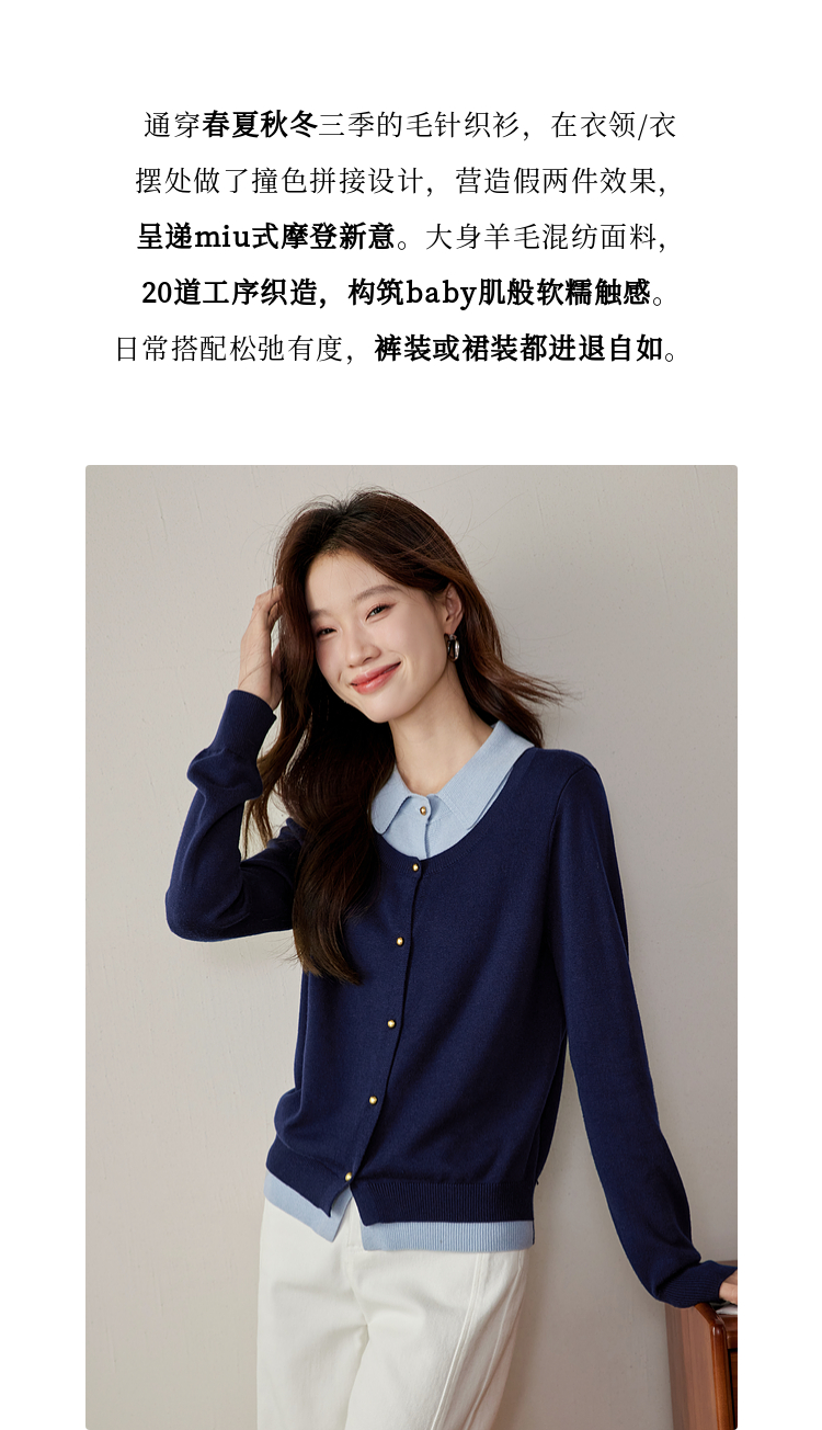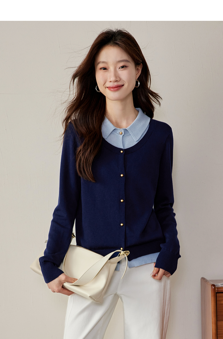 【五折购】熙世界气质时尚撞色翻领假两件针织衫女2025春秋新款长袖毛衫上衣