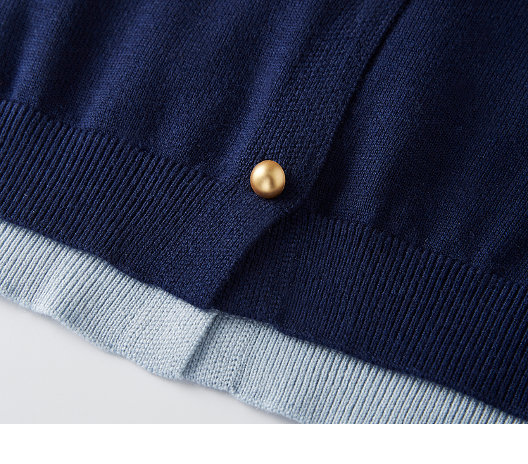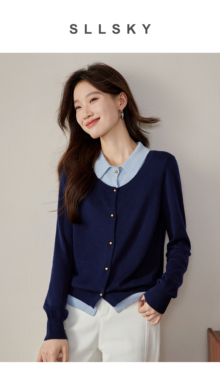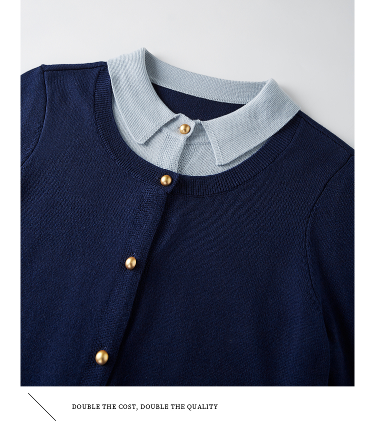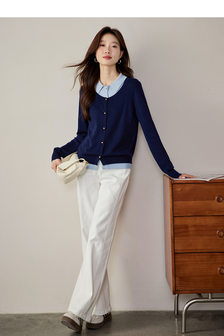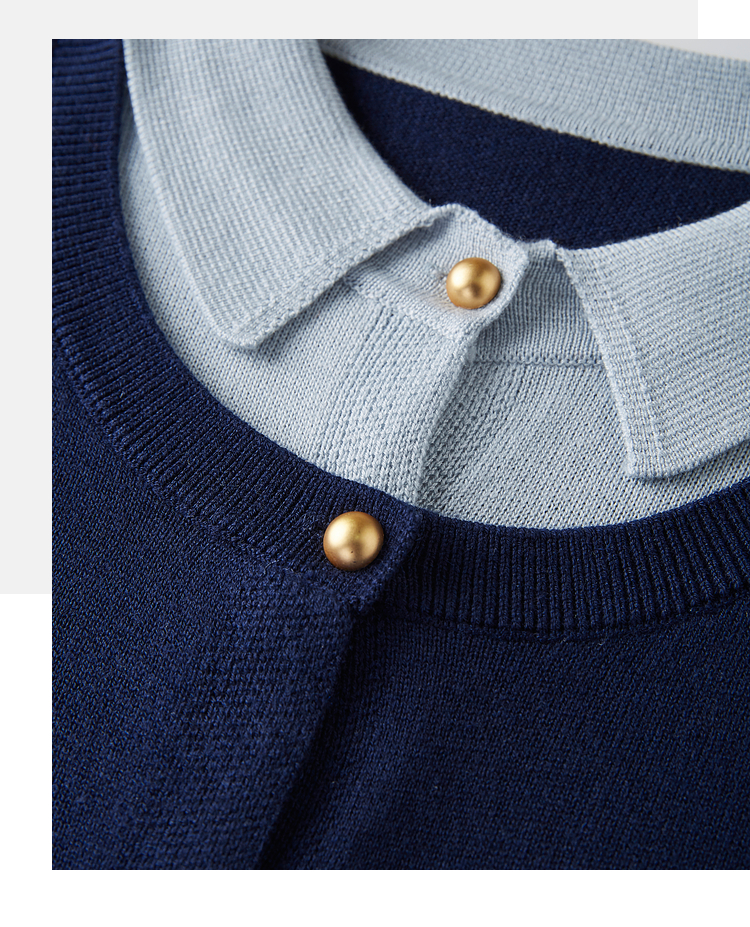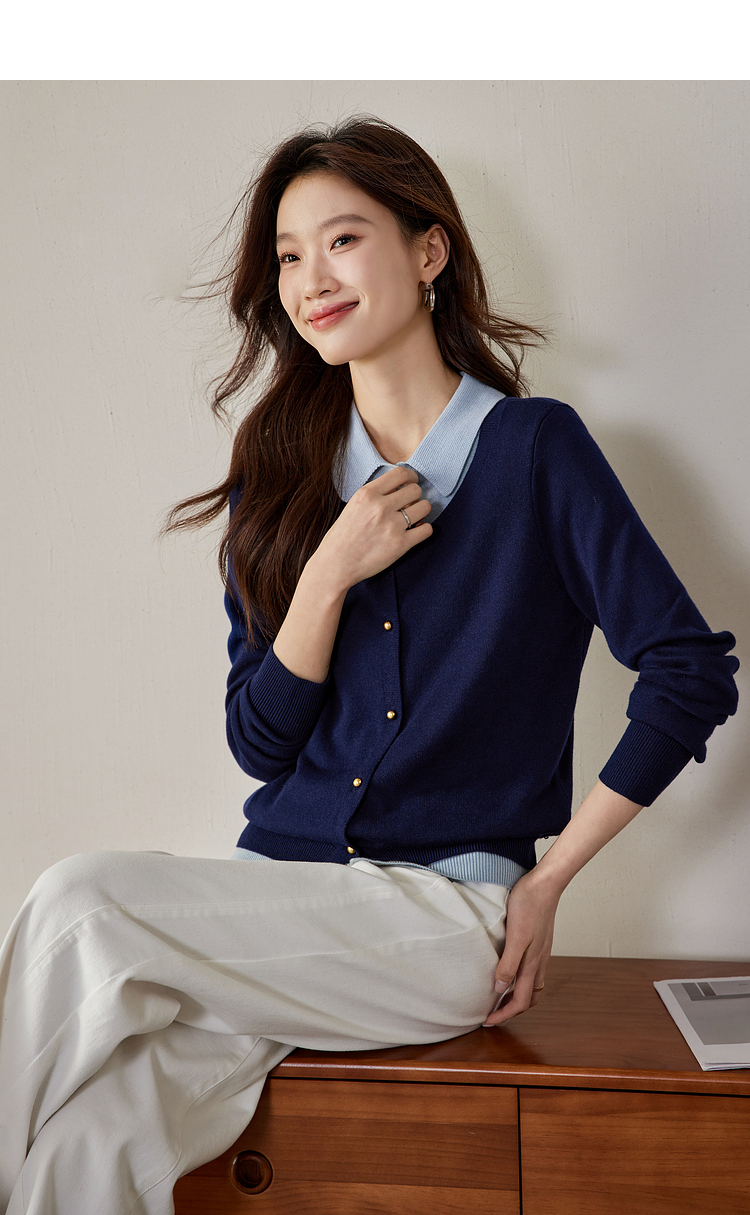 【五折购】熙世界气质时尚撞色翻领假两件针织衫女2025春秋新款长袖毛衫上衣