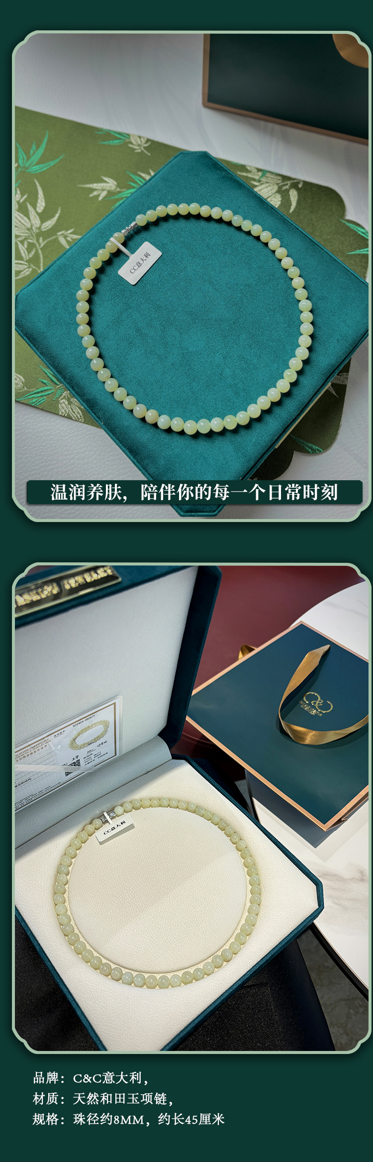 母亲节甄选❤️【C&C意大利限定礼盒.天然和田玉项链】100%天然和田玉,56颗8mm玉珠 | 附检测证书,一物一码防伪可查