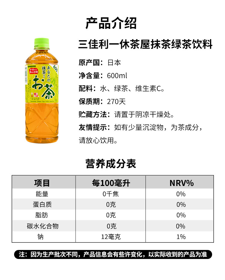 三佳利一休茶屋抹茶绿茶饮料600ml
