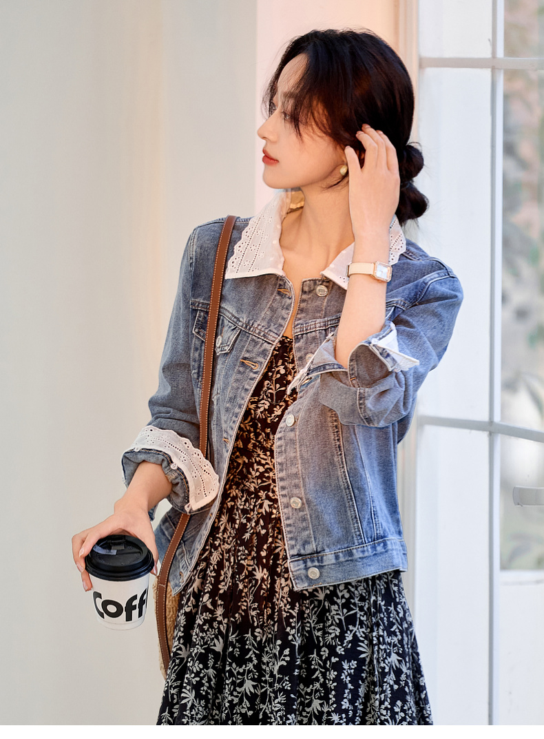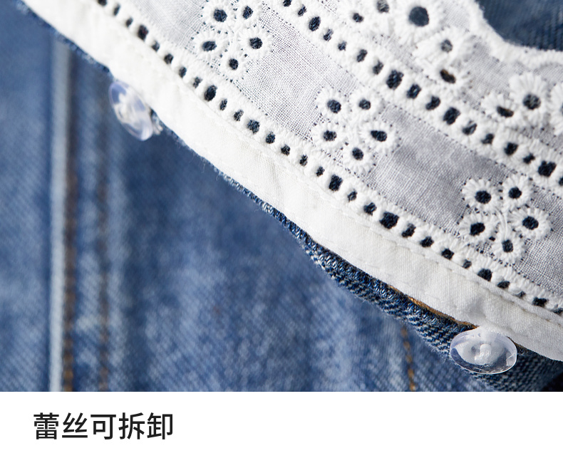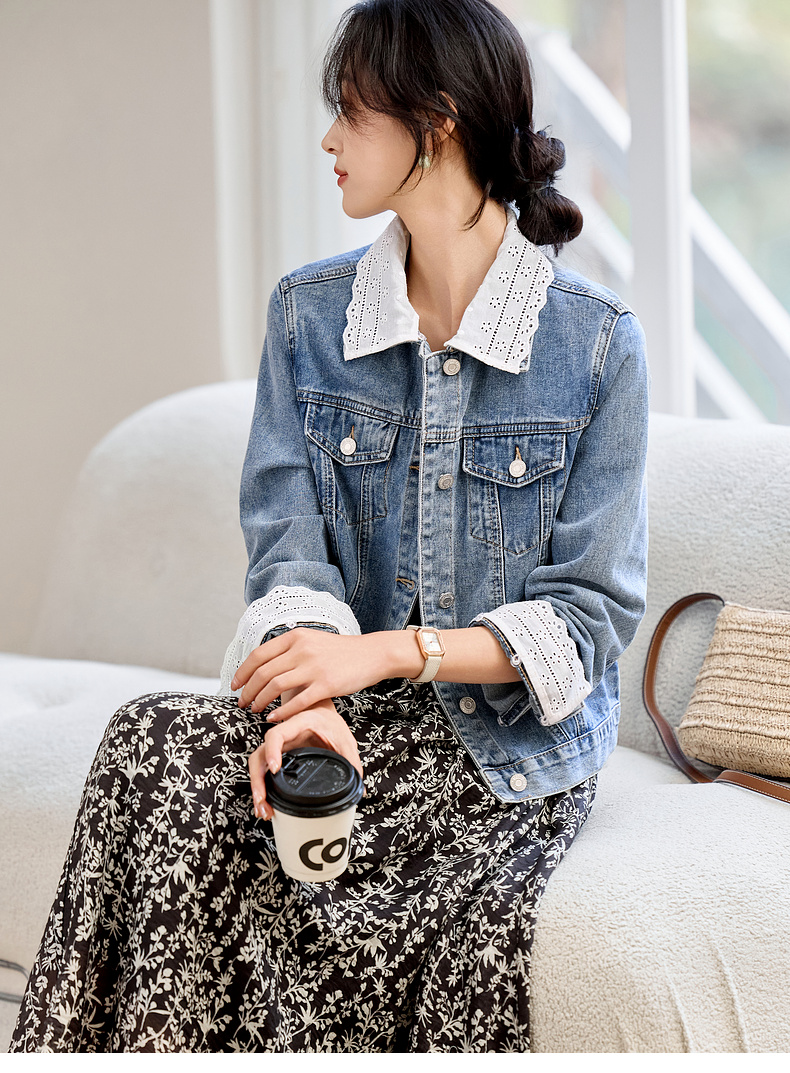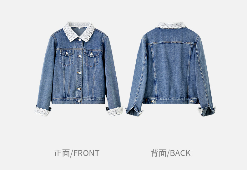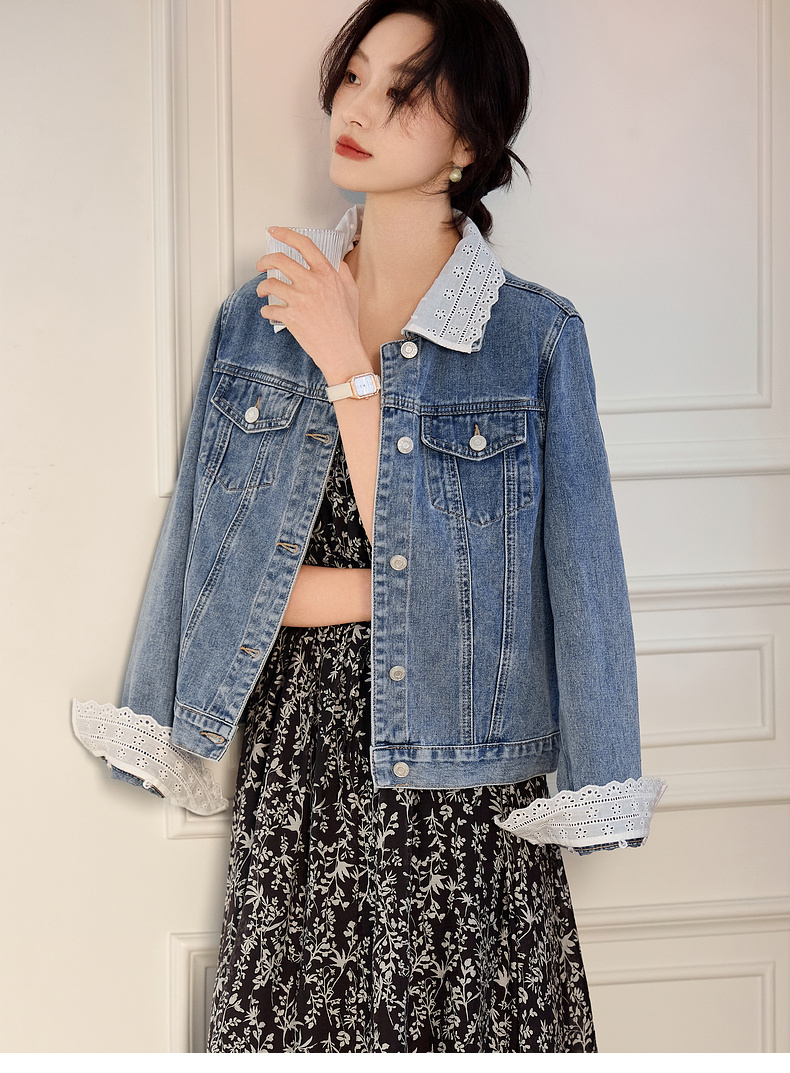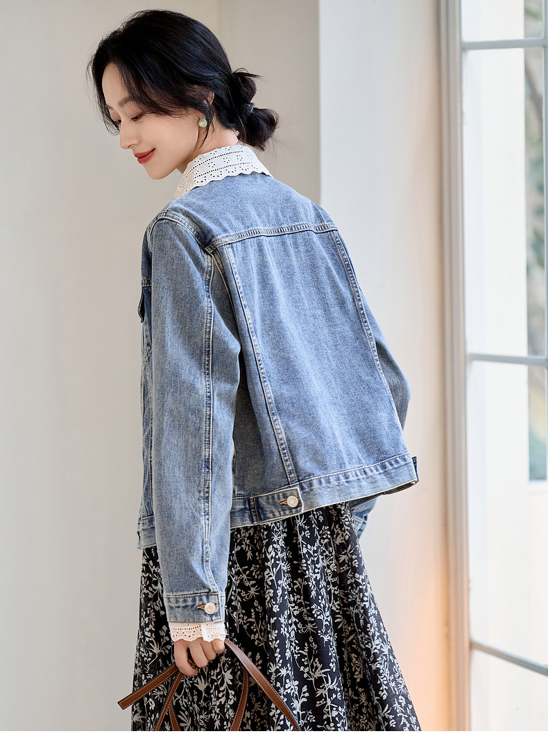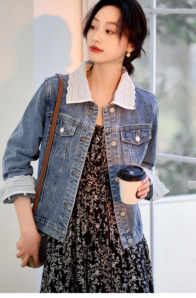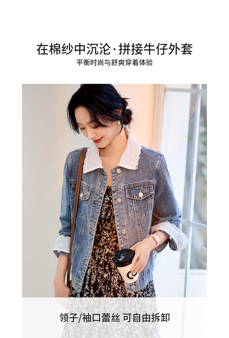 【内购】【蕾丝可拆卸】简约通勤双层翻领落肩袖纯棉水洗两穿牛仔外套-W51W80409