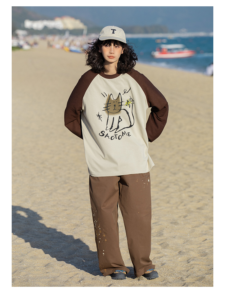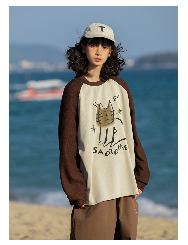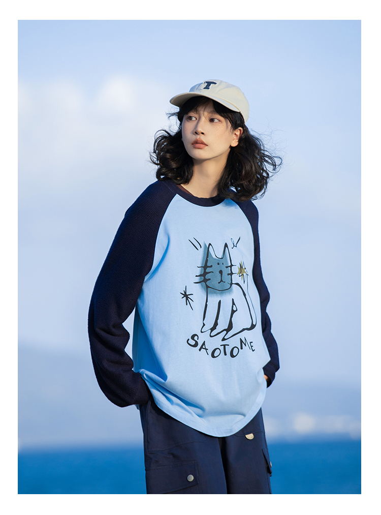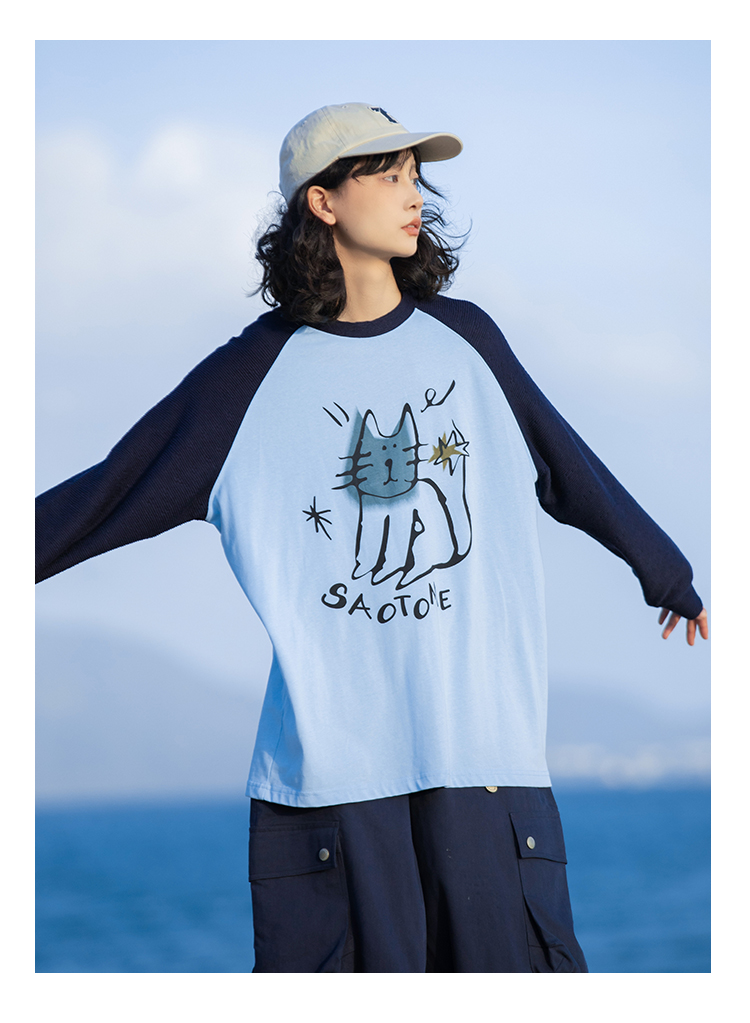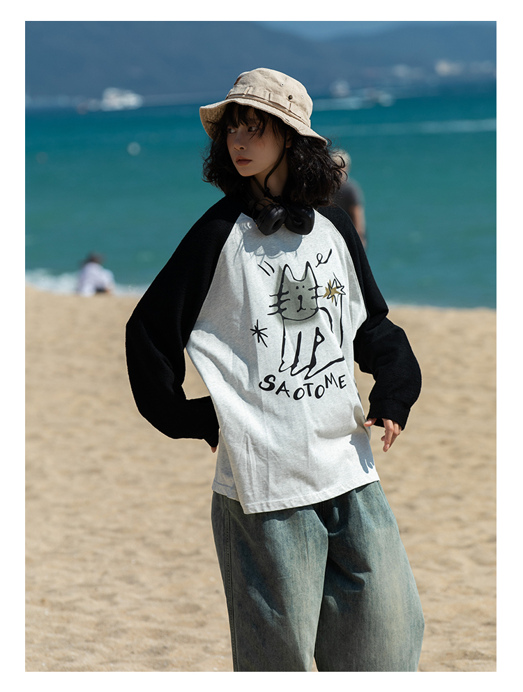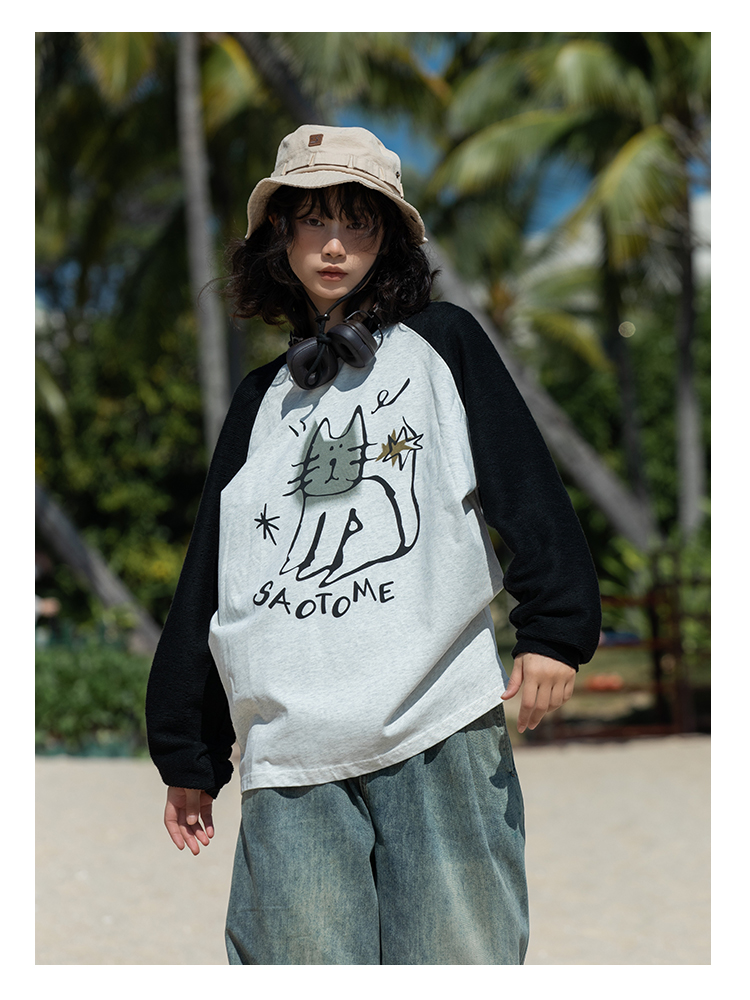 早乙女惠子saotome/STMCX240121/猫猫涂鸦插肩长袖T恤