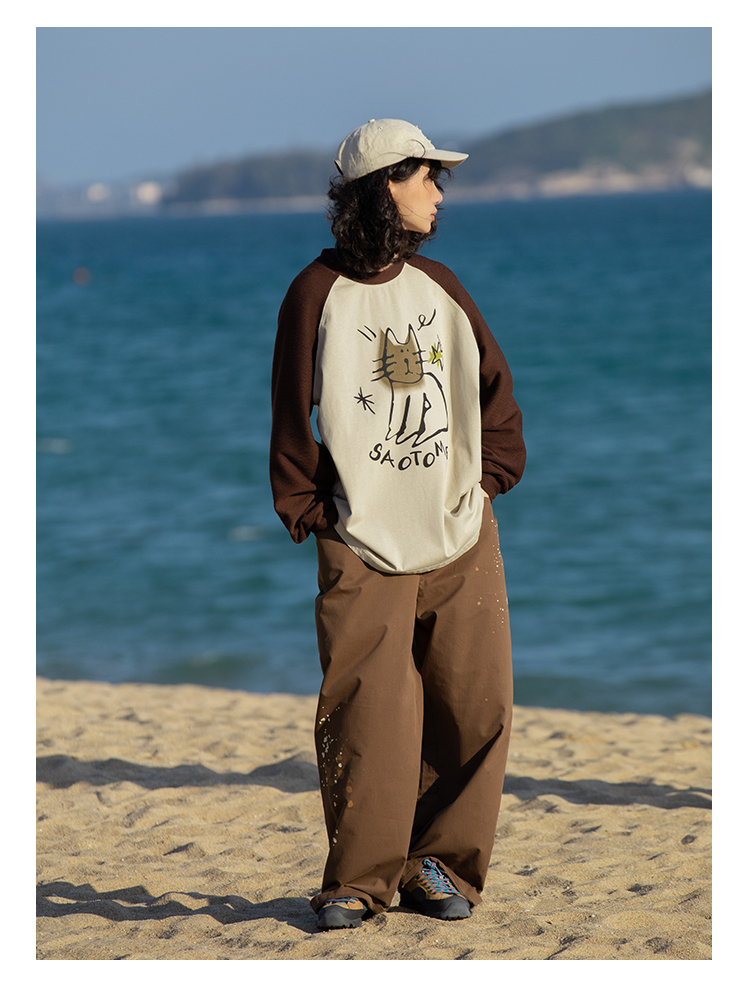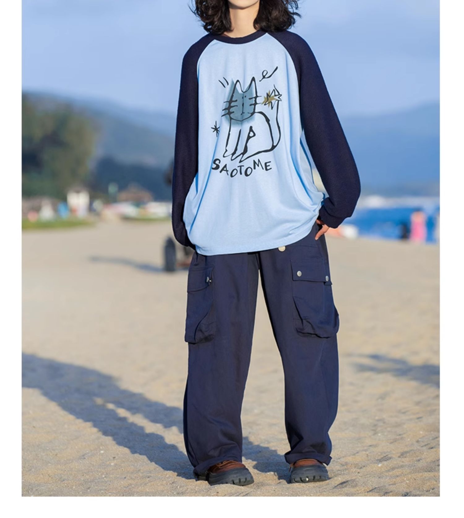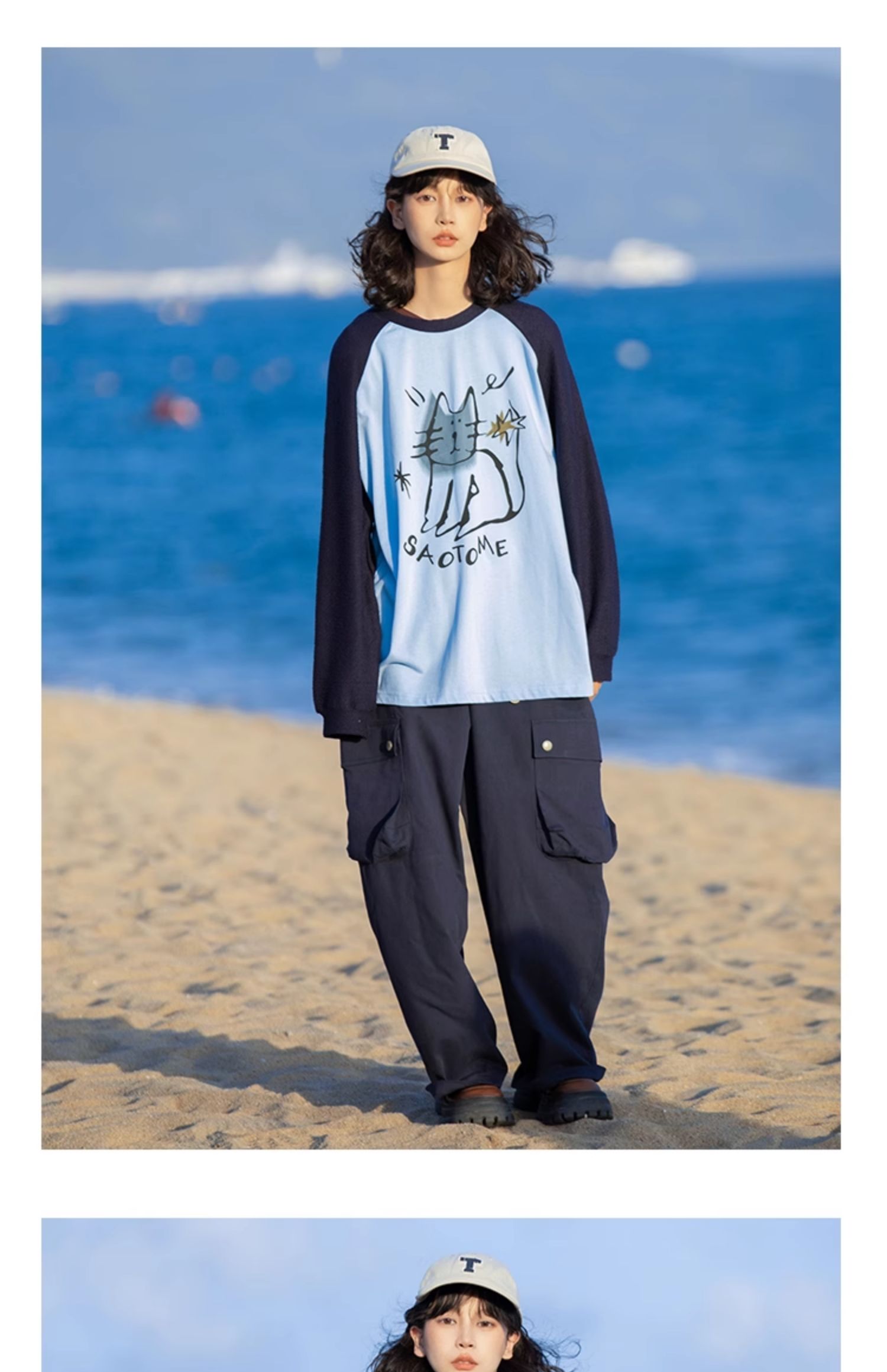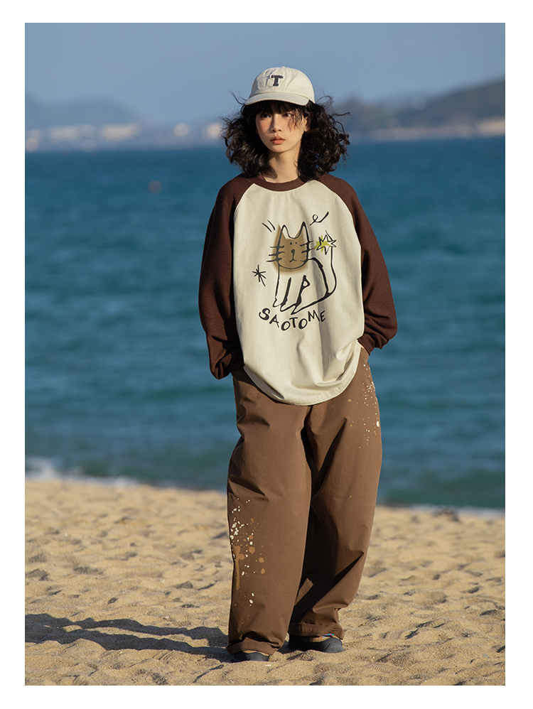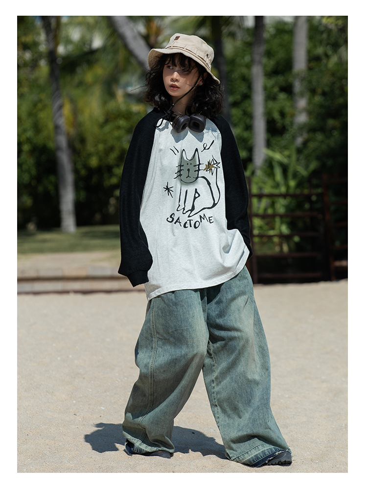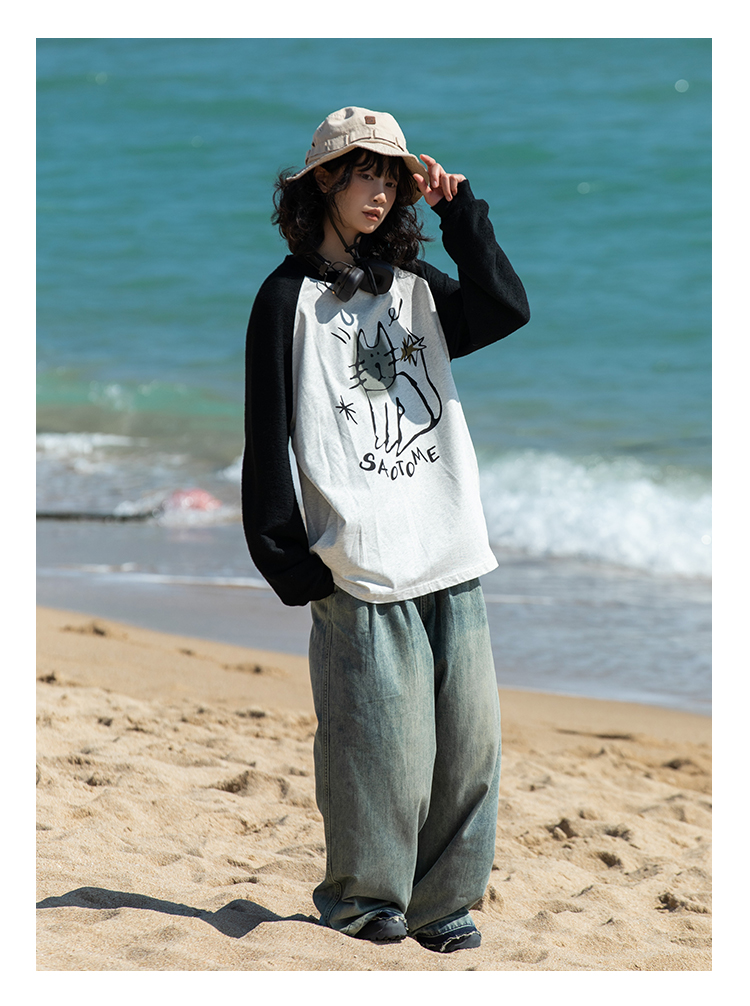 早乙女惠子saotome/STMCX240121/猫猫涂鸦插肩长袖T恤