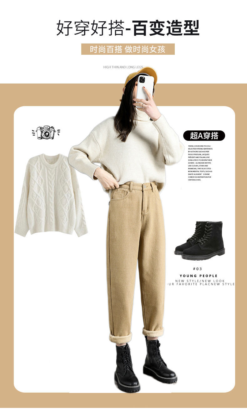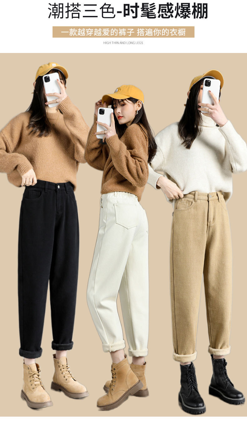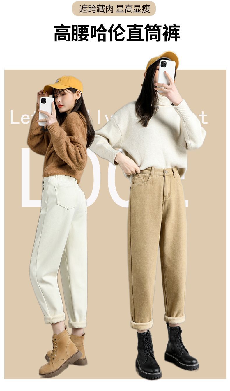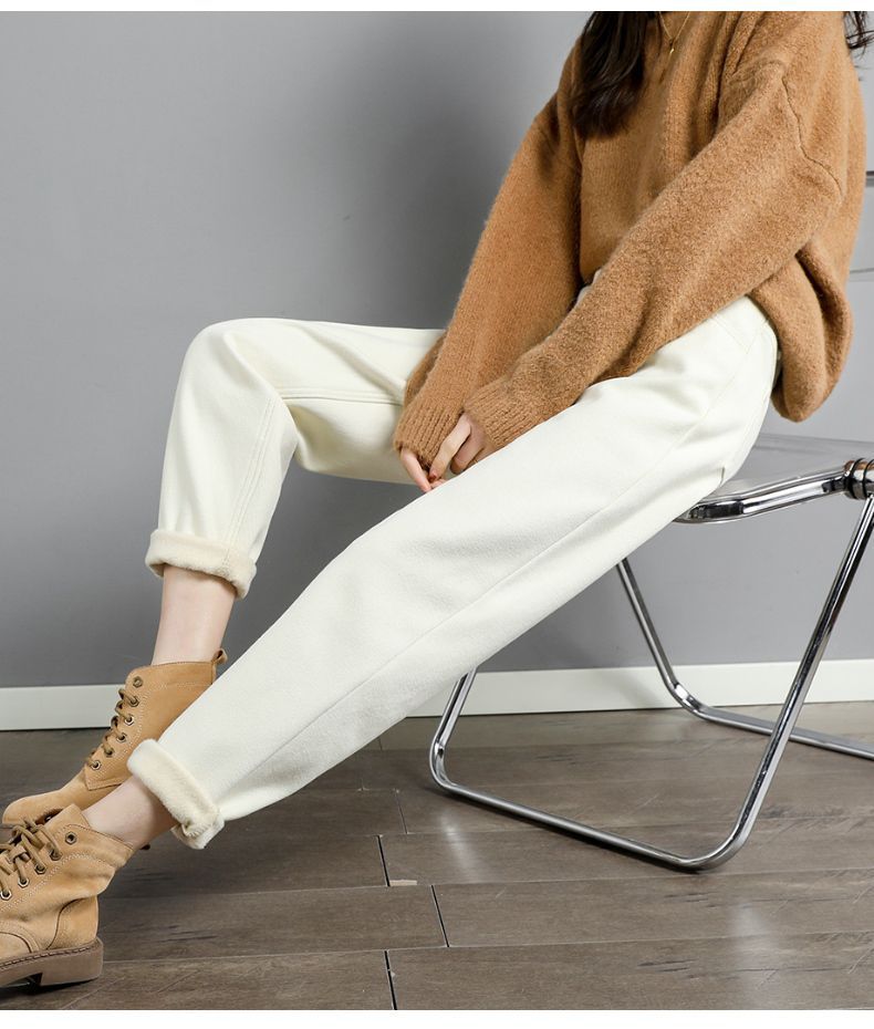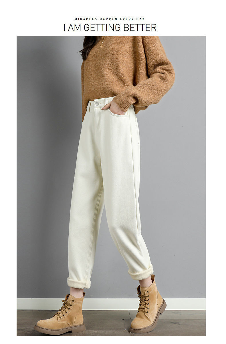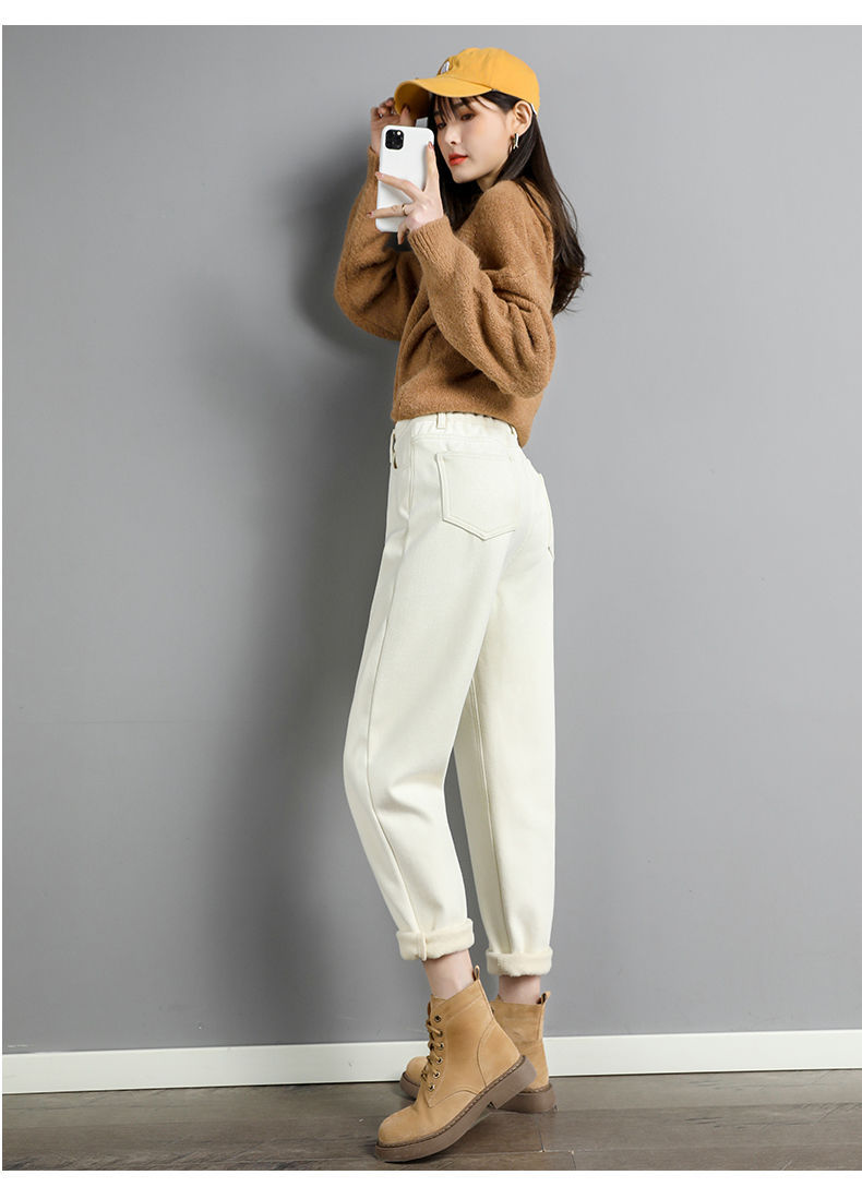 白色加绒牛仔裤,高腰宽松羊羔绒哈伦老爹裤MC-哈伦裤