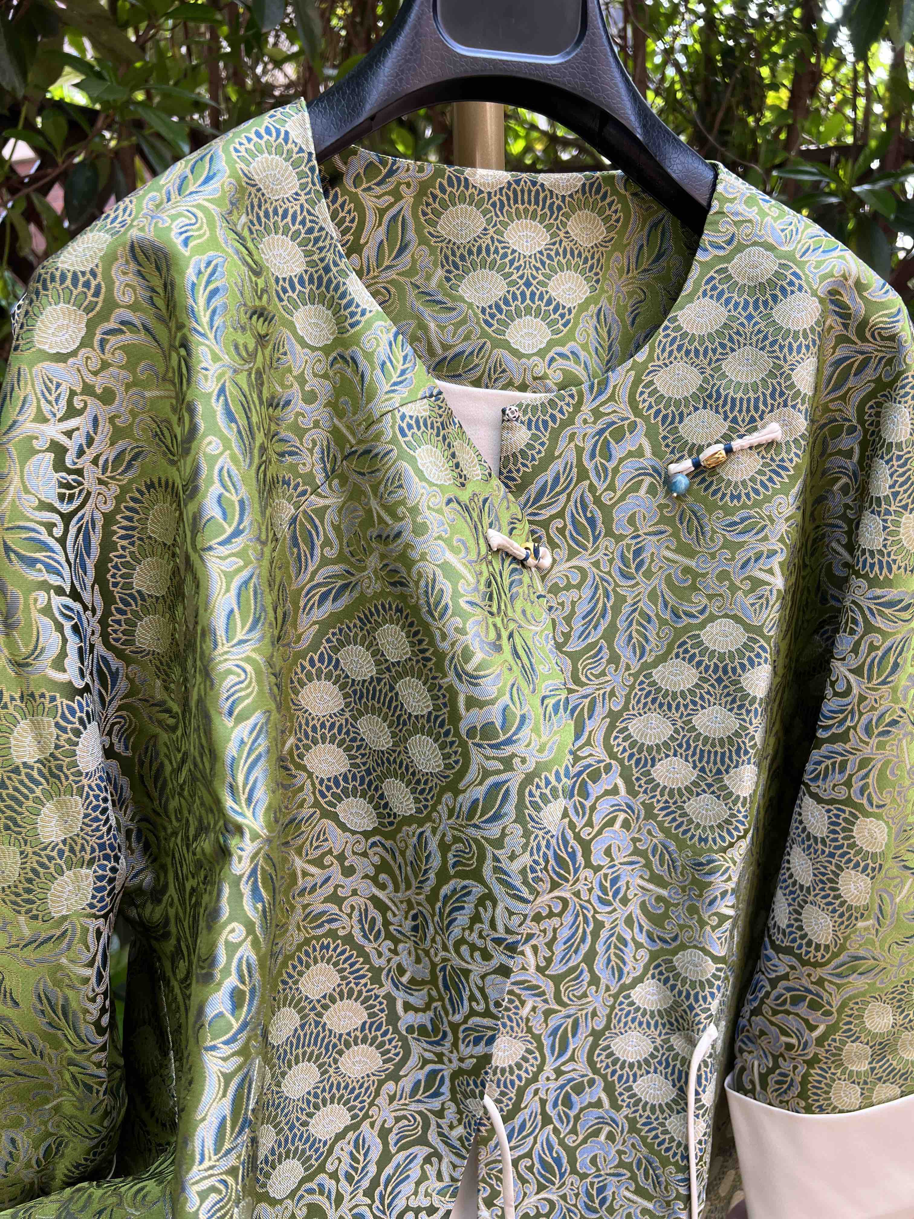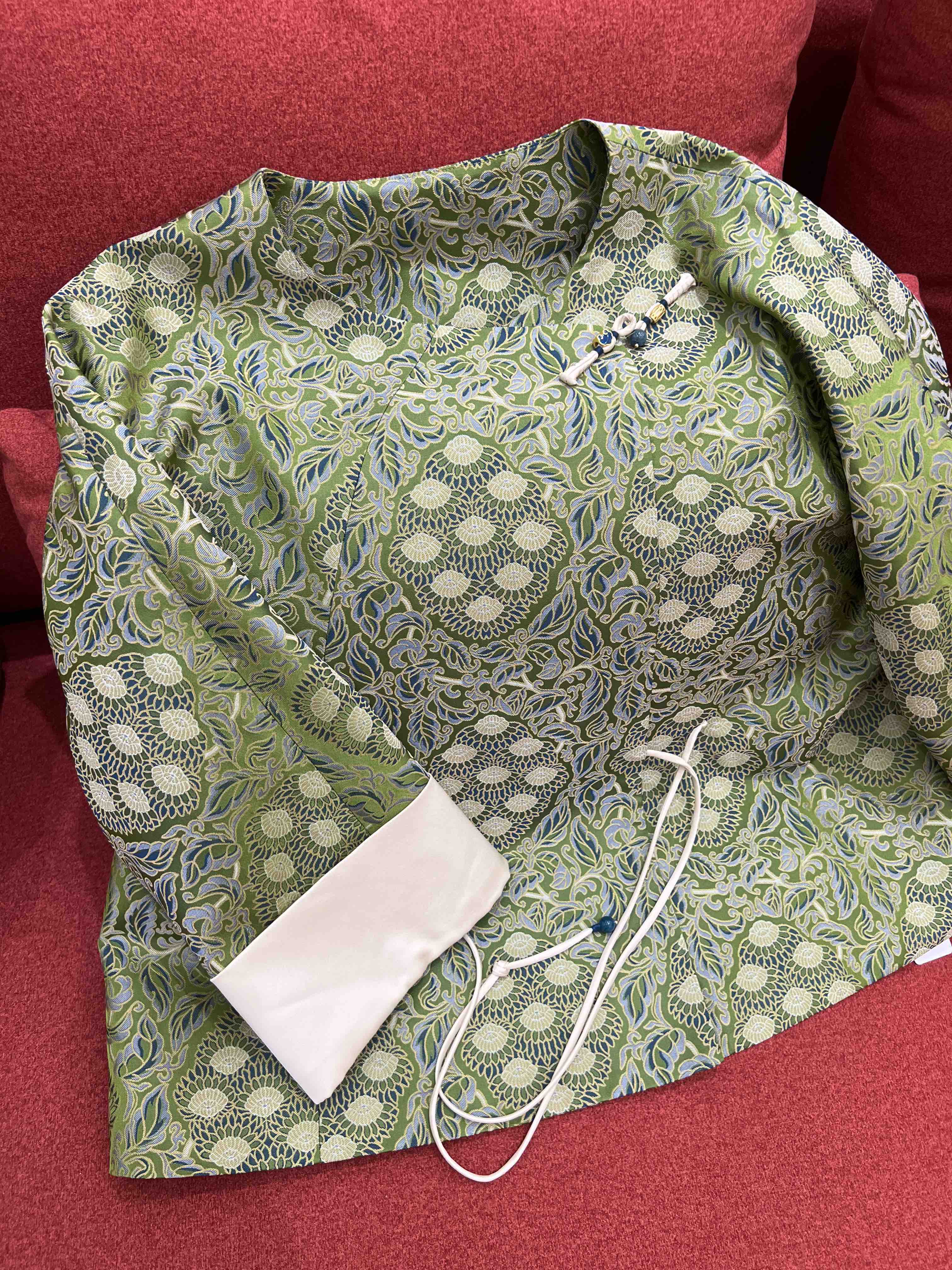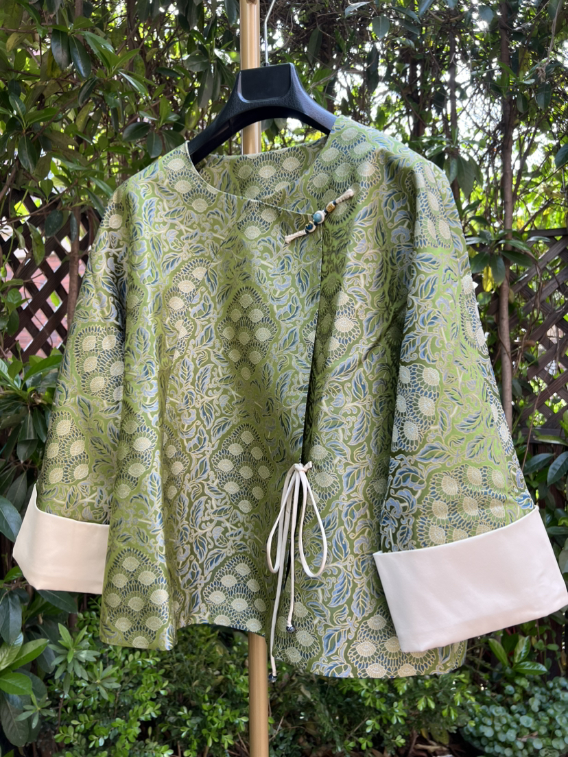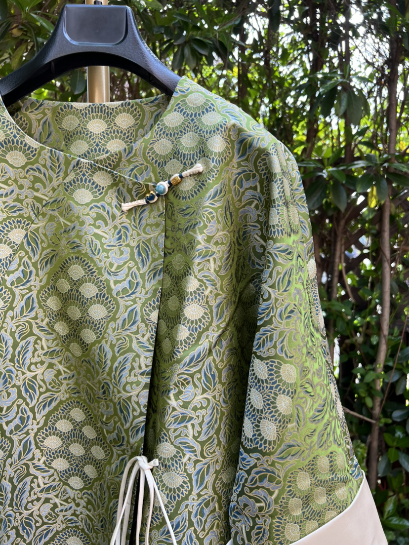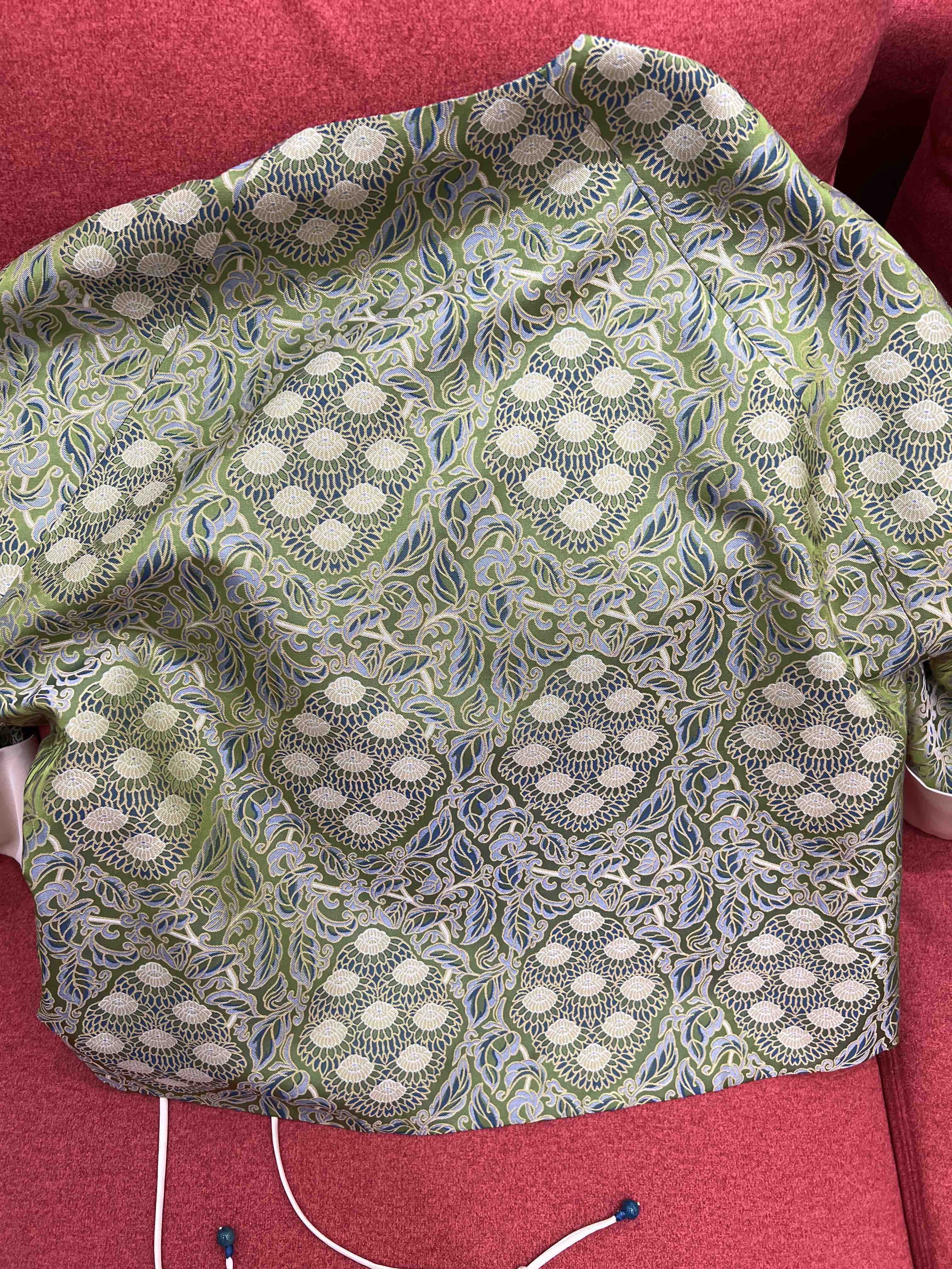 百分百宋锦,温润怡人透气两双,完全不是普通织锦的烧灼感。这件上衣很吃面料,一等就是一个月。