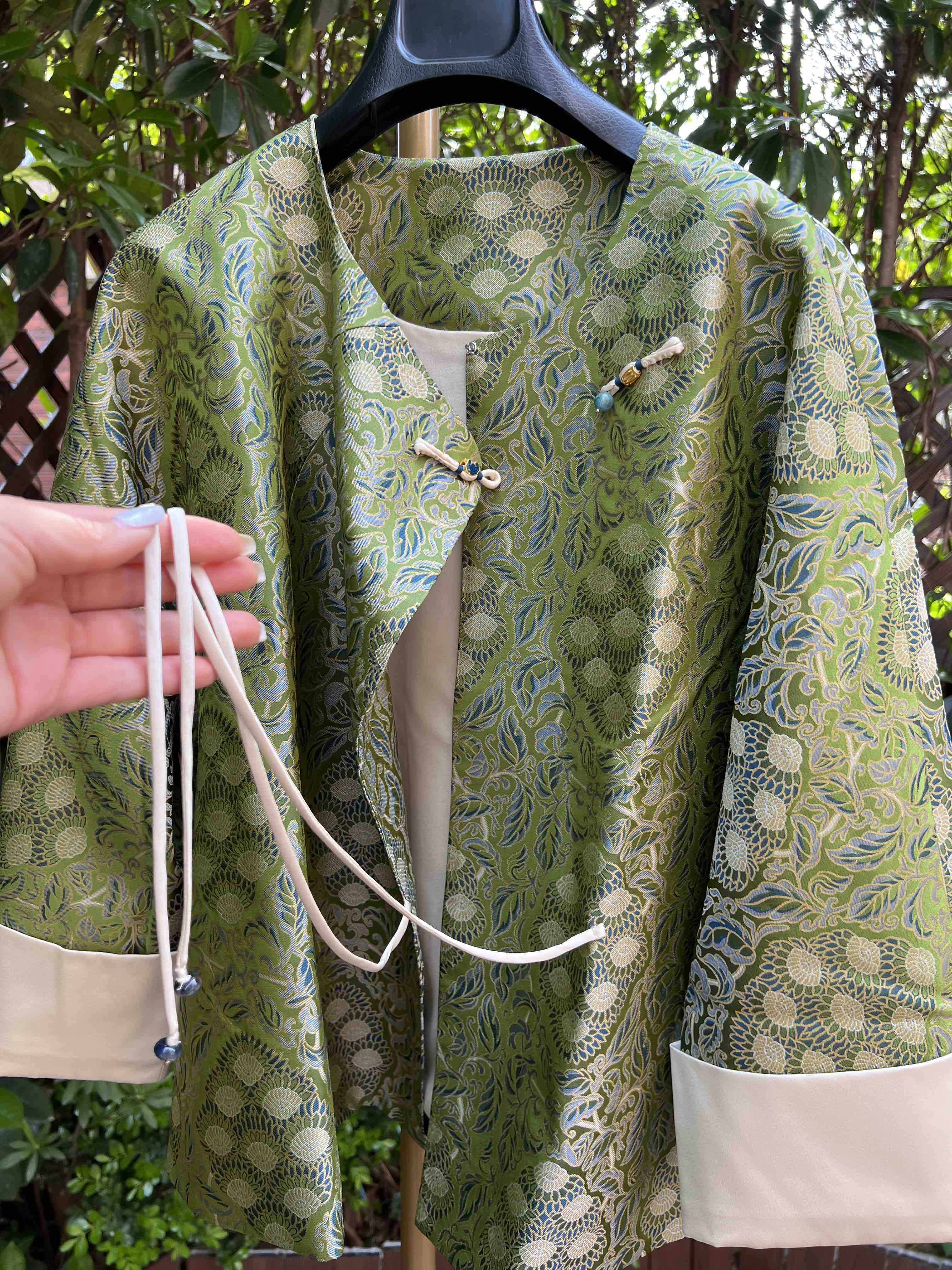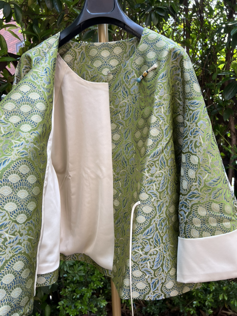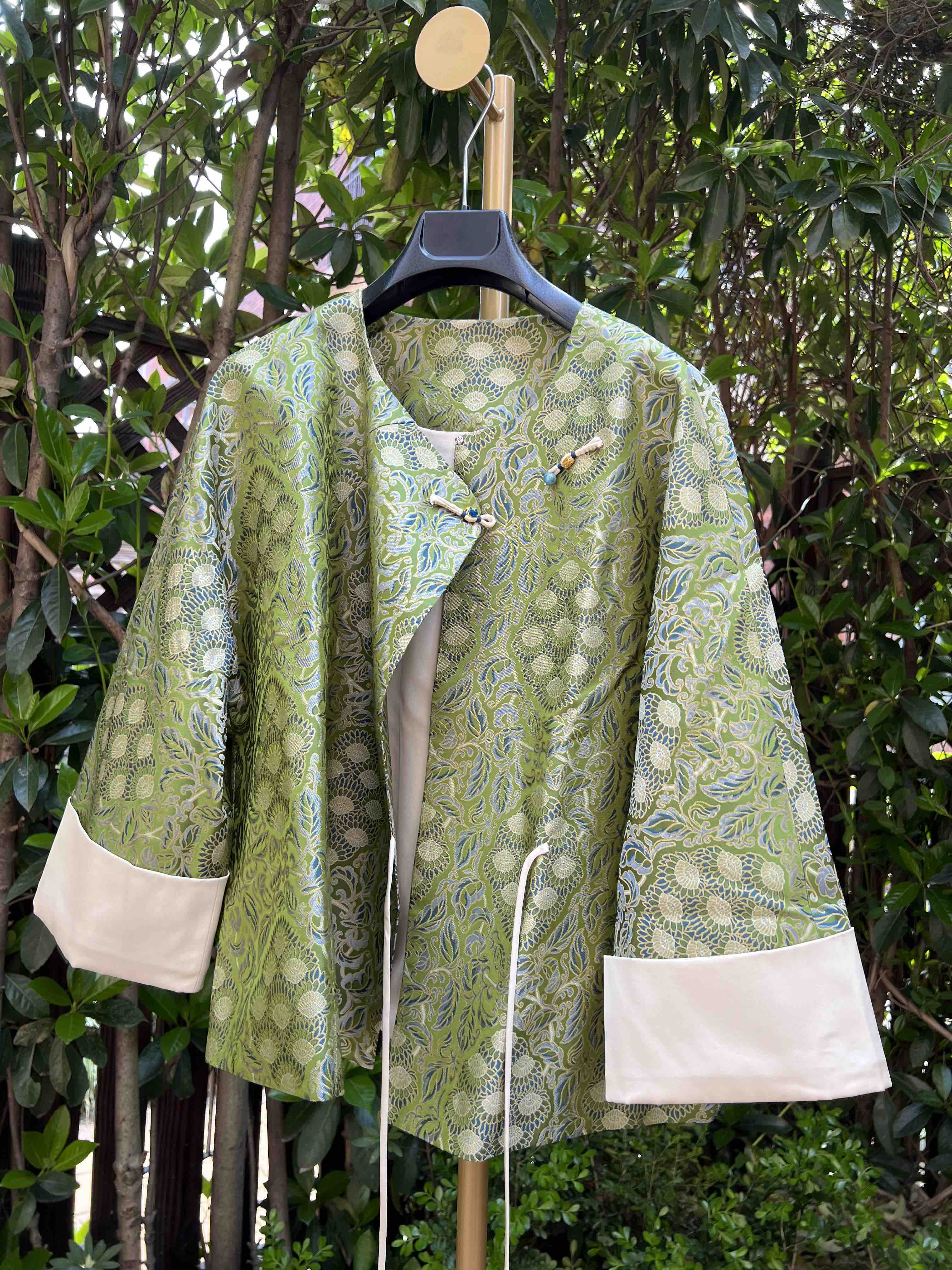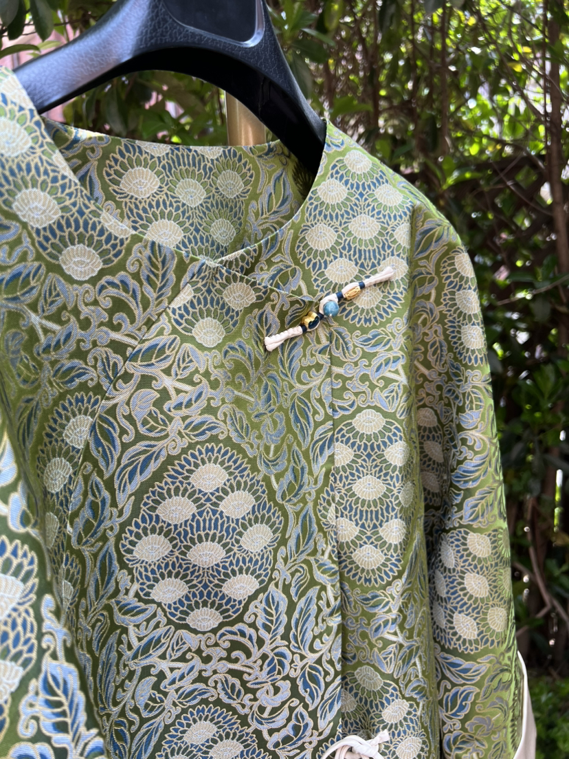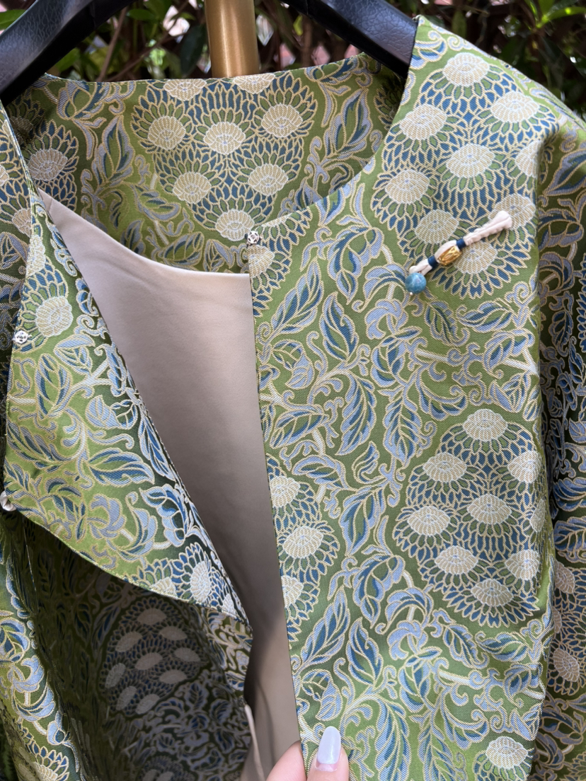百分百宋锦,温润怡人透气两双,完全不是普通织锦的烧灼感。这件上衣很吃面料,一等就是一个月。