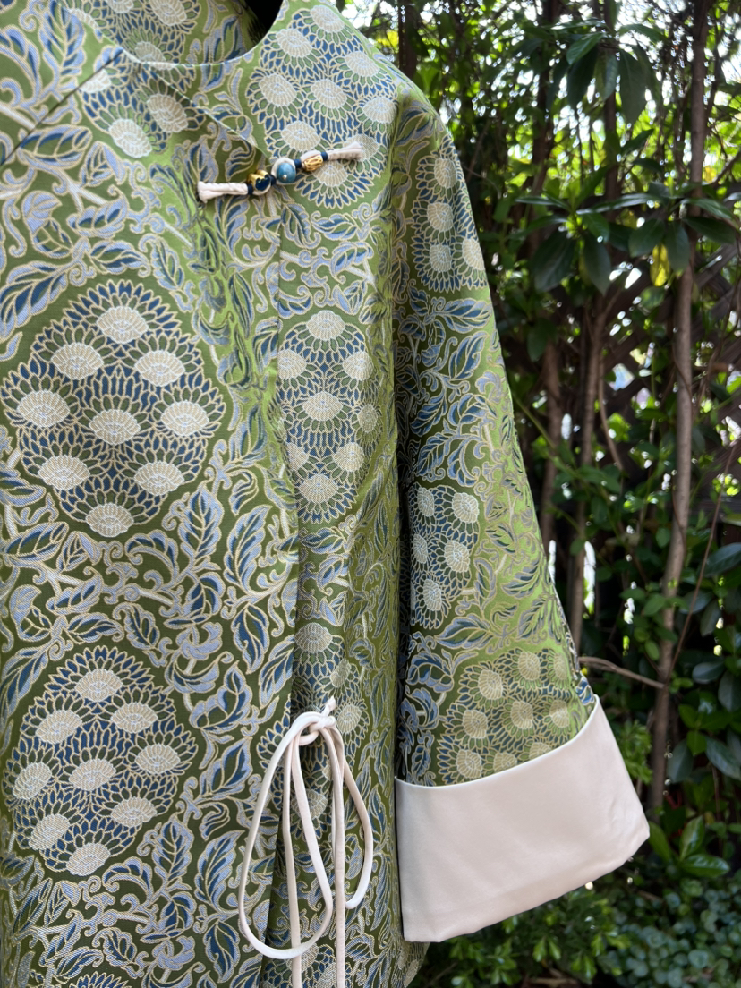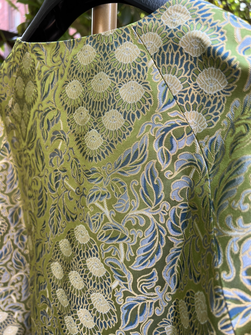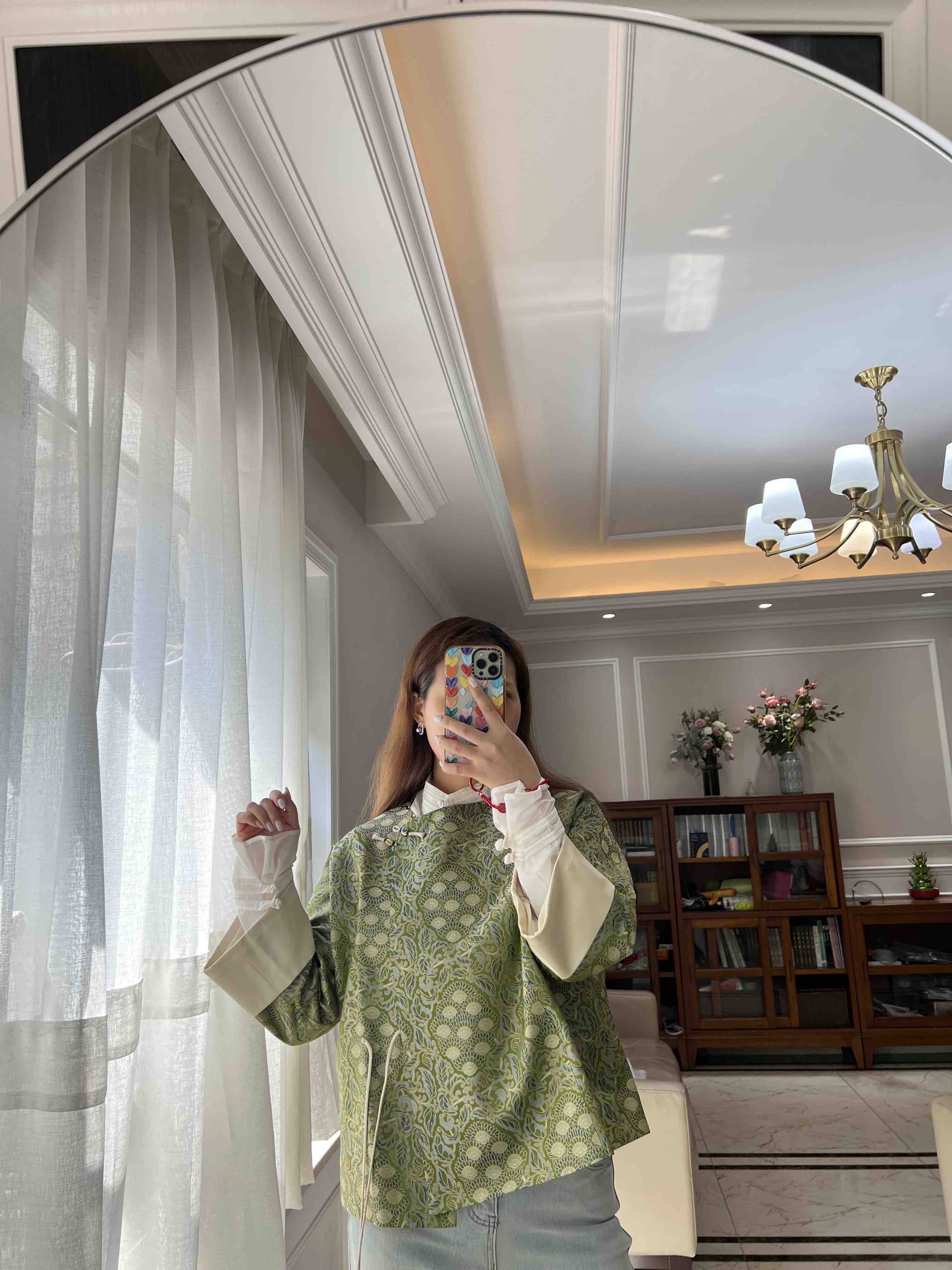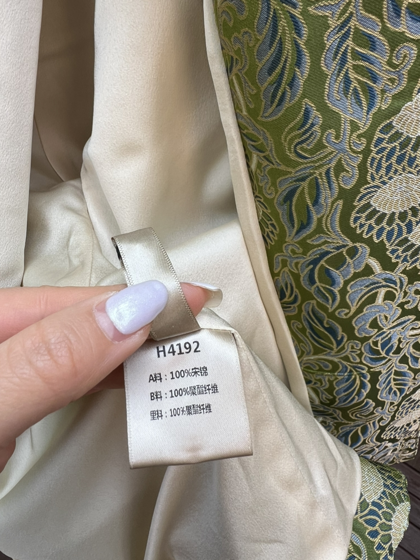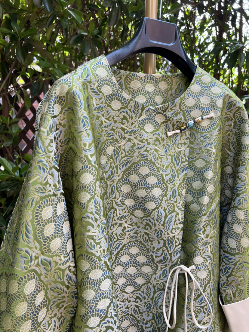 百分百宋锦,温润怡人透气两双,完全不是普通织锦的烧灼感。这件上衣很吃面料,一等就是一个月。