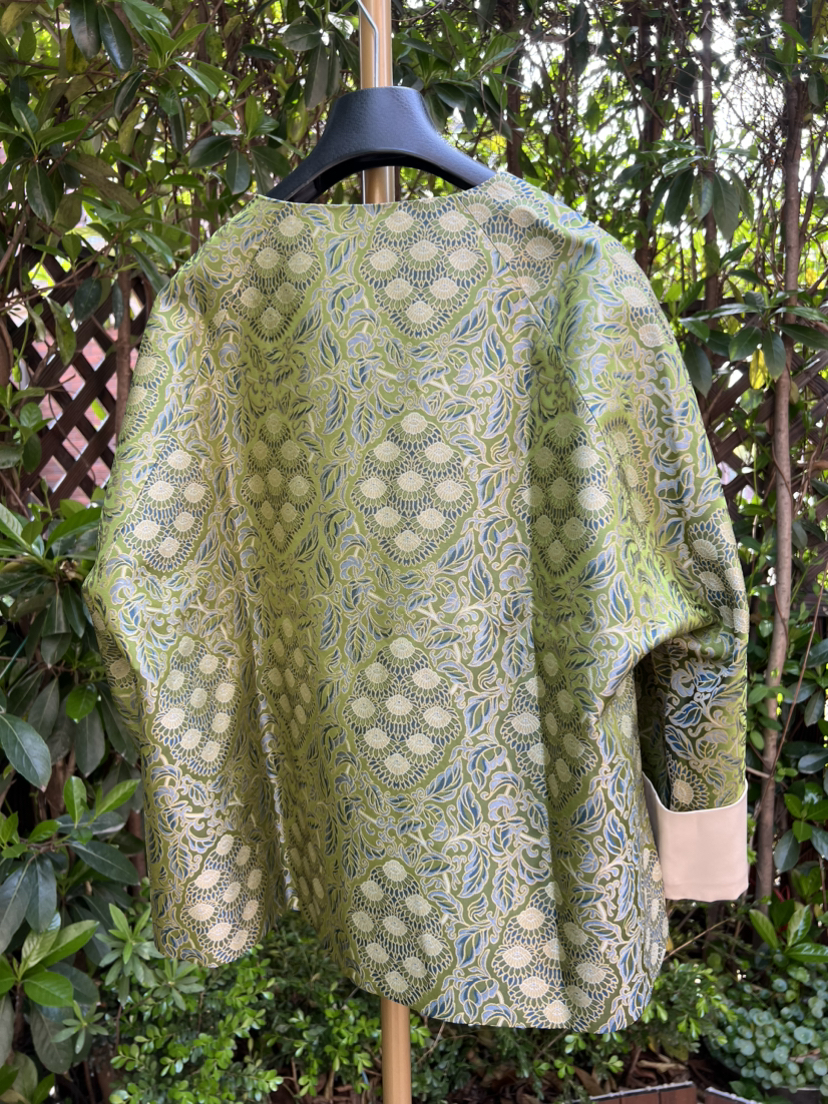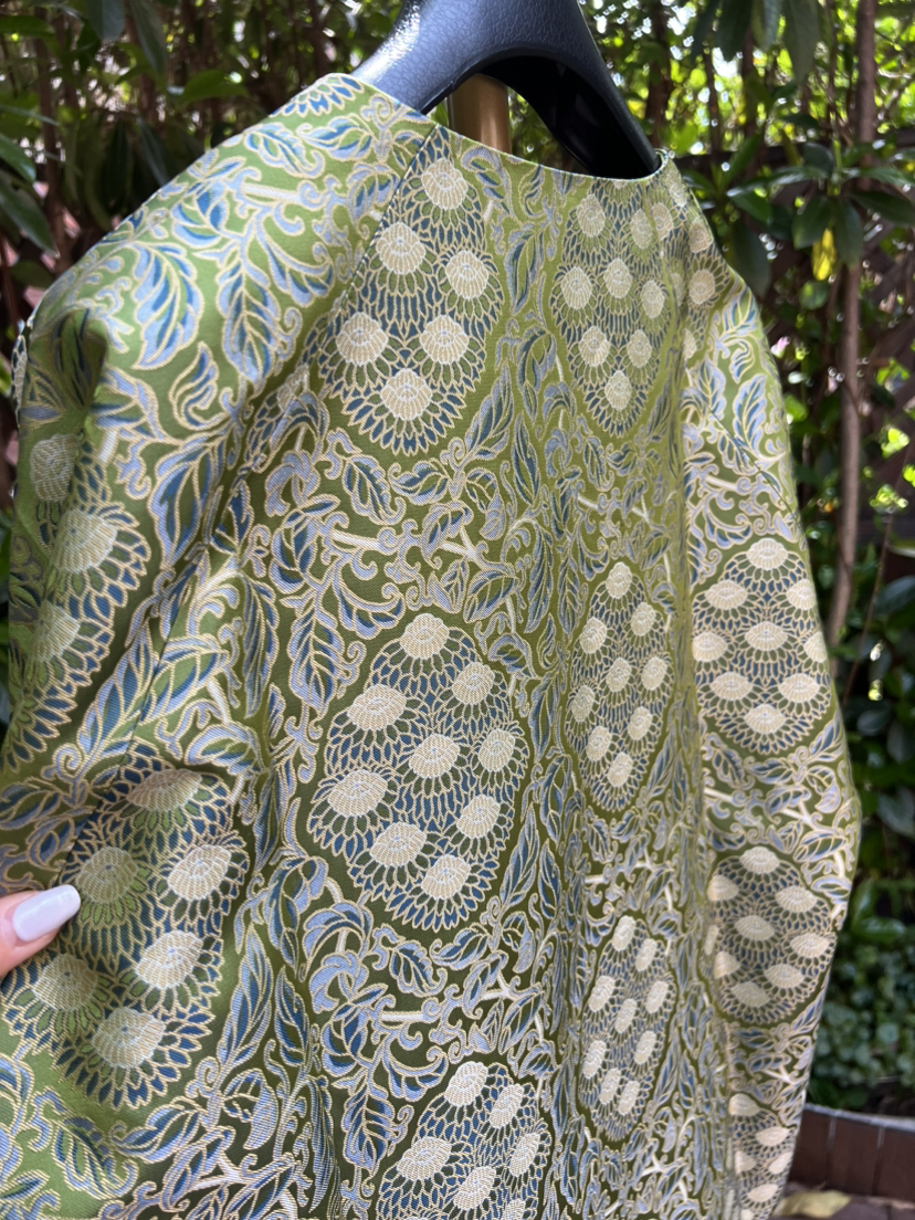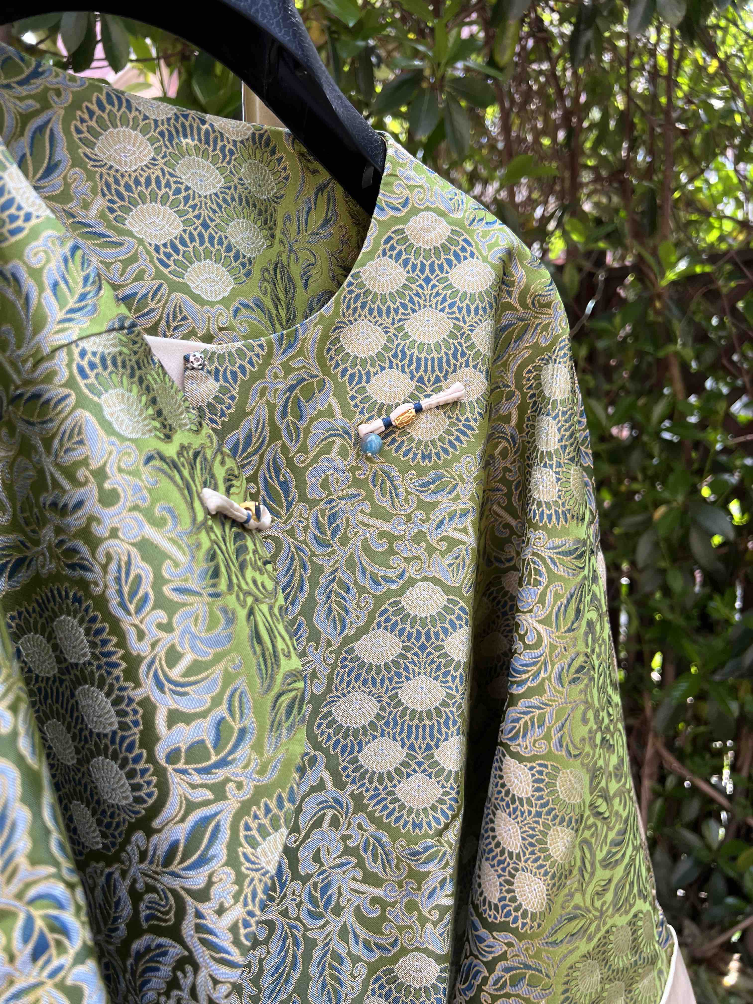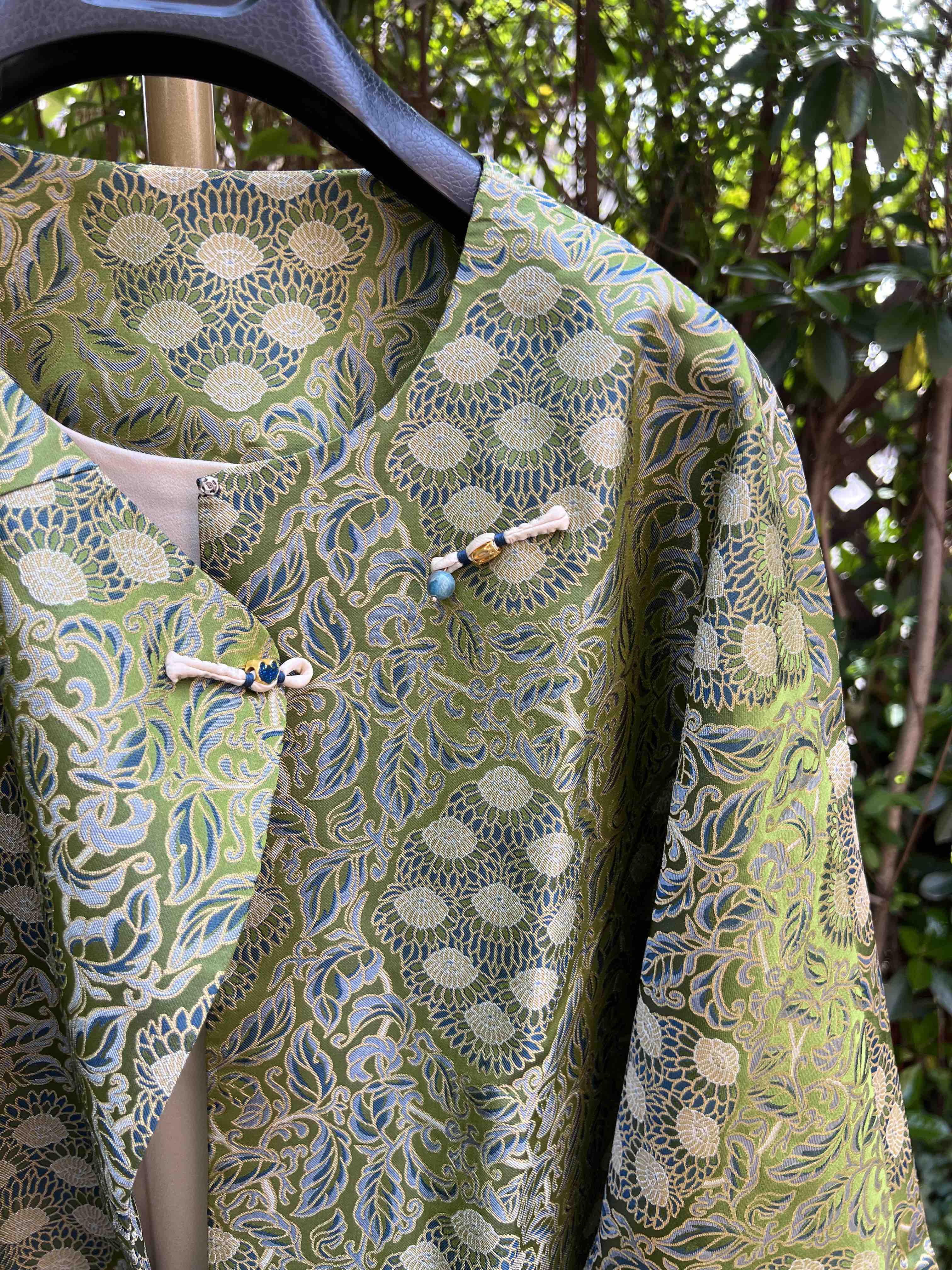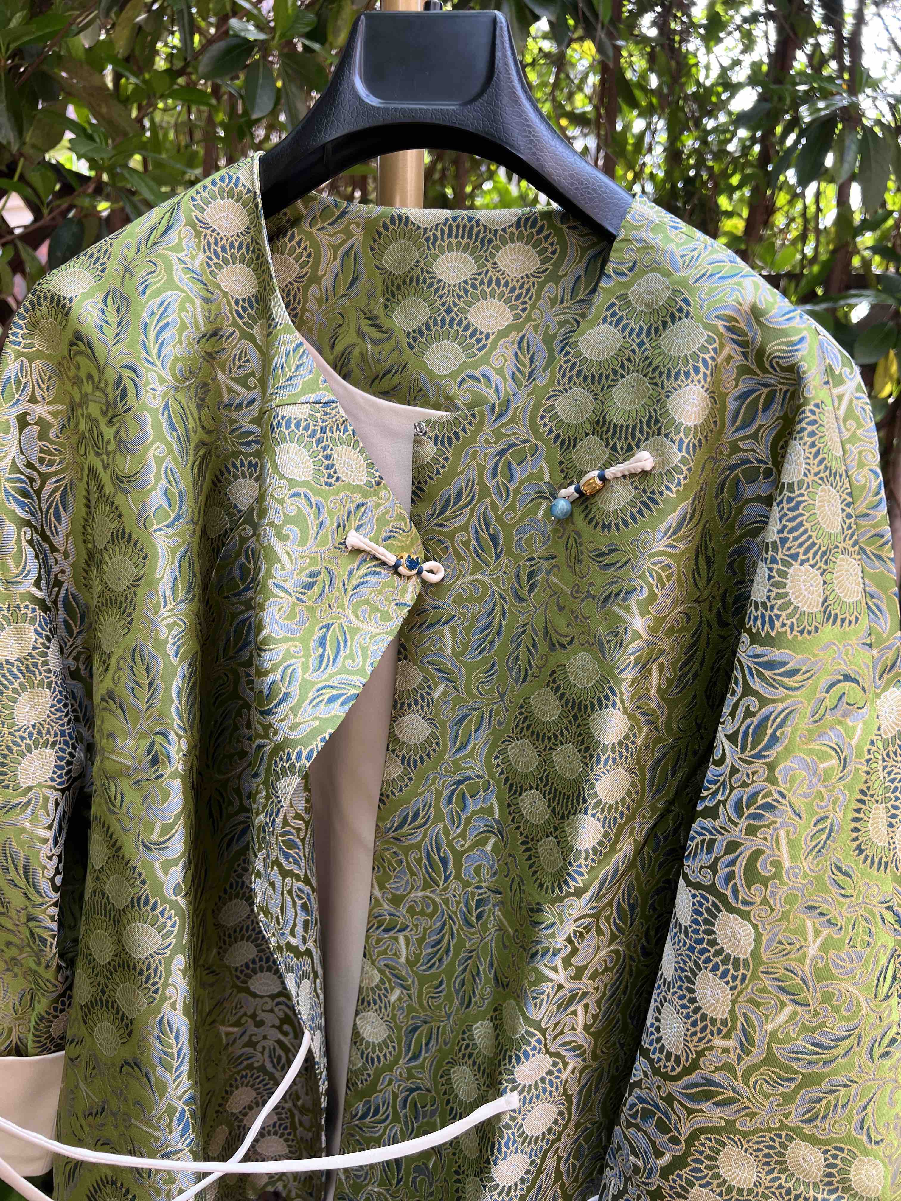 百分百宋锦,温润怡人透气两双,完全不是普通织锦的烧灼感。这件上衣很吃面料,一等就是一个月。