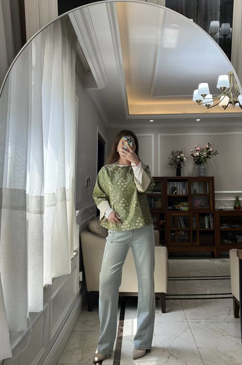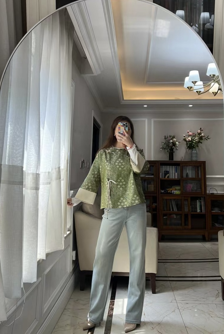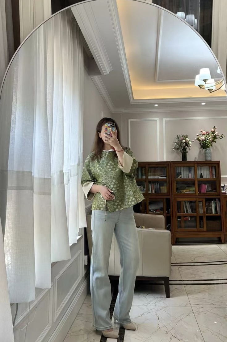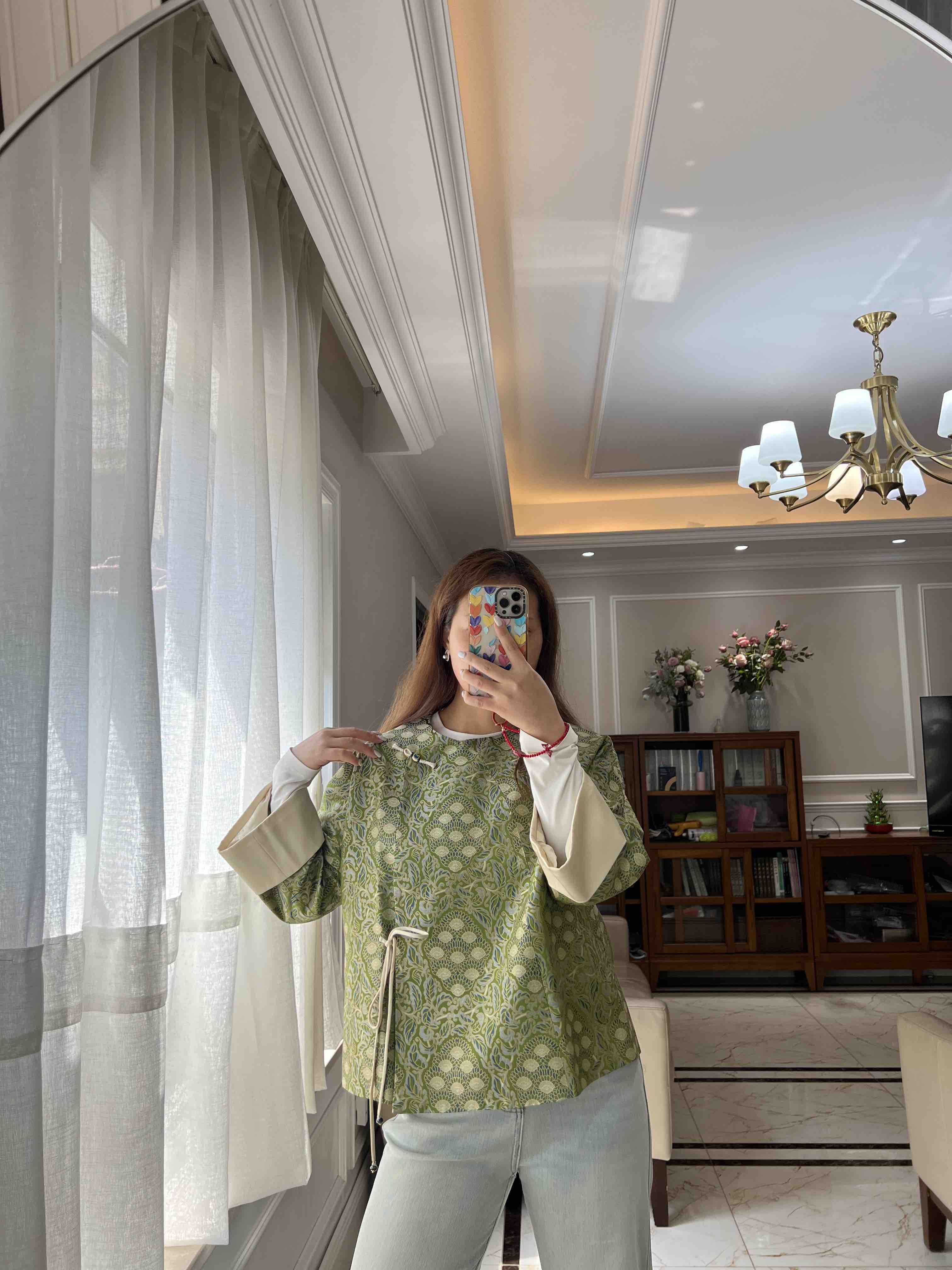 版型是360度无死角,相当考研剪裁功力,搭配白色阔腿裤,或者浅色牛仔裤都可以。根本不需要成套新中式搭配,解开领口和系带,真正的宋锦是自然垂坠的效果,露出内搭的T恤,也是相当的好看。
