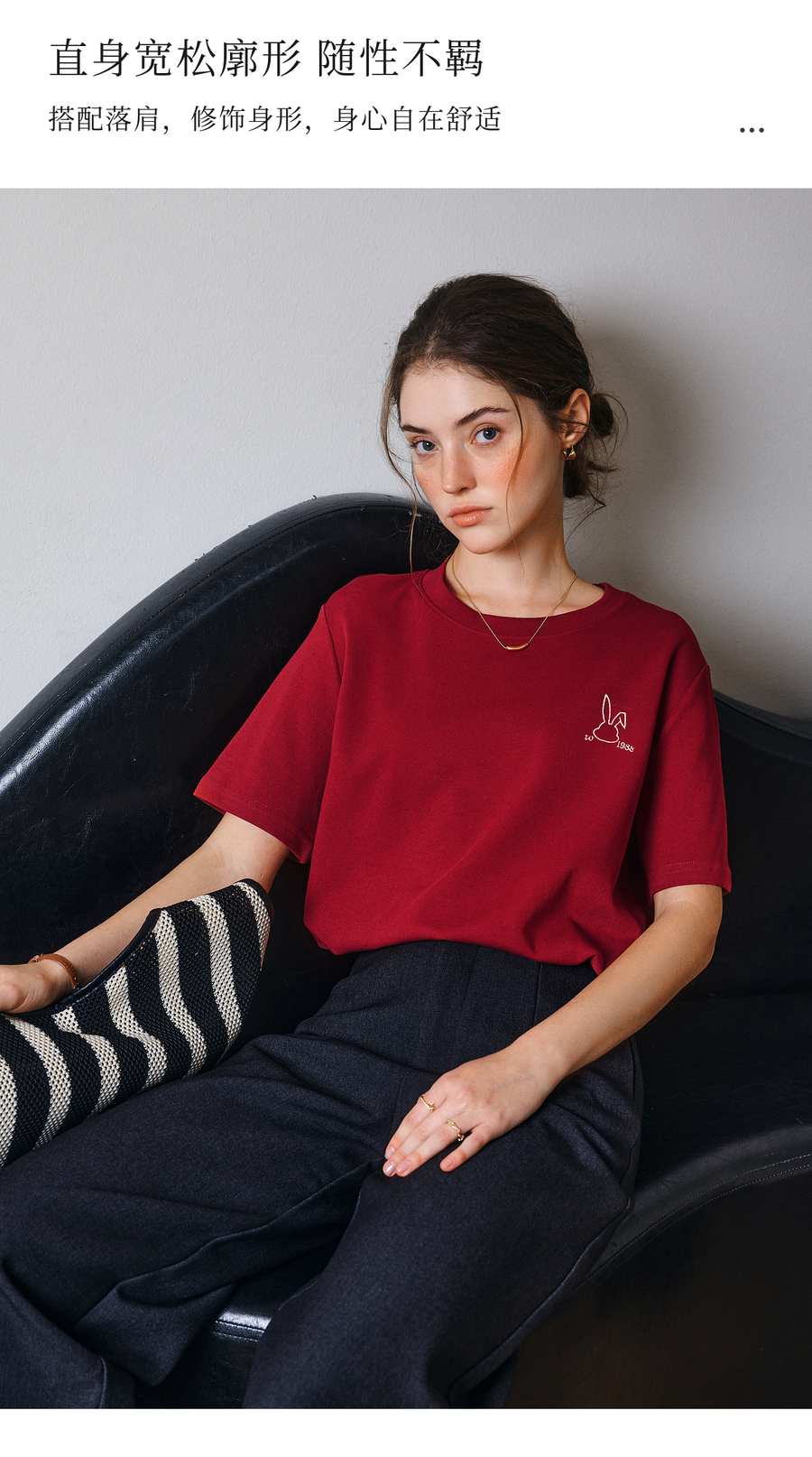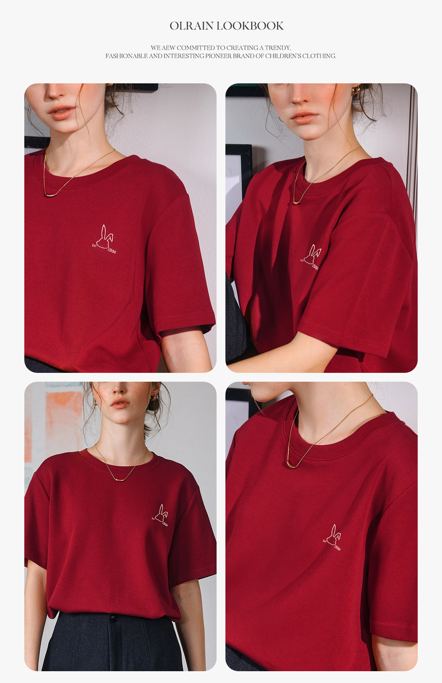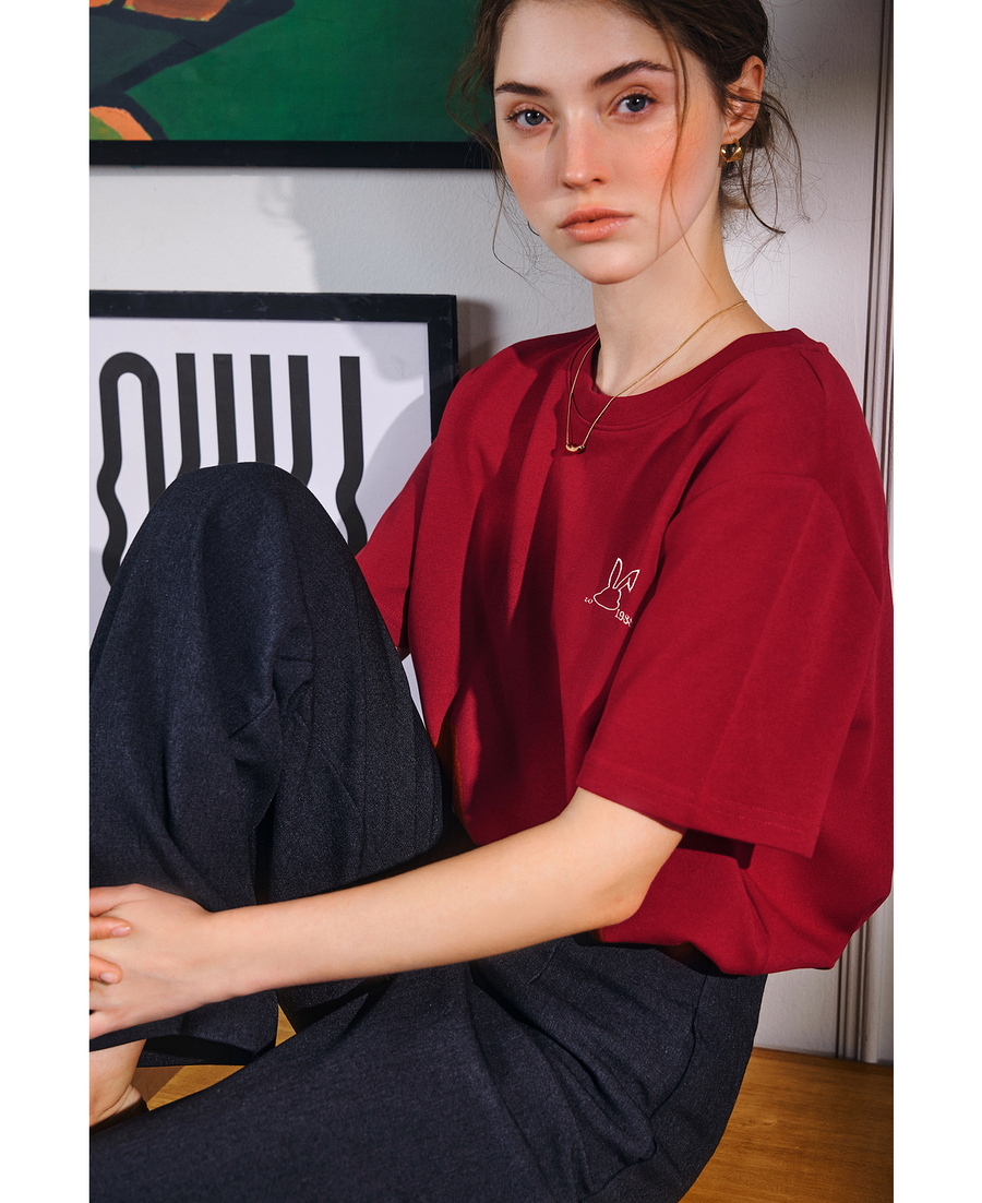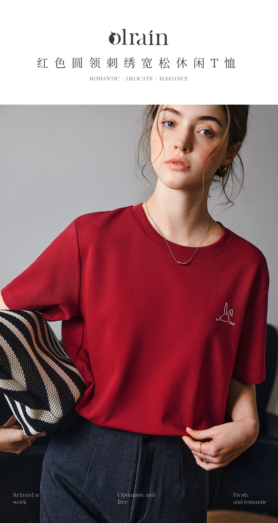 OLrain欧芮儿红色短袖T恤女夏季2025年新款百搭刺绣圆领上衣