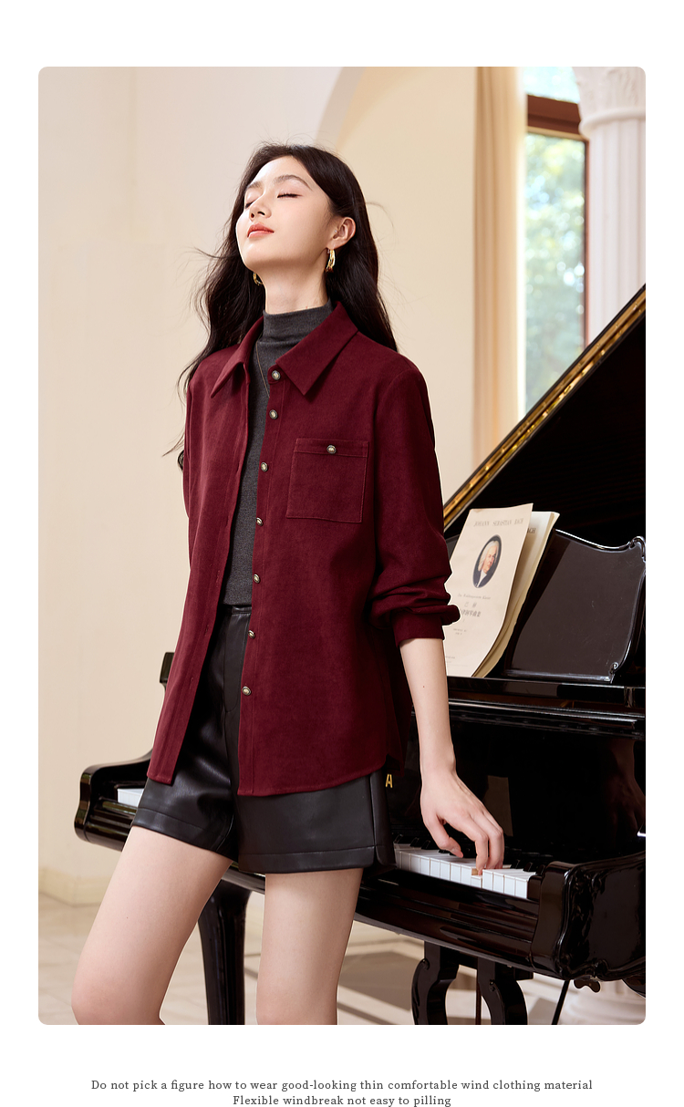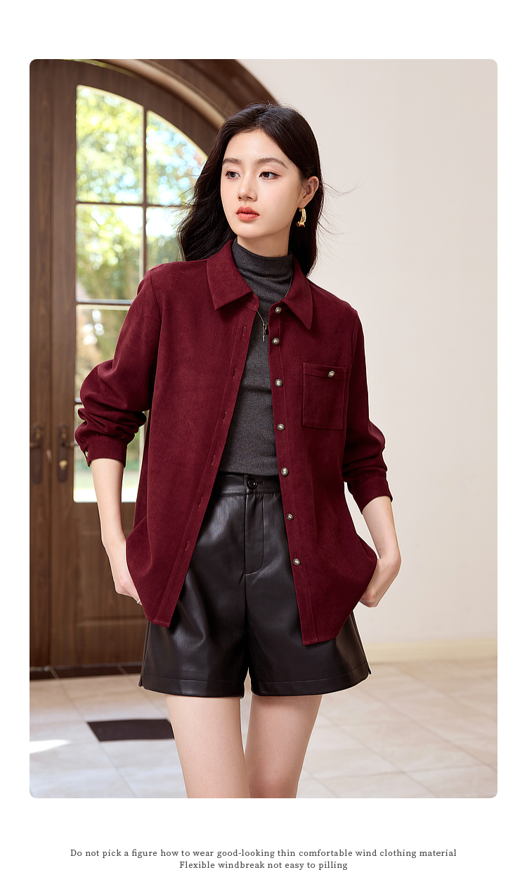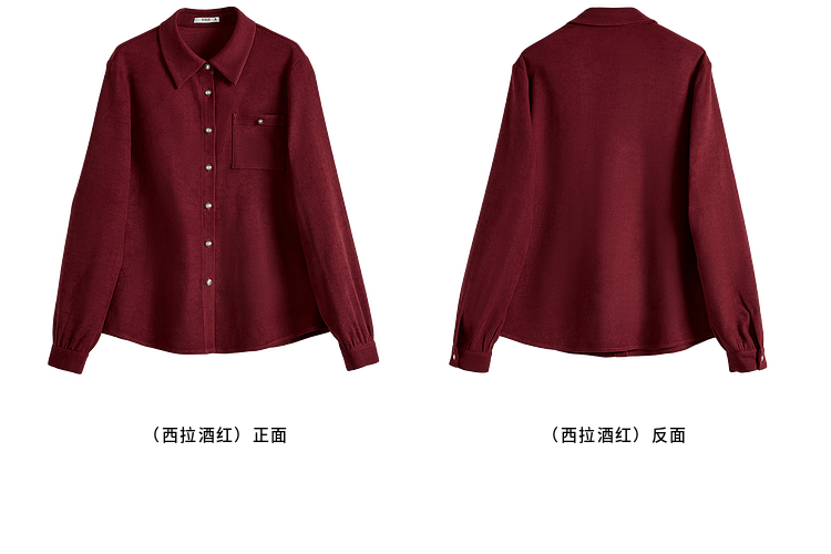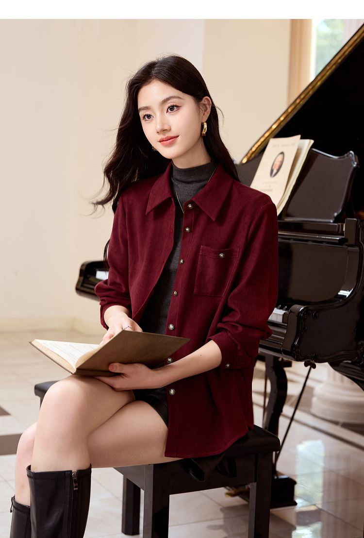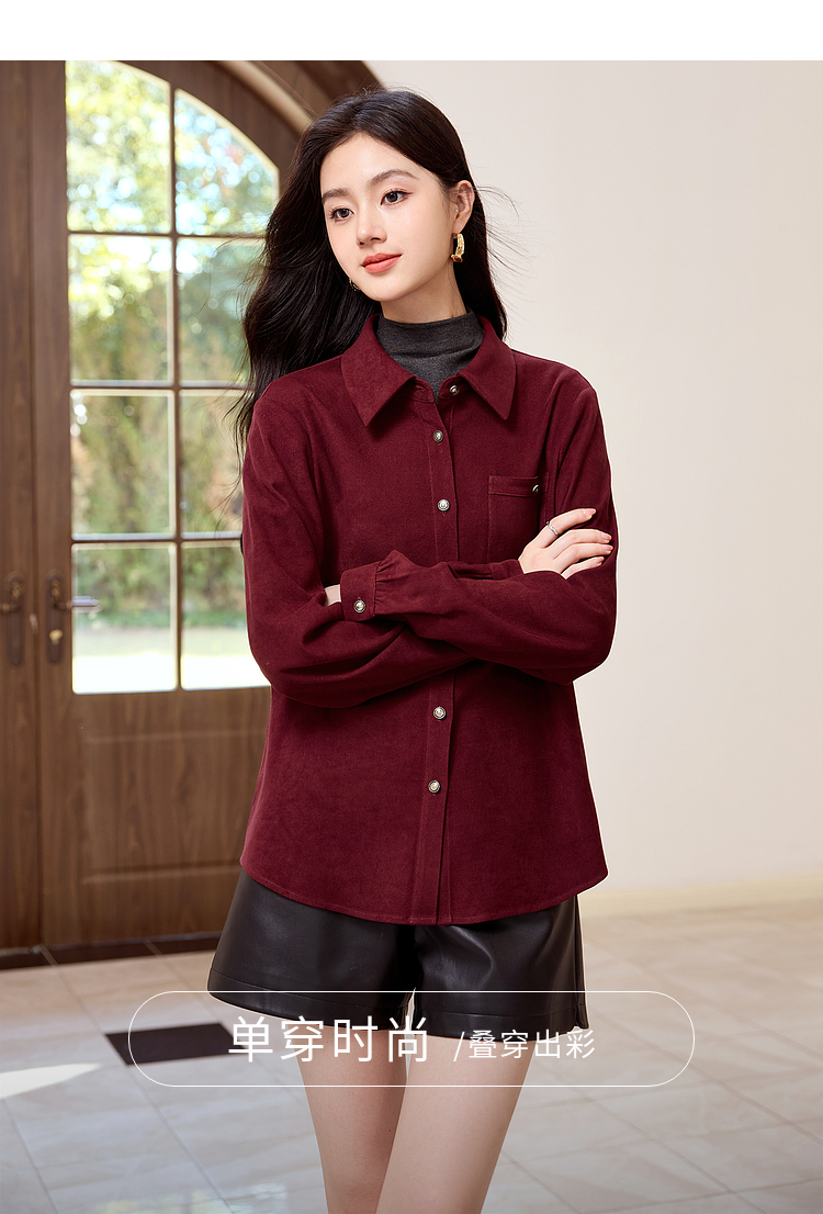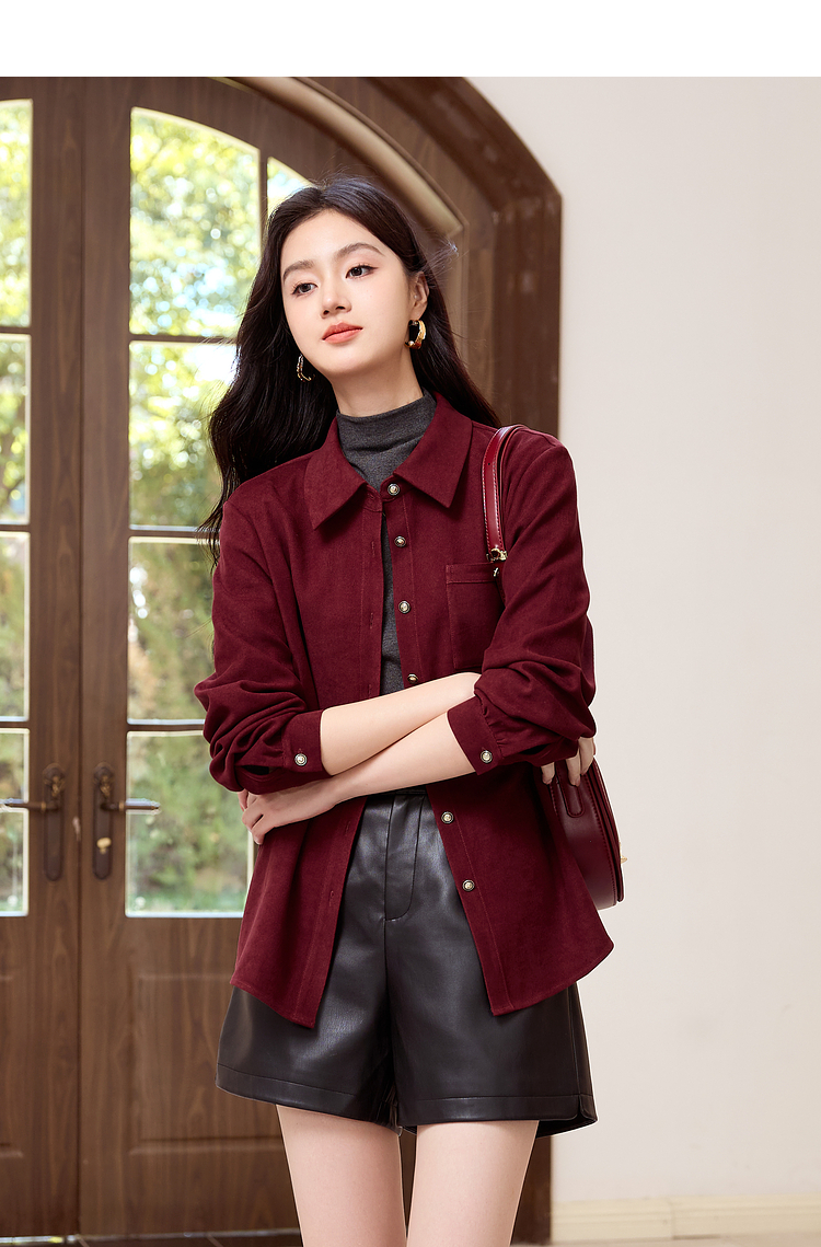 【年货节】熙世界法式复古酒红色磨毛衬衫女秋冬2025年新款叠穿长袖衬衣外套