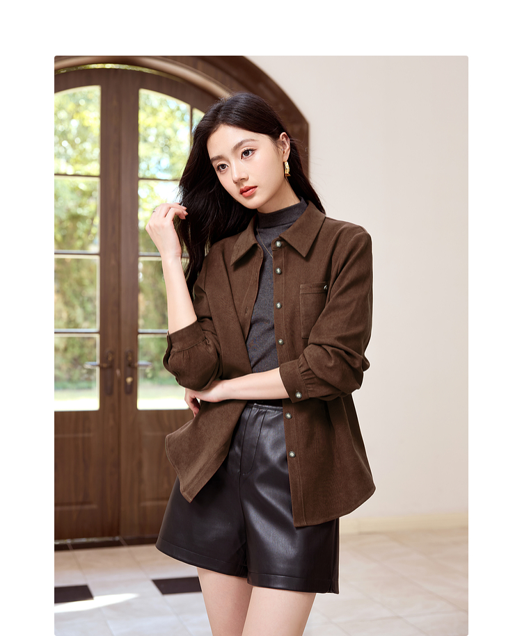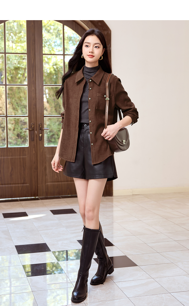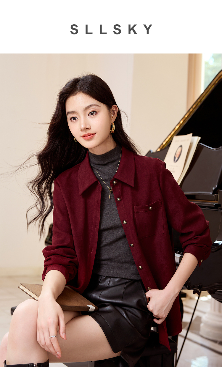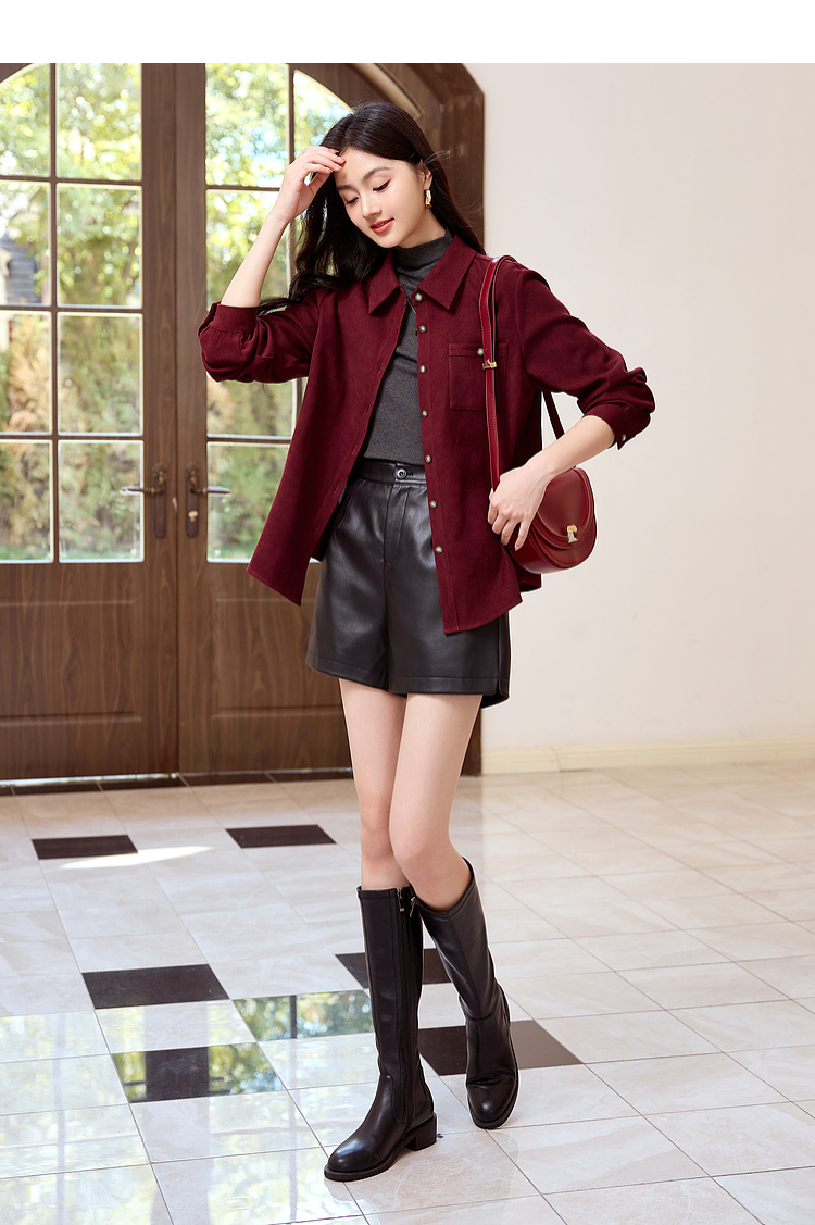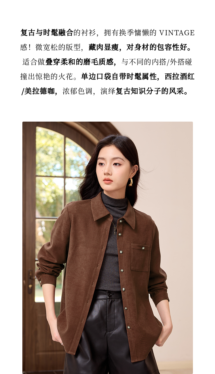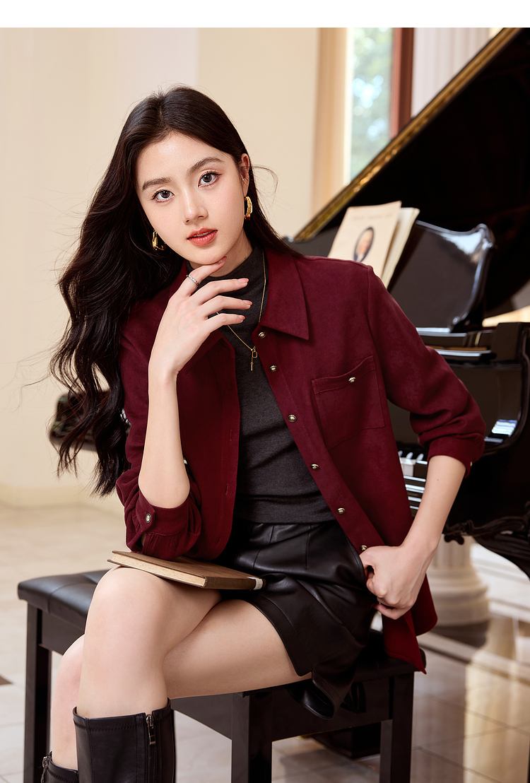 【年货节】熙世界法式复古酒红色磨毛衬衫女秋冬2025年新款叠穿长袖衬衣外套