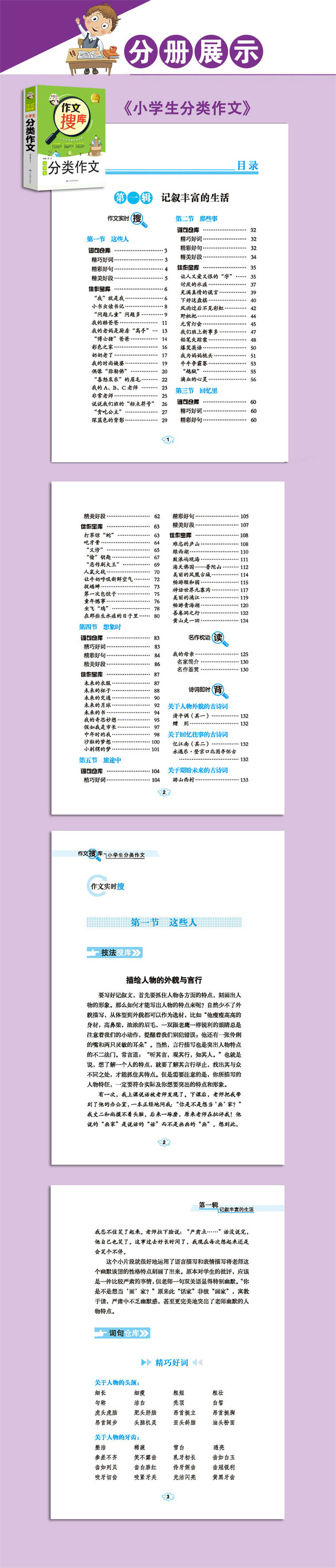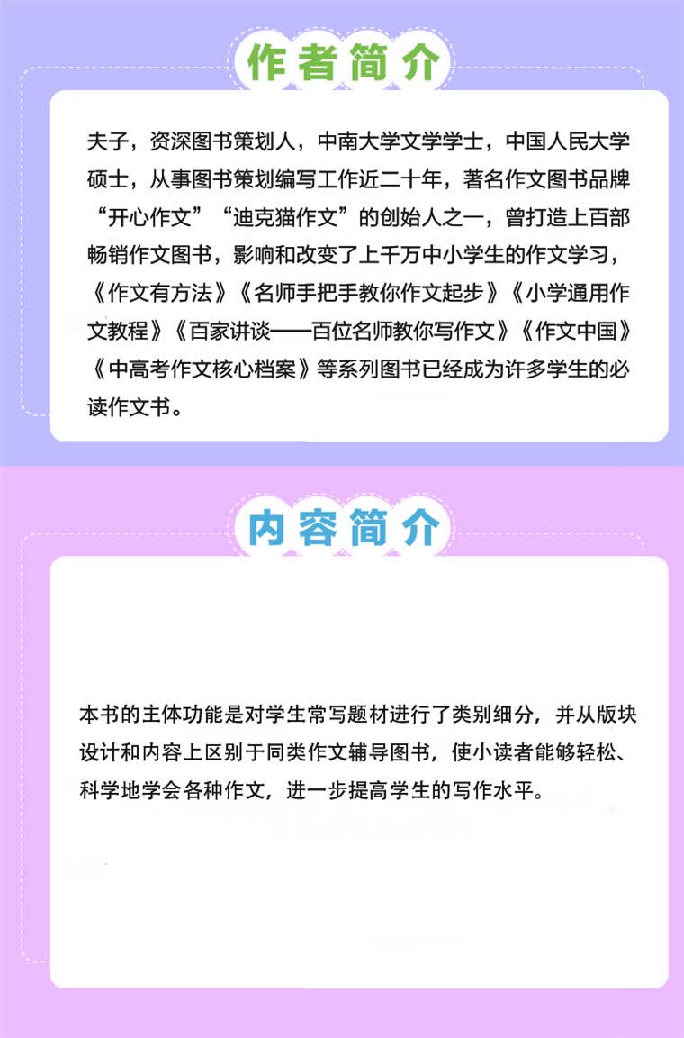 本书的主体功能是对学生常写题材进行了类别细分,并从版块设计和内容上区别于同类作文辅导图书,使小读者能够轻松、科学地学会各种作文,进一步提高学生的写作水平。