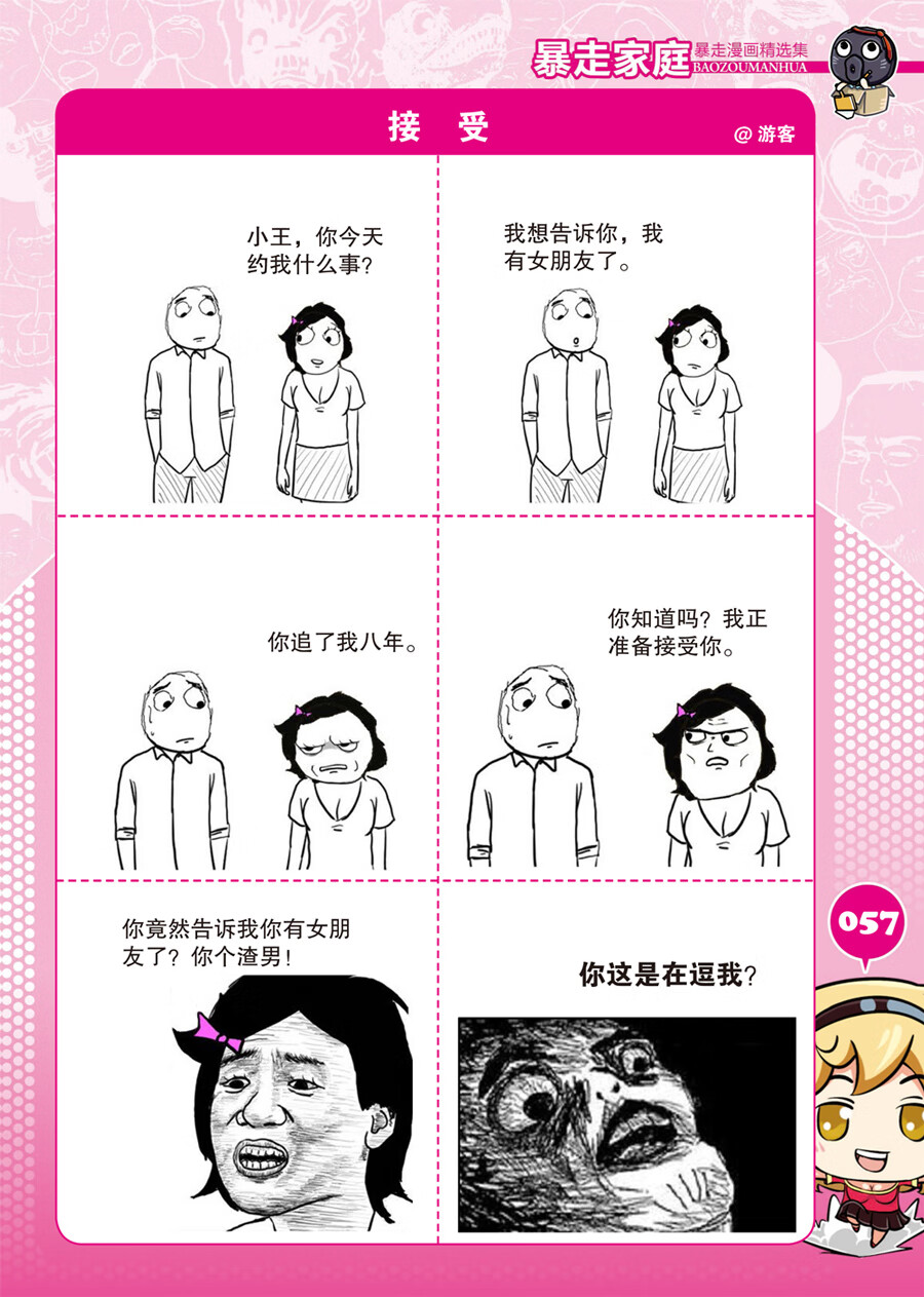 在QQ、微博等常用交流软件中,甚至是一些年轻人的屏保、自定义画像等地方,*近常常可以见到一些线条简陋、寓意通俗的漫画,它就是眼下年轻人热捧的“暴走漫画”。你可以质疑它的“口味”为何这么重,但要明白,如果你没看过,那才是真正OUT了。