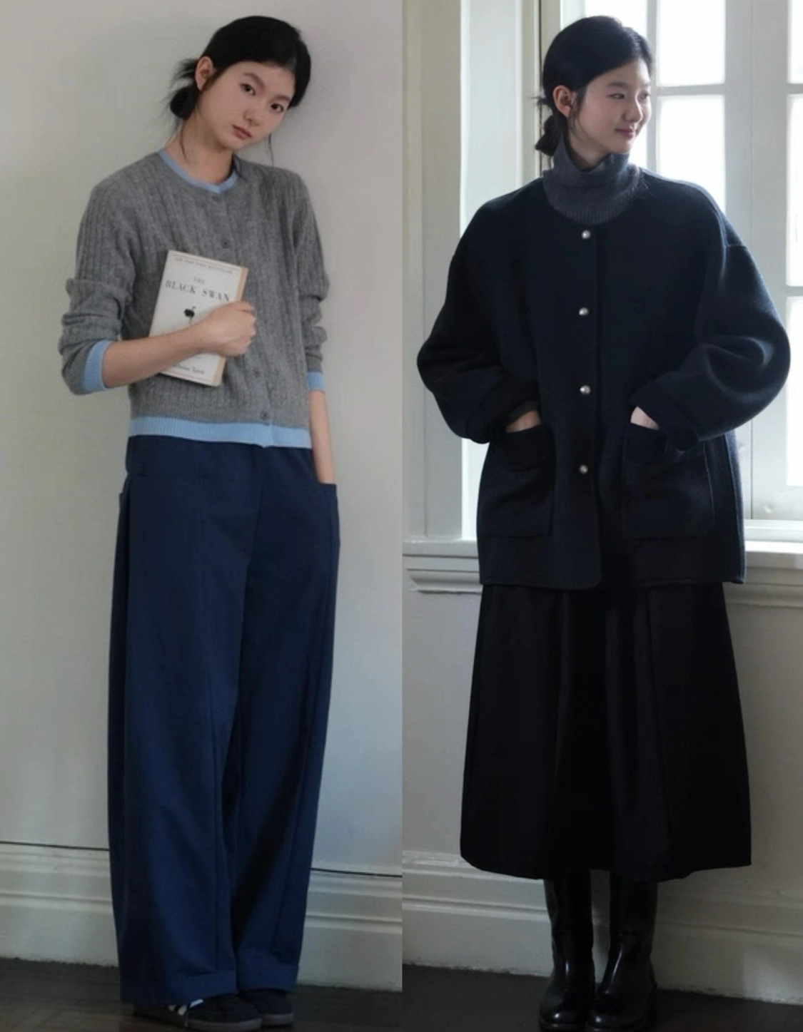 做了灰色拼蓝色、黑色拼白色。两组高级色系,