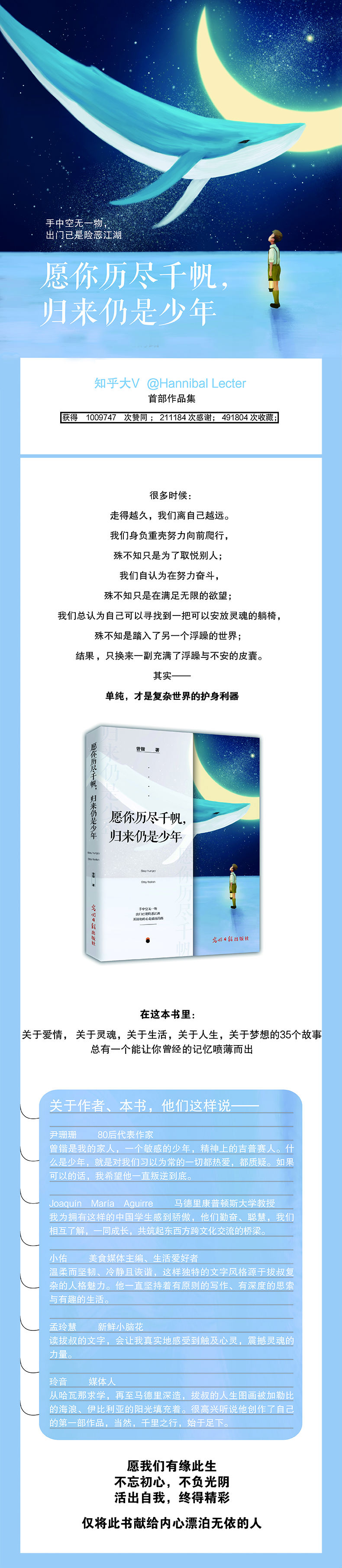 在这本曾锴著的《愿你历尽千帆归来仍是少年》里:关于爱情,关于灵魂,关于生活,关于人生,关于梦想的35个故事,总有一个能让你最初的记忆喷薄而出。