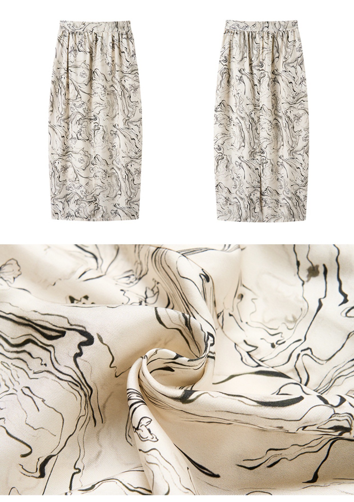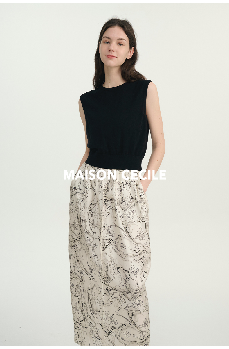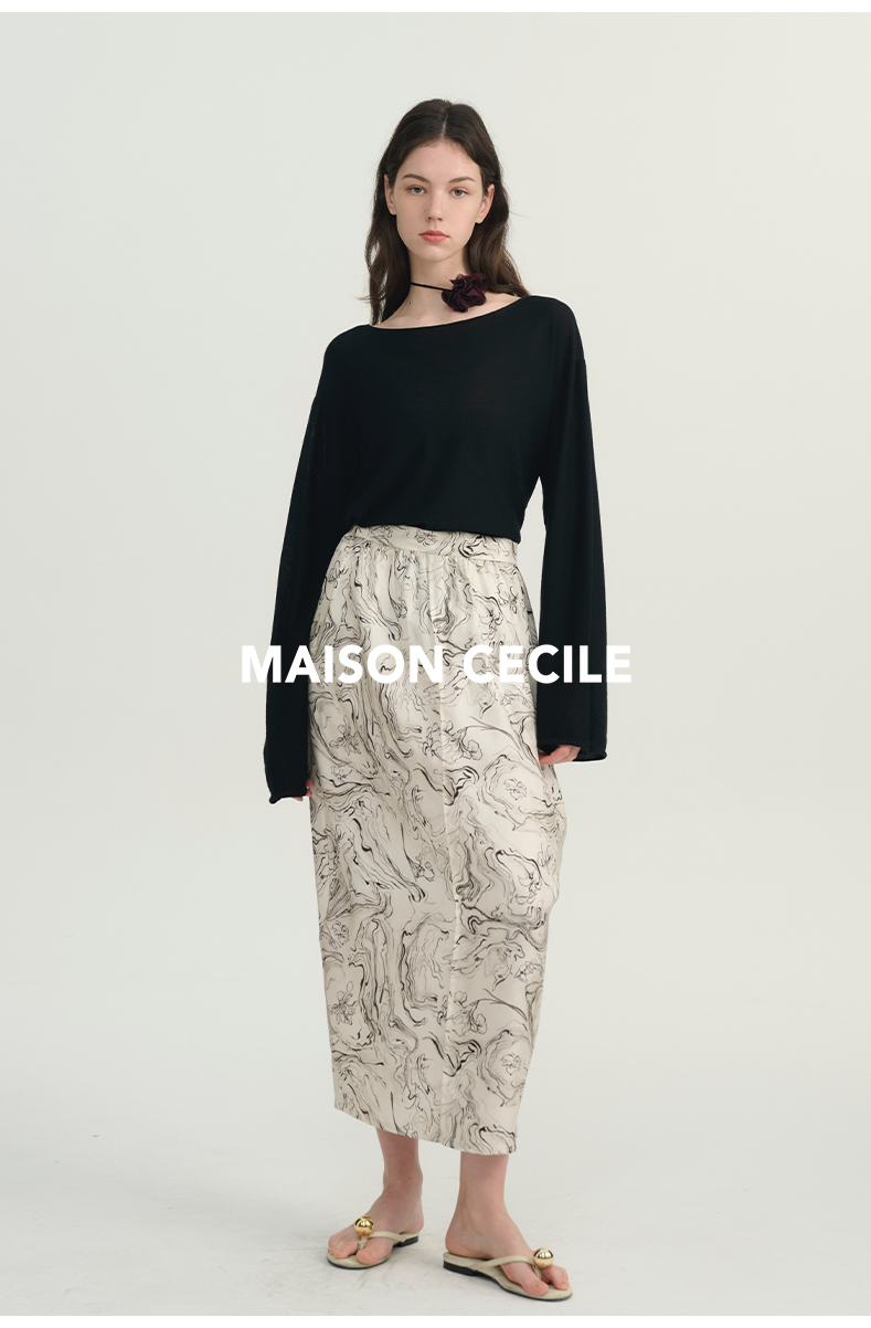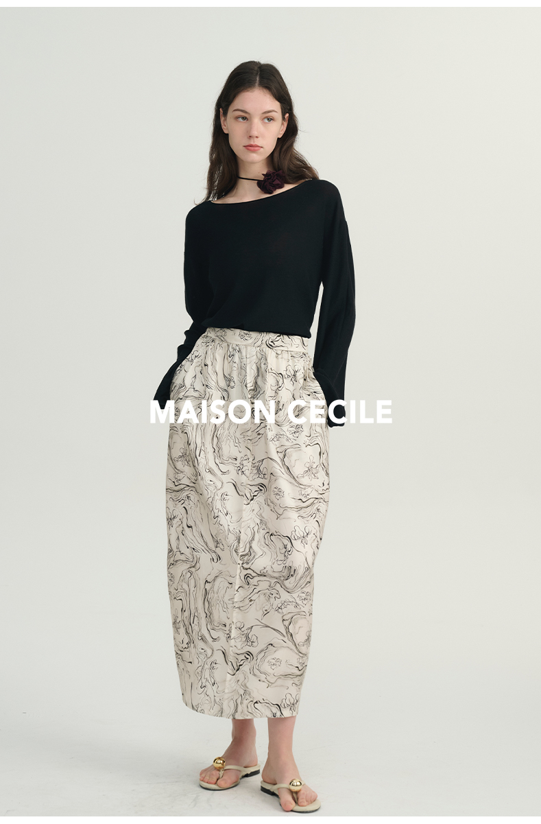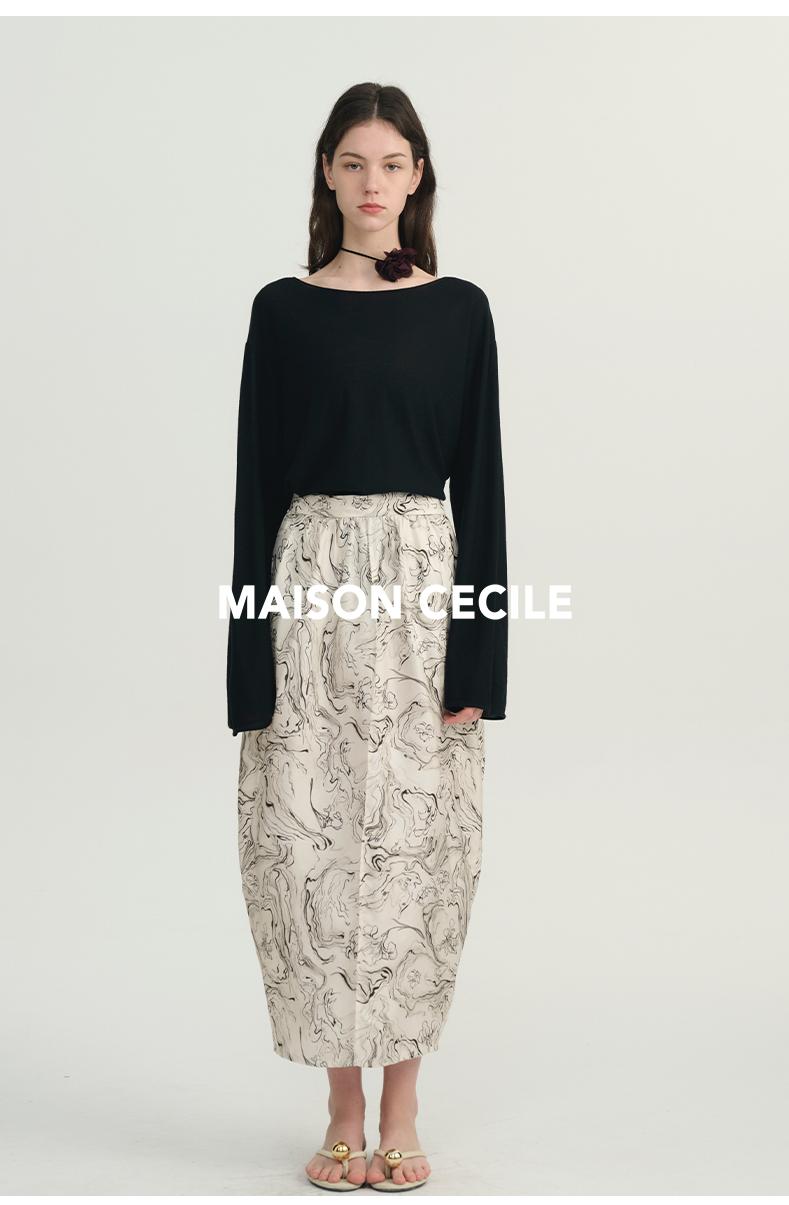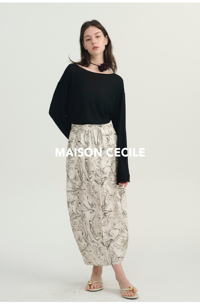 MAISON CECILE印花/黑色艺术立体斜纹真丝桑蚕丝花苞半身裙