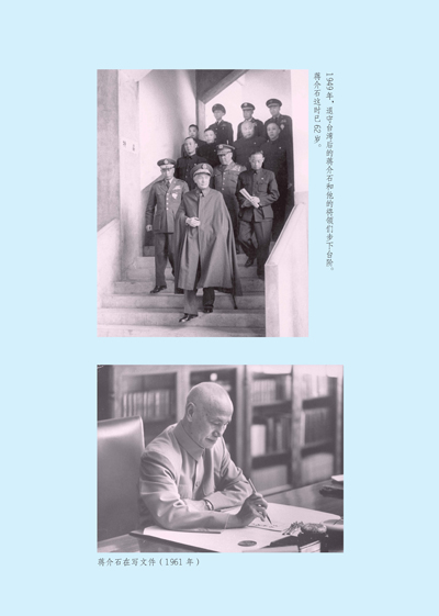每年元旦,他总要向全民发布文告,宣扬“反攻大陆”。在他漫长生涯的最后两年里,他两腿瘫痪,从而不再会客。他的文告只好停而不发或由人代发。