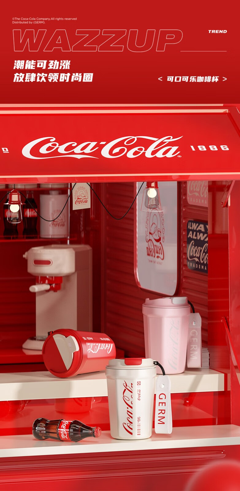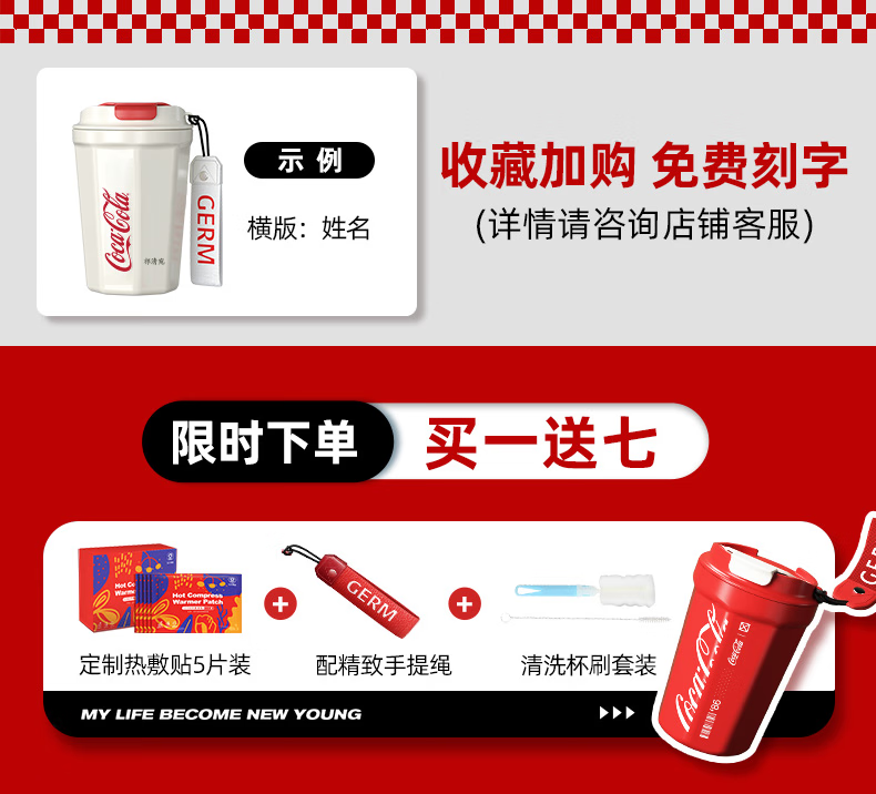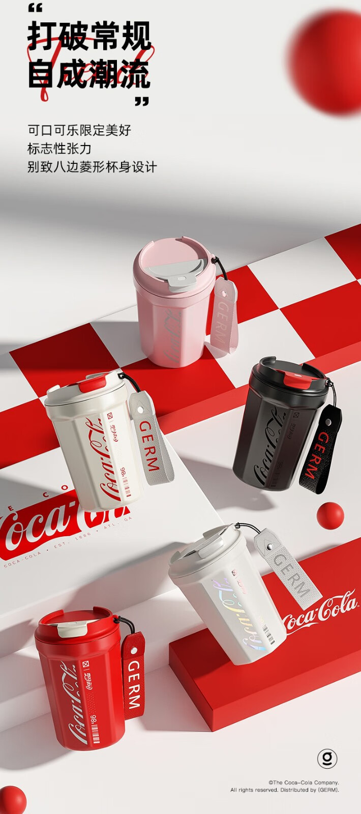 格沵(germ)可口可乐联名咖啡杯高颜值水杯男女士车载杯子大容量保温杯 红色菱形款390ML