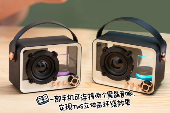 更支持 TWS 立体声播放, 当你同时连接2个黑晶音箱的时候, 就仿佛打开了通往另一个世界的神奇大门! 那震撼的音效,如同一波波汹涌澎湃的能量浪潮,将你彻底包围! 每一个音符都像是拥有了生命,在你的耳边跳跃、狂欢! 左右声道的完美配合,让你仿佛置身于一个巨大的音乐舞台中央, 周围是无数的音乐家在为你倾情演奏! 你能感受到声音从四面八方涌来,将你托起,带入那无比美妙的音乐仙境! TWS 立体声,就是声音的极致盛宴, 让你的听觉体验超越想象,无可匹敌!