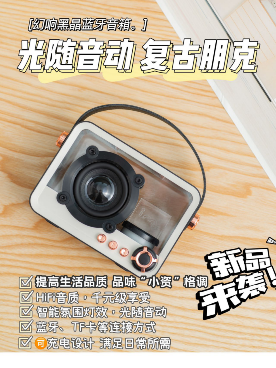 超级捡漏价的神器!! 这音质和颜值也太香了吧 全新升级 声音更加清晰饱满 在家也能自由嗨皮 灯光可跟随音乐跳动 既好看又好玩 正面大号喇叭 有控制按键 带皮质挂带。颜值丝毫不输高级家居摆件 随身携带也不占地方 音效升级 下沉式低音 性能小钢炮并非浪得虚名 360度环绕震撼高低音效 电池容量升级 持久续航 支持内存卡+手机蓝牙连接播放 多种连接方式 任何场景都可以使用 全天候陪伴分 霓虹灯光 烘托气氛 轰趴必不可少的