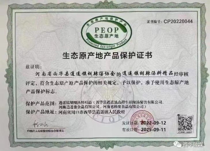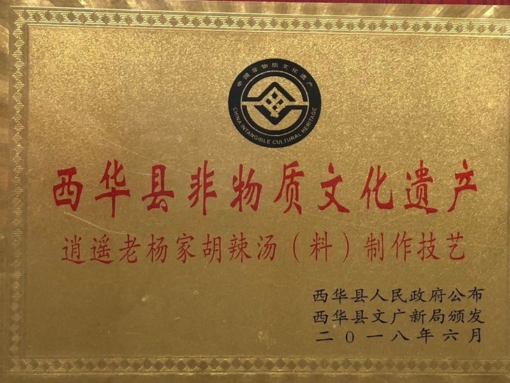2010年6月,逍遥胡辣汤制作技艺被纳入河南省非文化物质遗产 2018年6月,逍遥老杨家胡辣汤(料)制作技艺 被纳入西华县非物质文化遗产