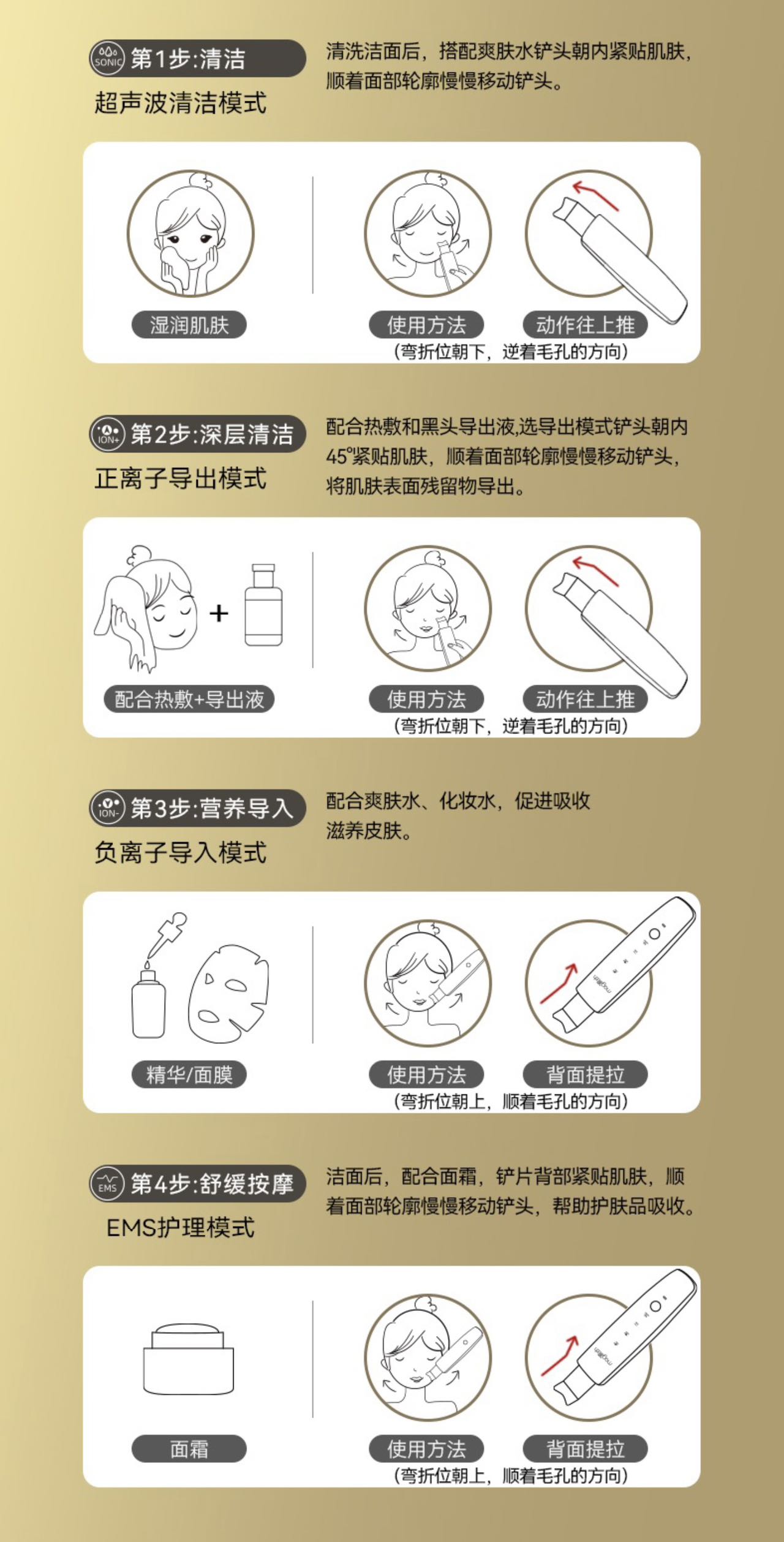 配合热敷和黑头导出液,选导出模式铲头朝内45°紧贴肌肤,顺着面部轮廓慢慢移动铲头,将肌肤表面残留物导出