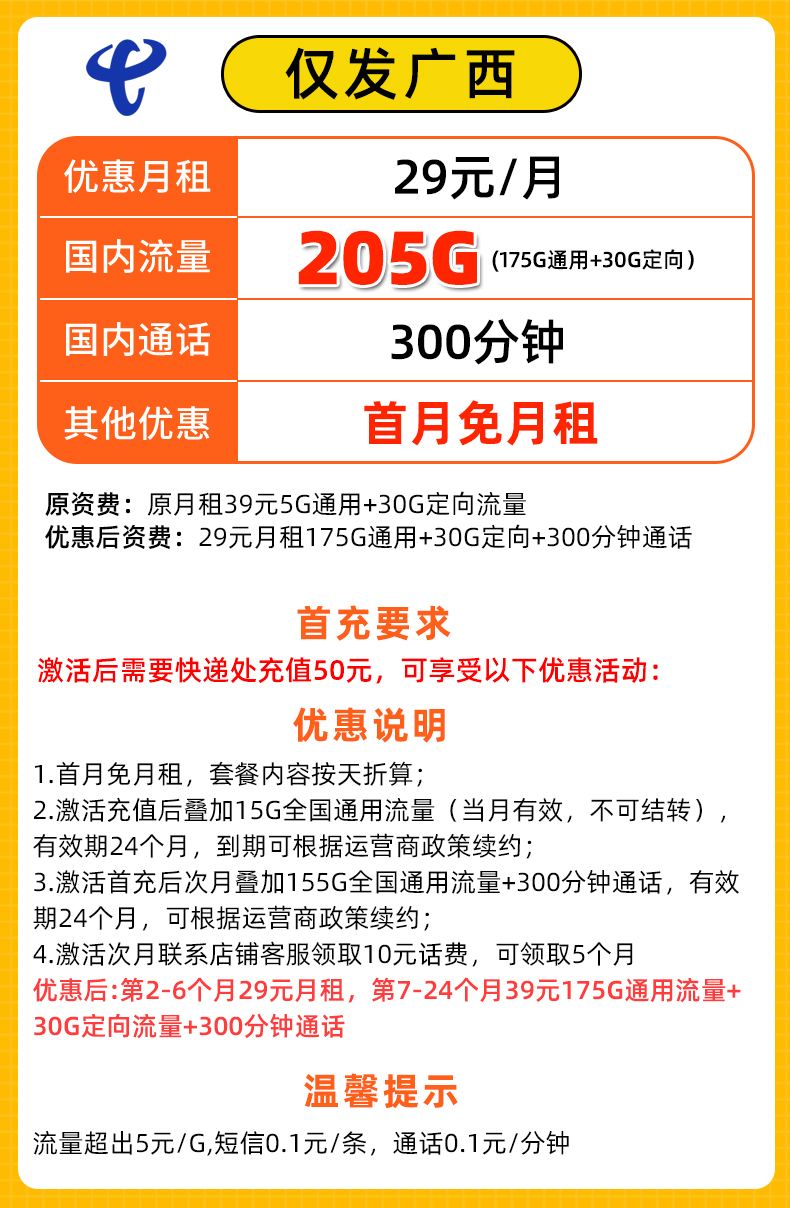 【只发广西】电信29元205G全国流量300分钟,首月免月租