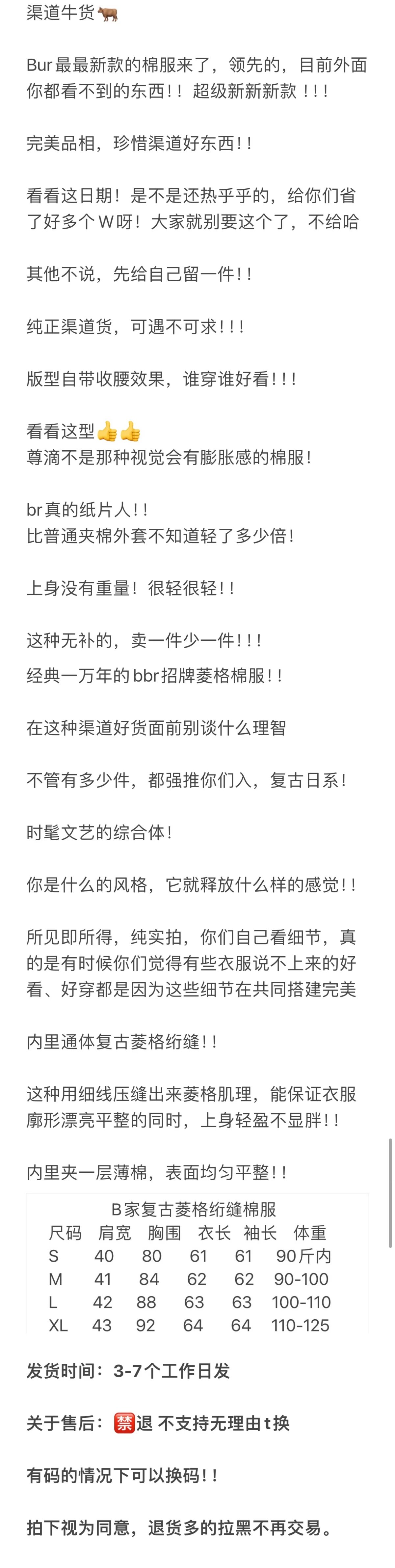 重磅渠道 牛货! bur25新款格纹棉服 经典棉服/绗缝奶奶谷仓棉服外套