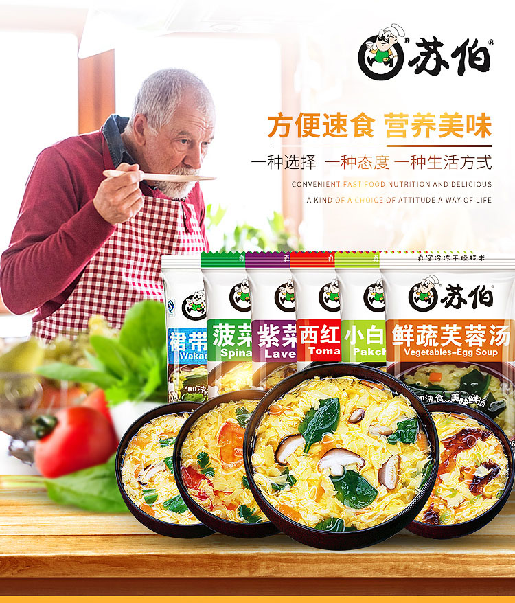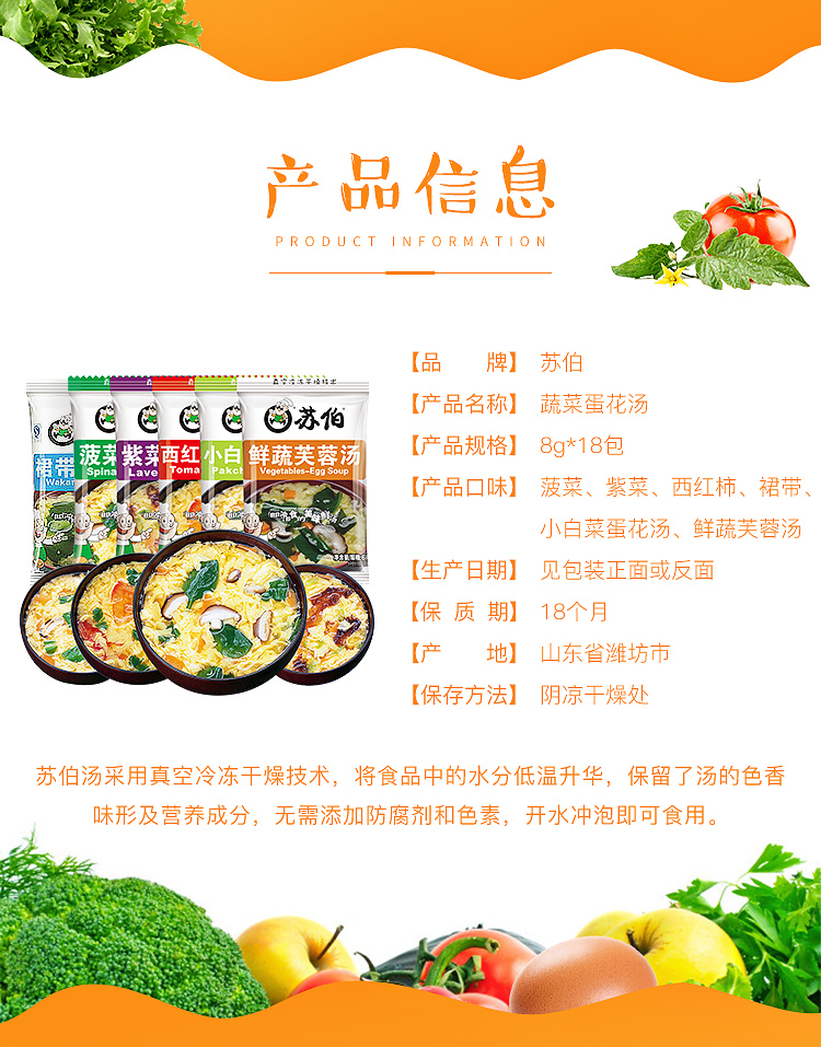 苏伯 礼盒 蛋花汤 6口味(紫菜、番茄、小白菜、裙带、菠菜、鲜蔬芙蓉)冻干速食汤 冲泡即食8g*18