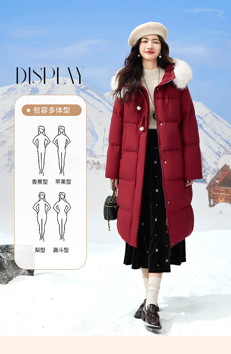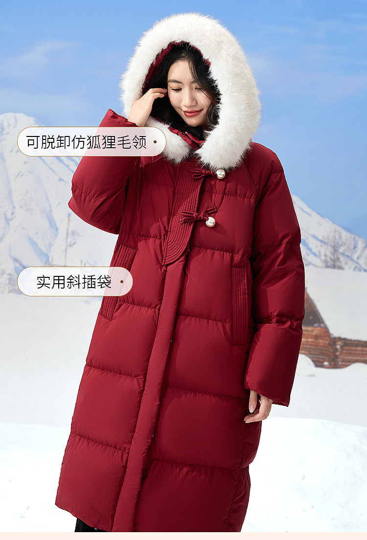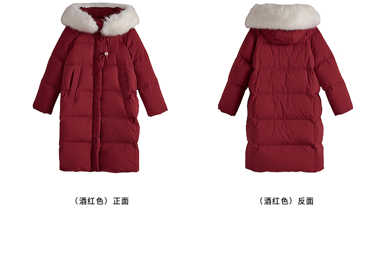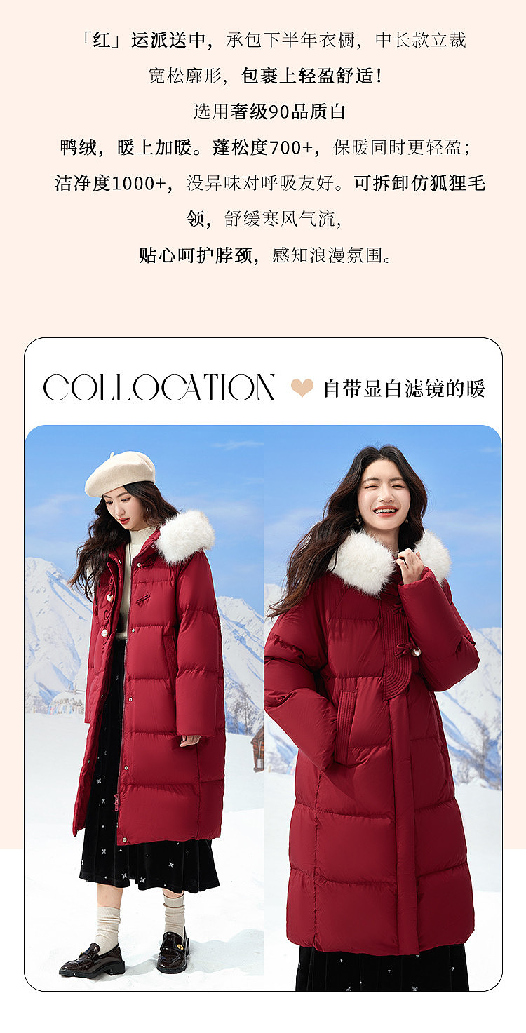 【12/10新品4折】熙世界酒红色羽绒服女中长款冬装可拆卸毛领连帽鸭绒外套圣诞战袍