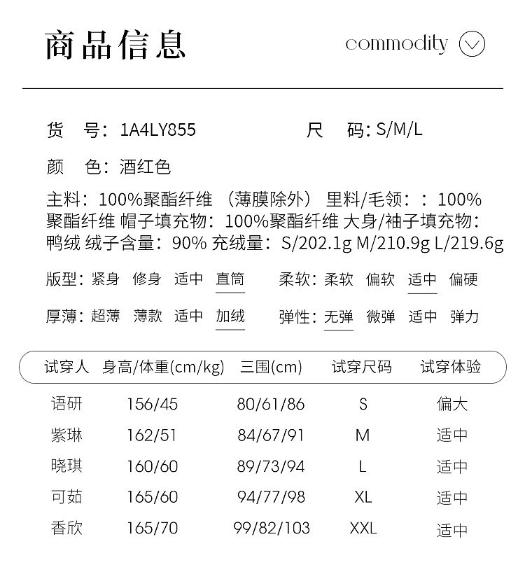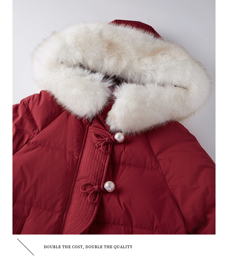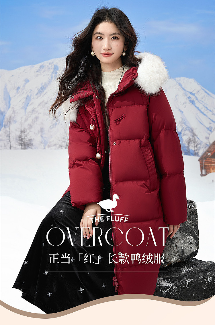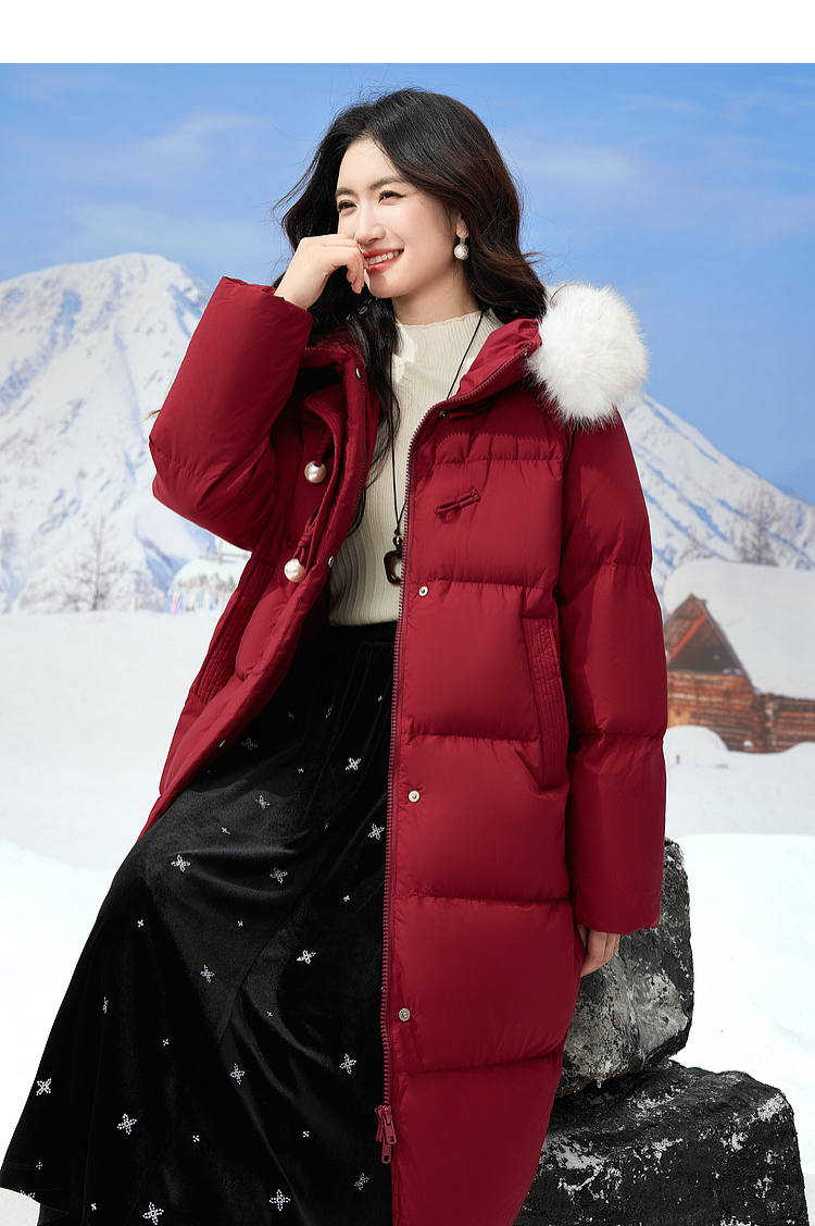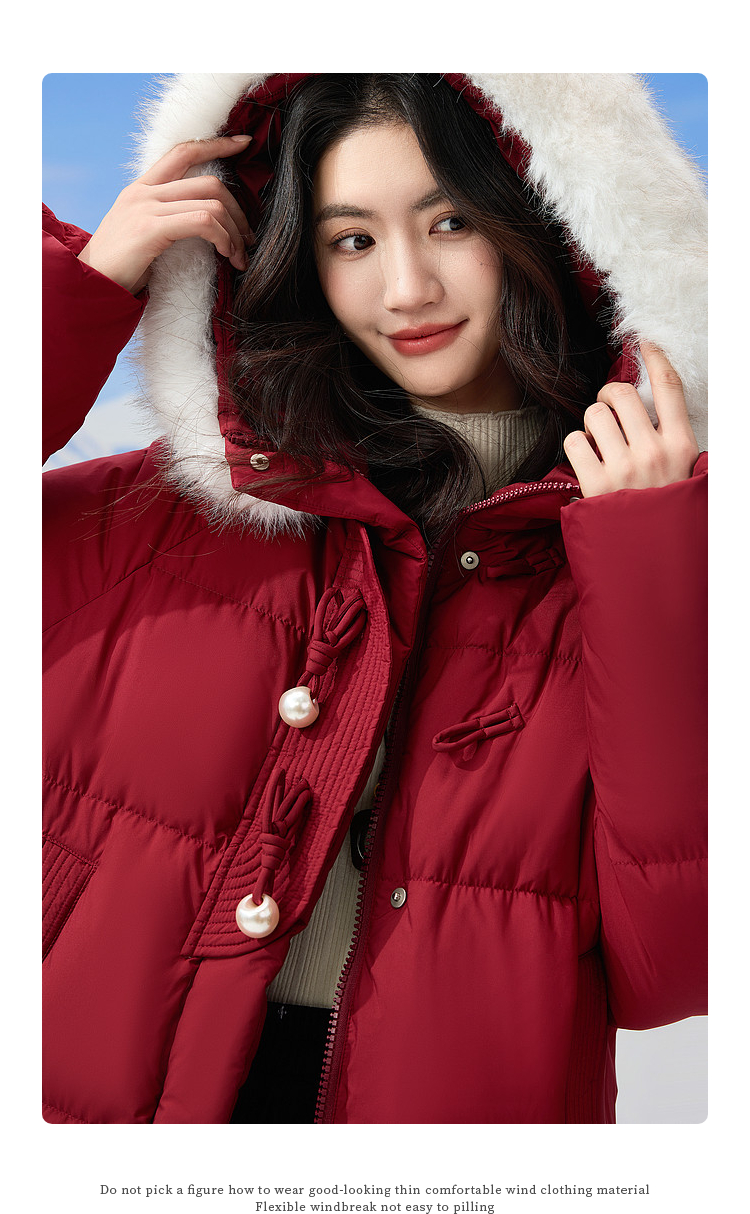 【12/10新品4折】熙世界酒红色羽绒服女中长款冬装可拆卸毛领连帽鸭绒外套圣诞战袍